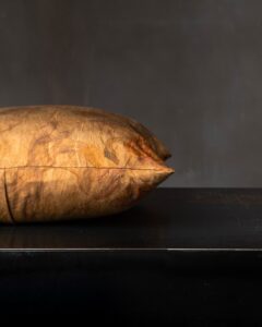 Decorative cushion in cotton and technical fibres. The surface reveals itself smooth and luminous, traversed by a floral motif that emerges with discretion, like a sign suspended in the matter. A light breath moves through the fabric, evoking the quiet of a silent garden.