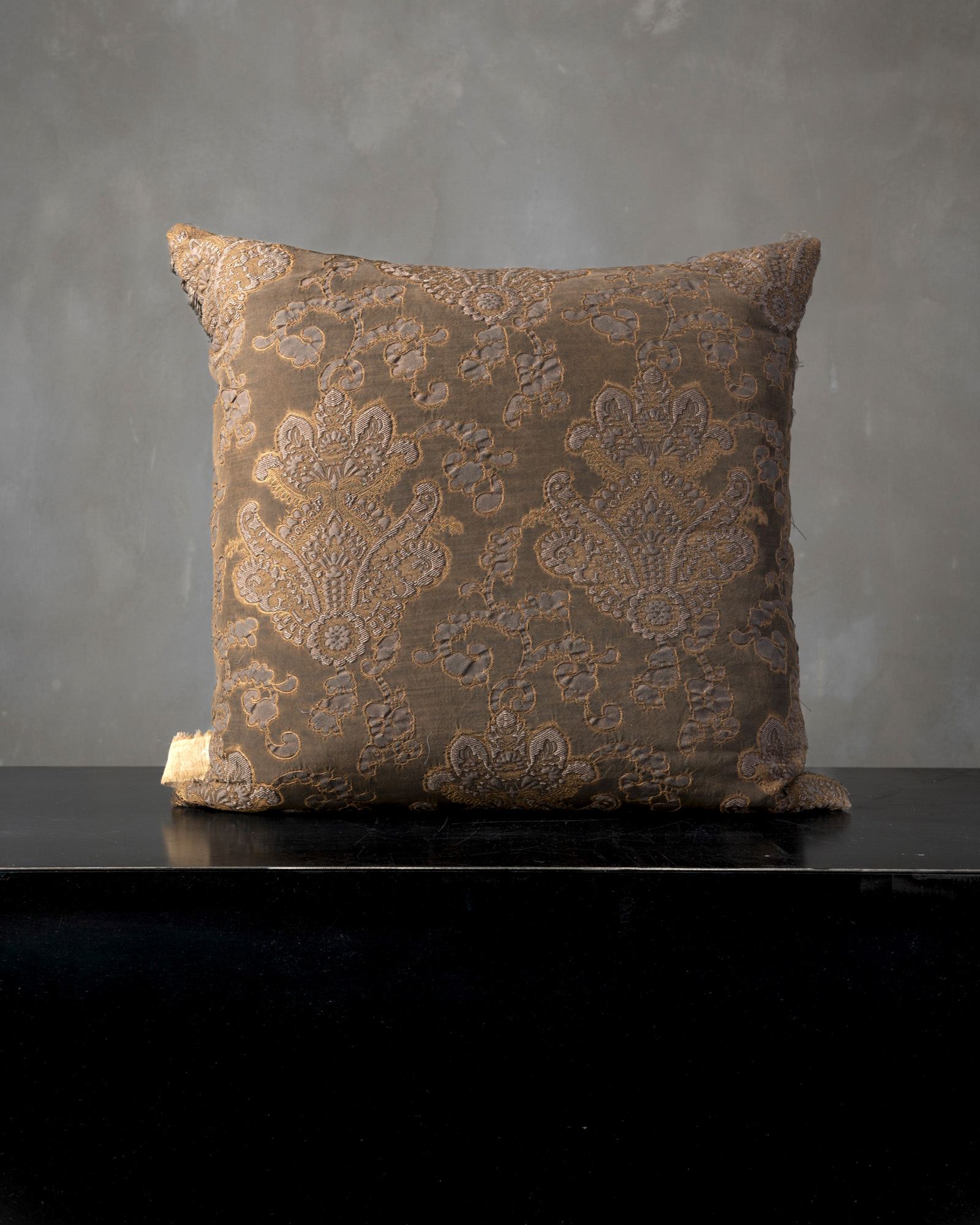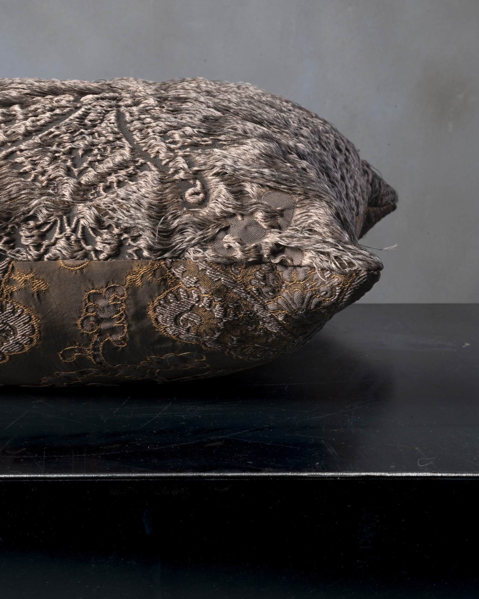 Decorative cushion in viscose. The double surface reveals two complementary souls: on one side a defined pattern, on the other floating bridles that traverse the material with a free rhythm. A subtle balance reminiscent of the sartorial gesture, where order and movement coexist in harmony.