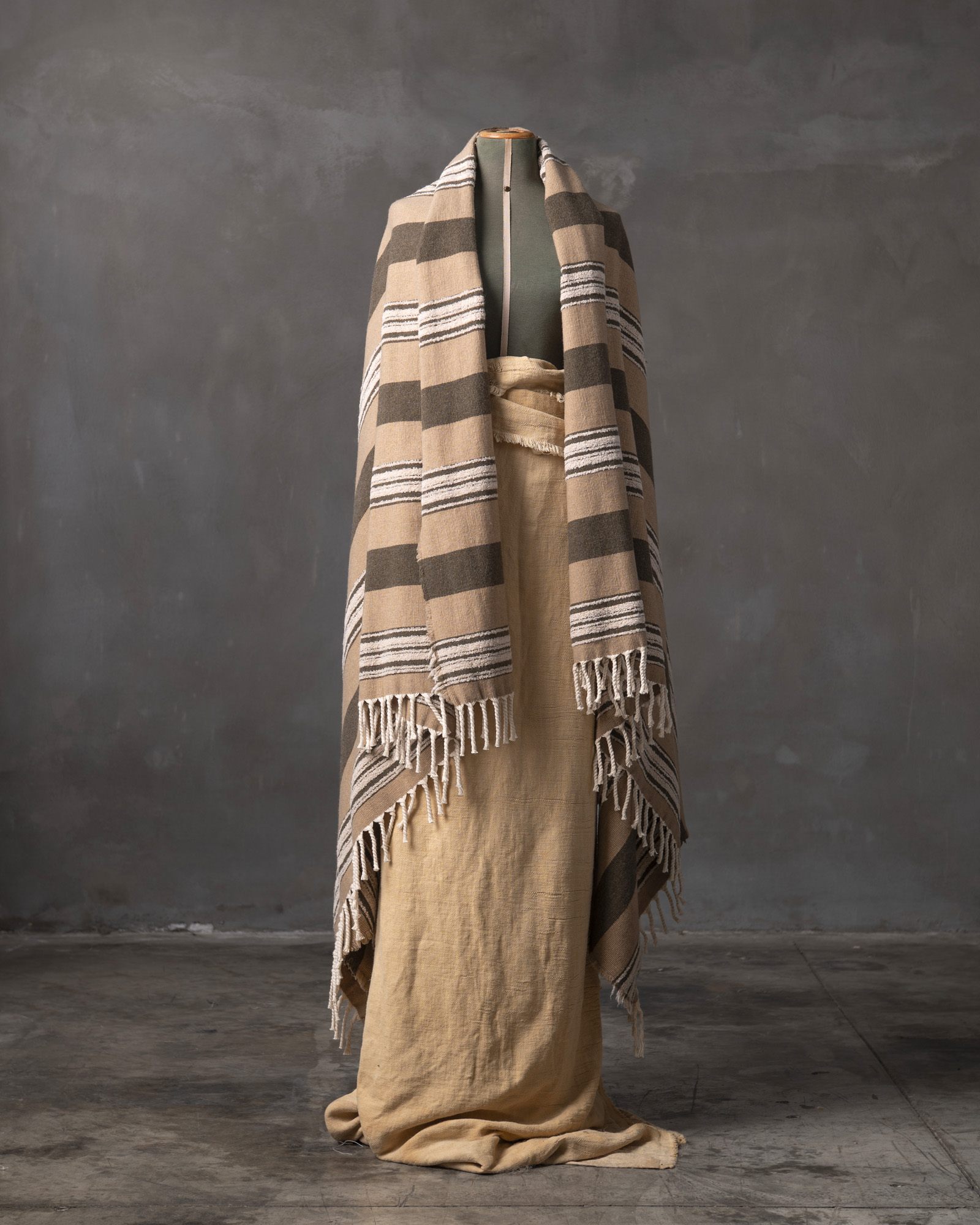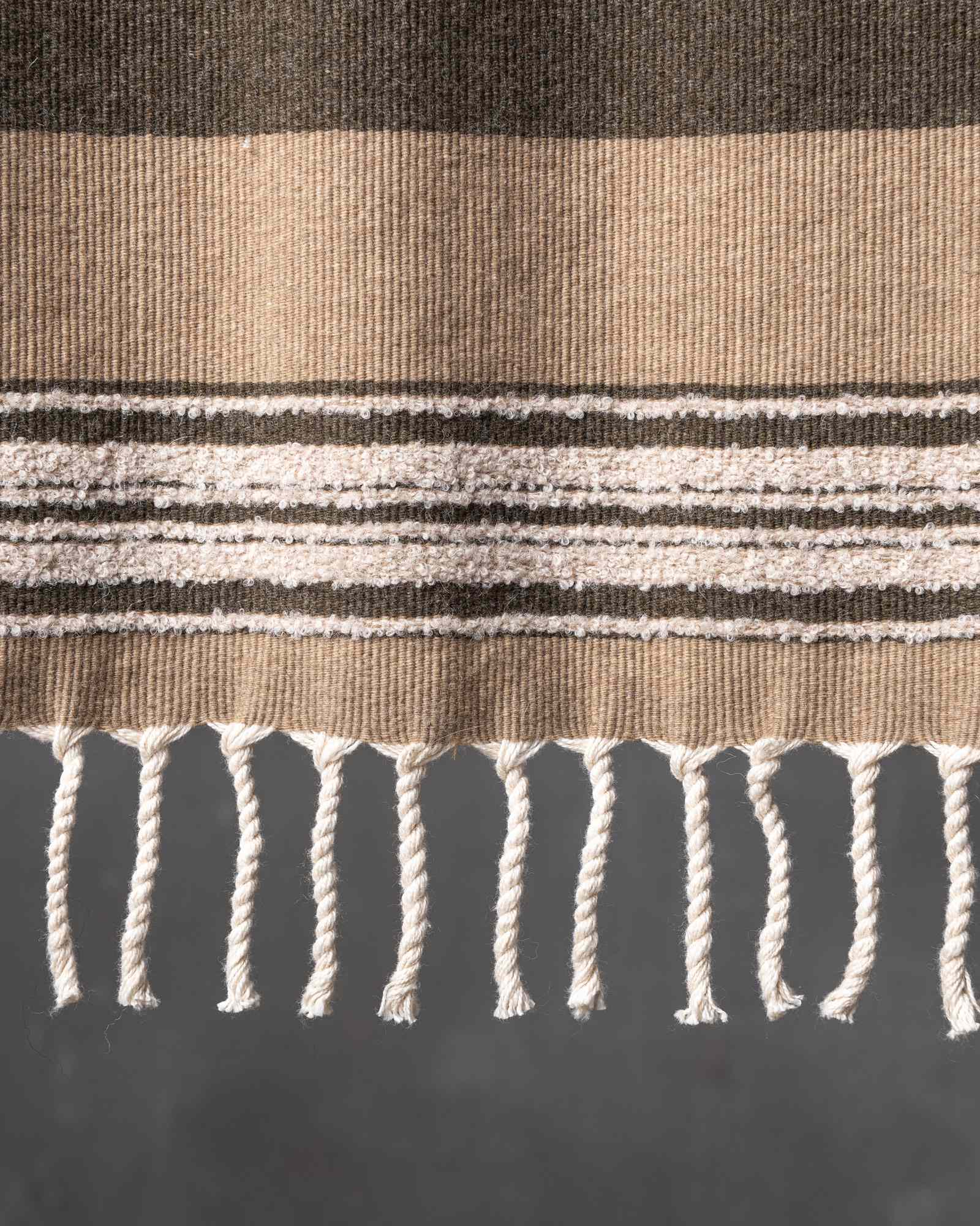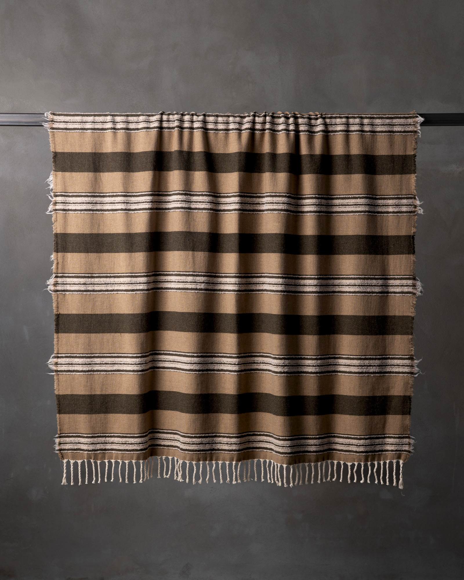 Throw in cotton and wool. The striped motif spreads across the surface with measured rhythm, building a balance between structure and material softness. Continuous lines move through the fabric, like a regular flow that envelops the space with a warm and composed presence.