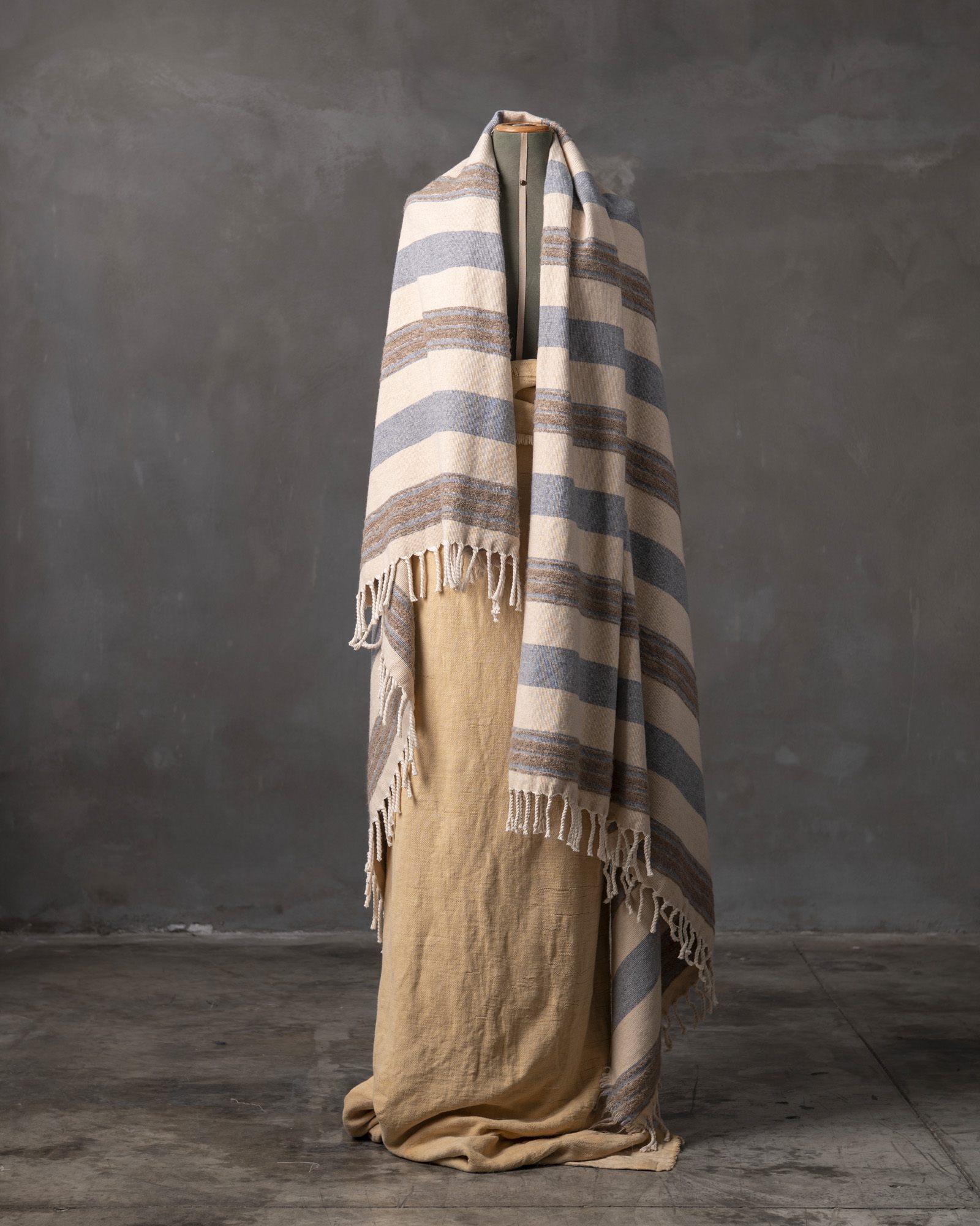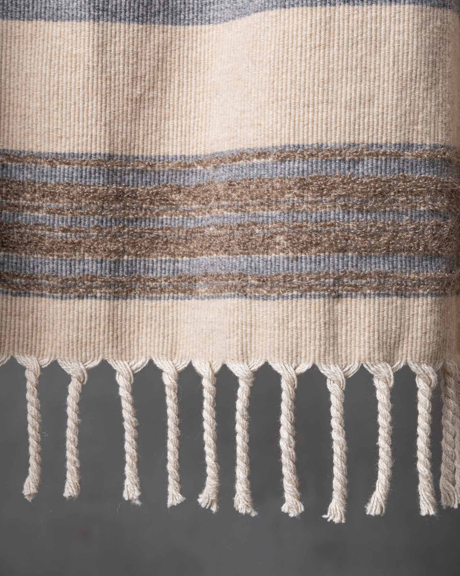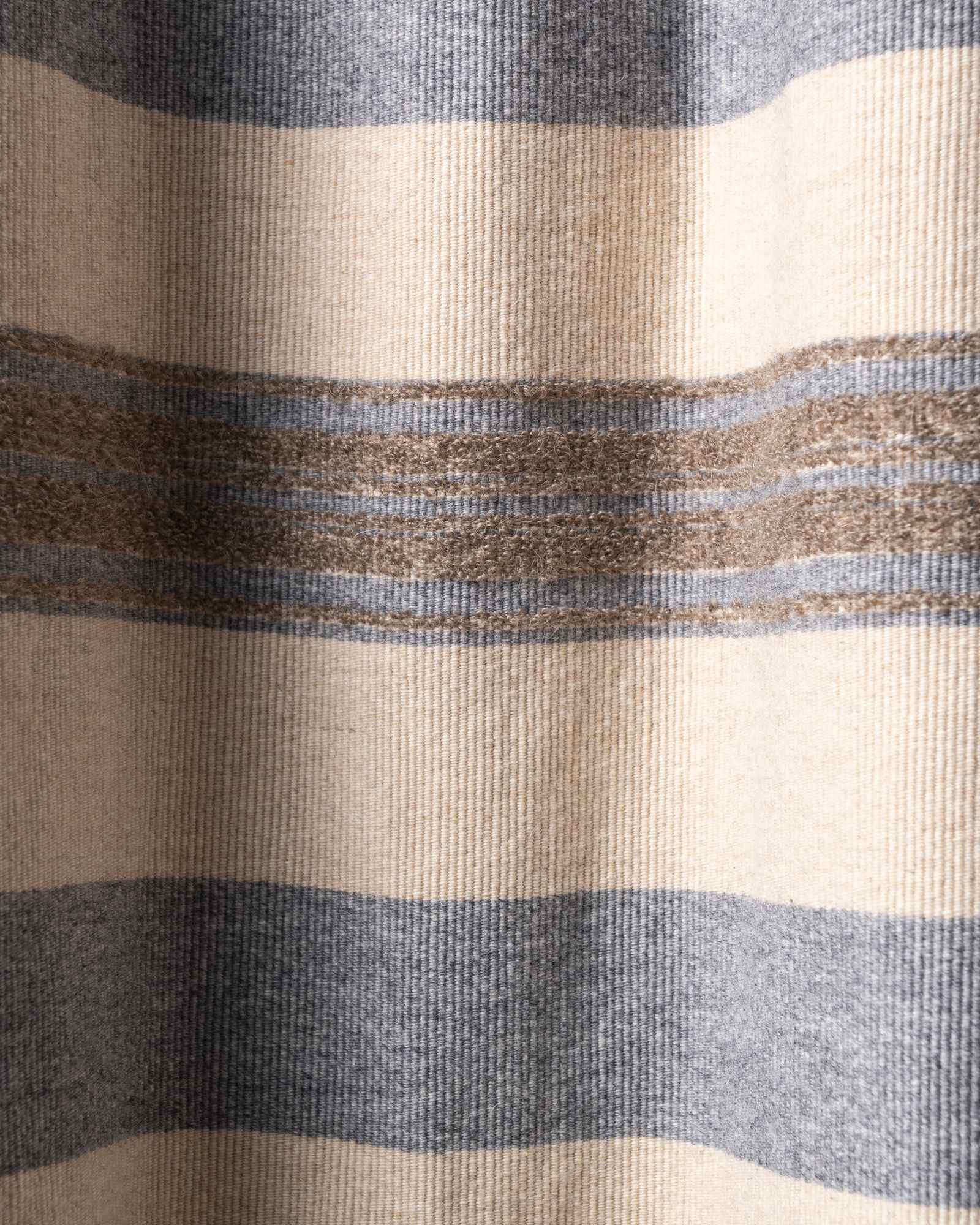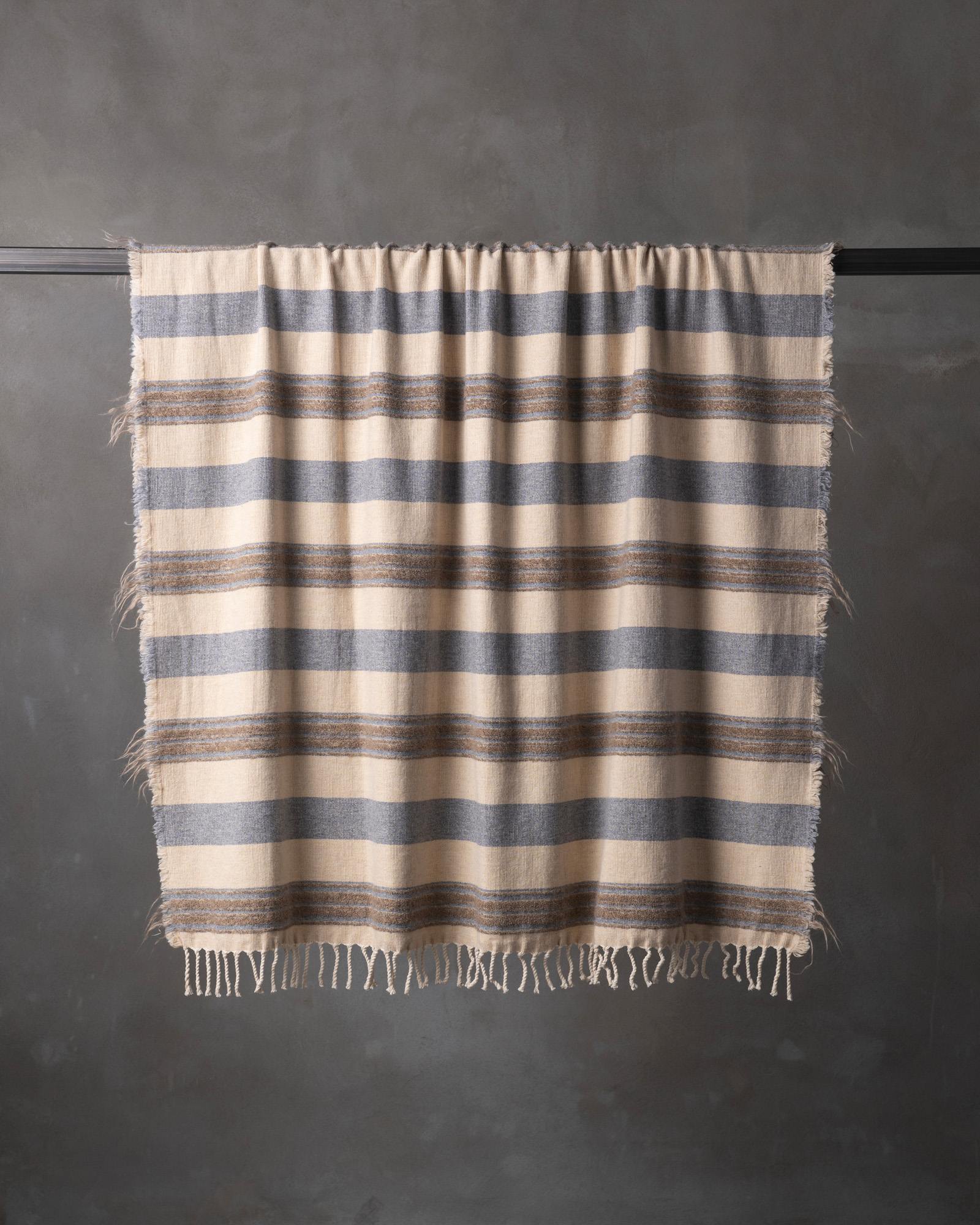 Throw in cotton and wool. The striped motif spreads across the surface with measured rhythm, building a balance between structure and material softness. Continuous lines move through the fabric, like a regular flow that envelops the space with a warm and composed presence.