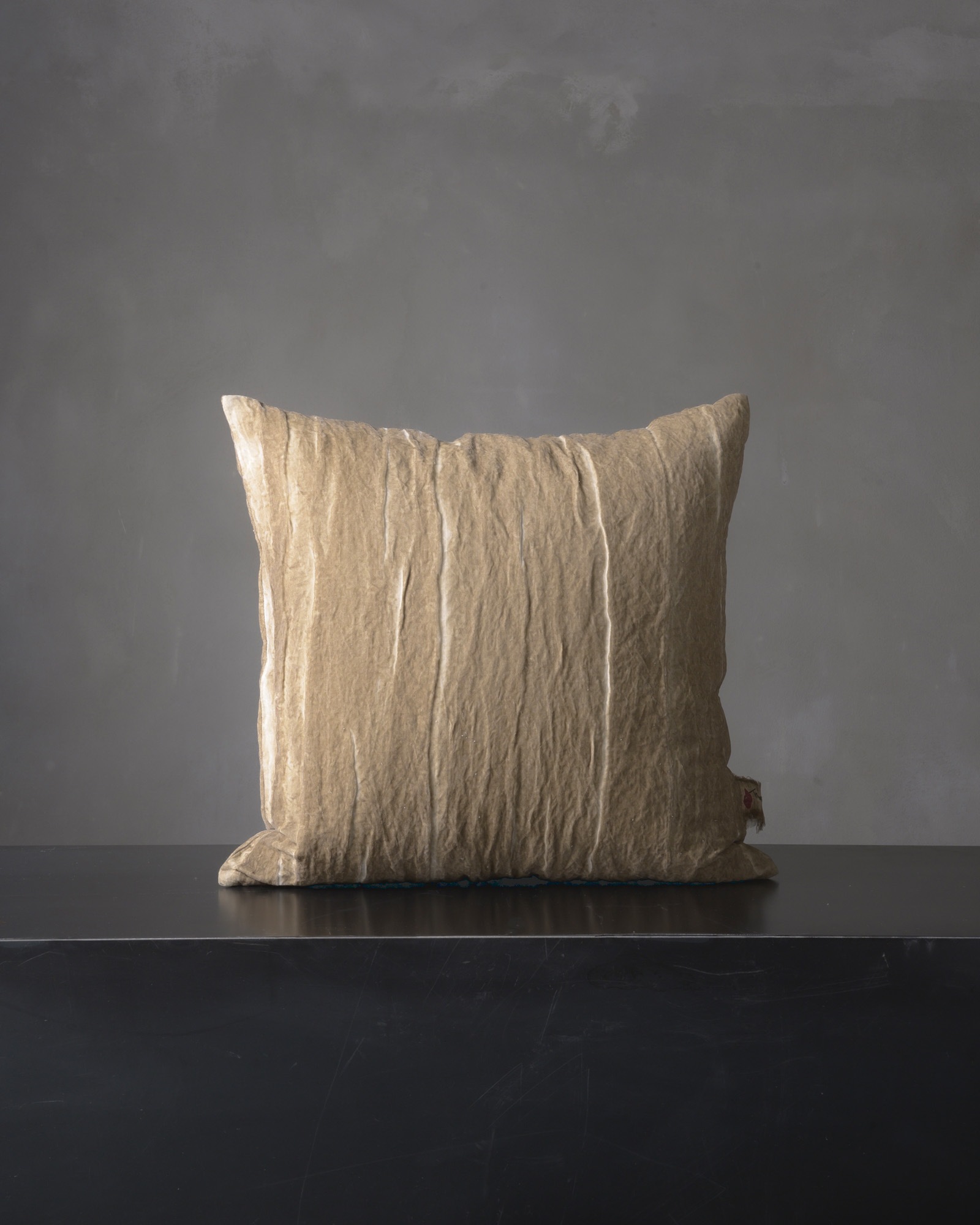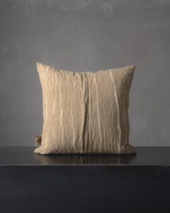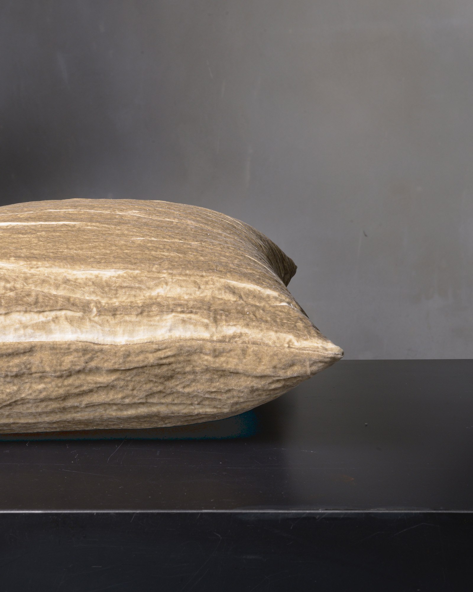 Decorative cushion in cotton and metallic fibres. The wave-like texture moves across the surface with irregular movements, holding the light in continuous vibration. A living material that ripples like a landscape in transformation, where every fold holds an unexpected reflection.