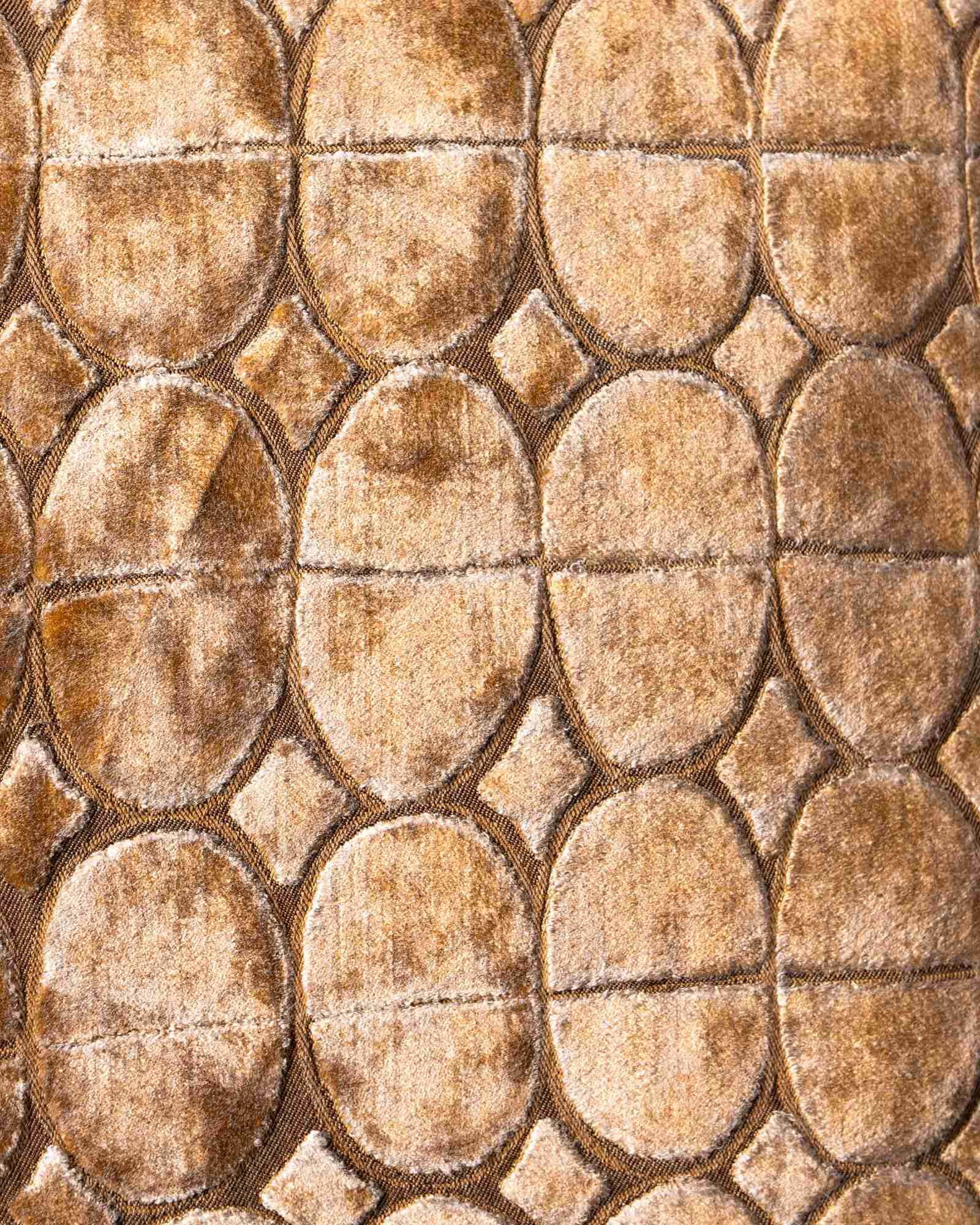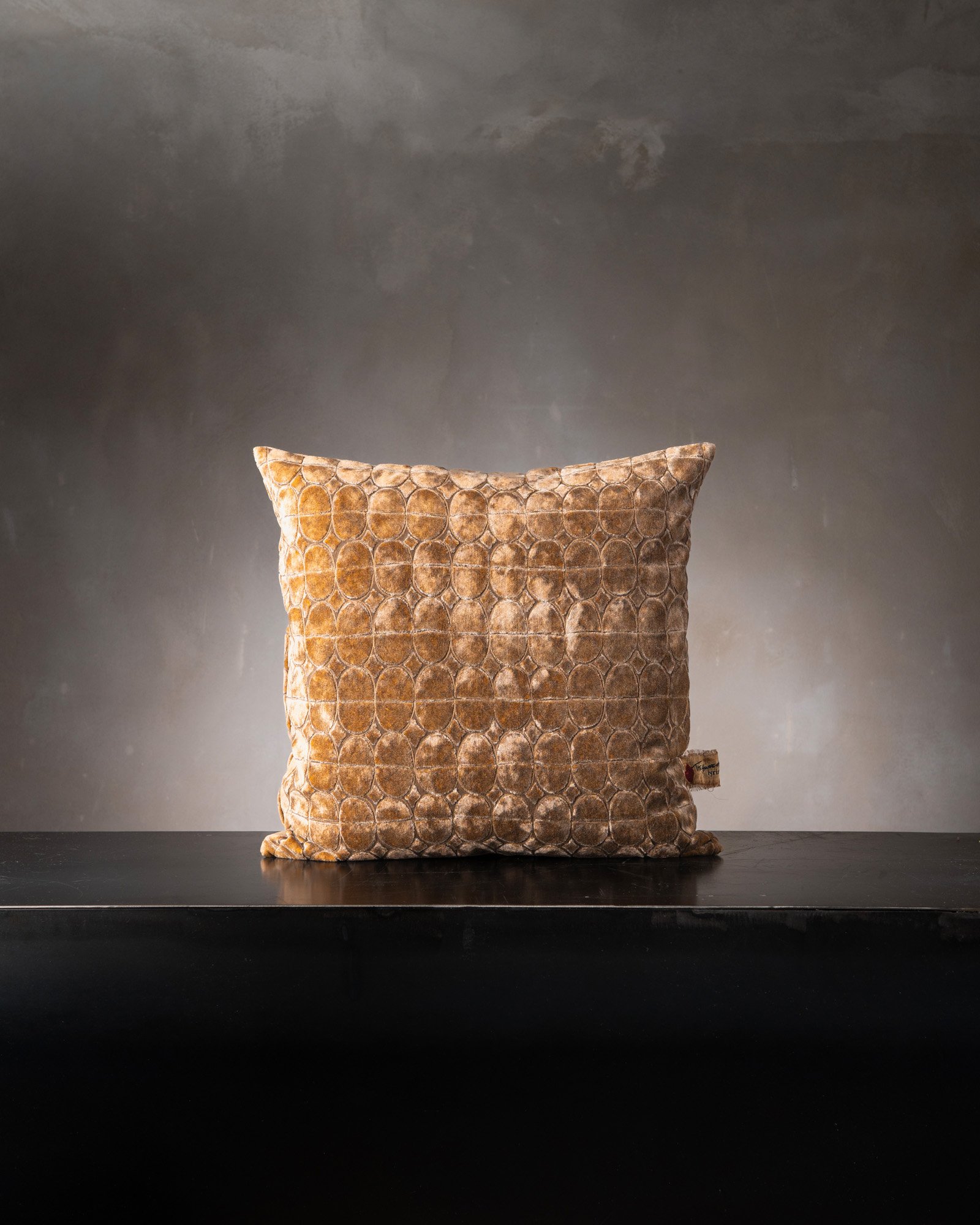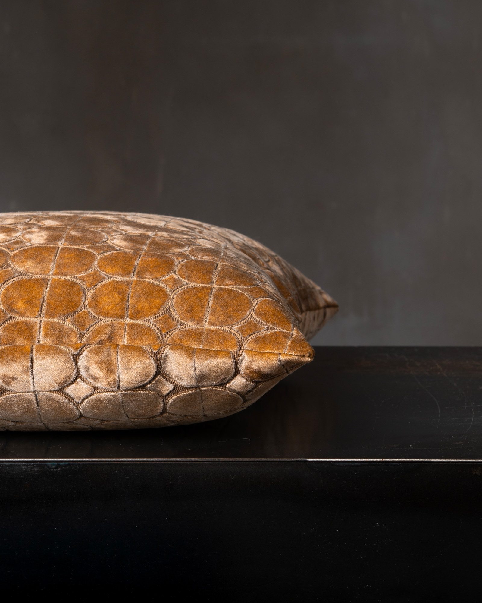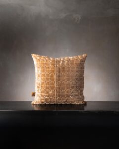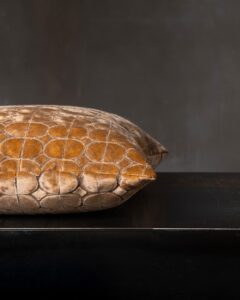 Decorative cushion in viscose and cotton. The jacquard velvet builds a deep surface, where reflections move with intensity and rhythm. Light slides across the material as if on a silent scene, revealing a presence that changes with every glance.
