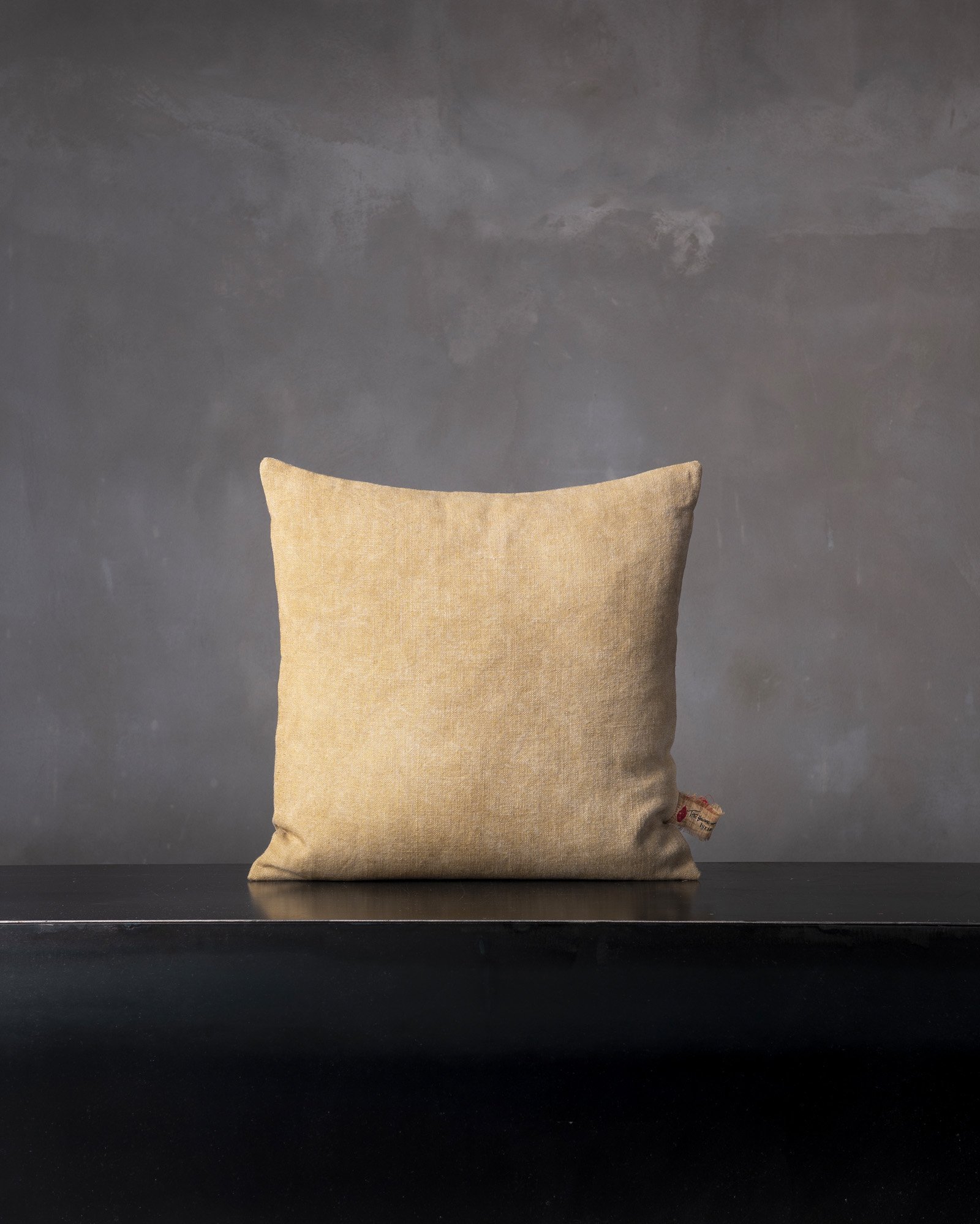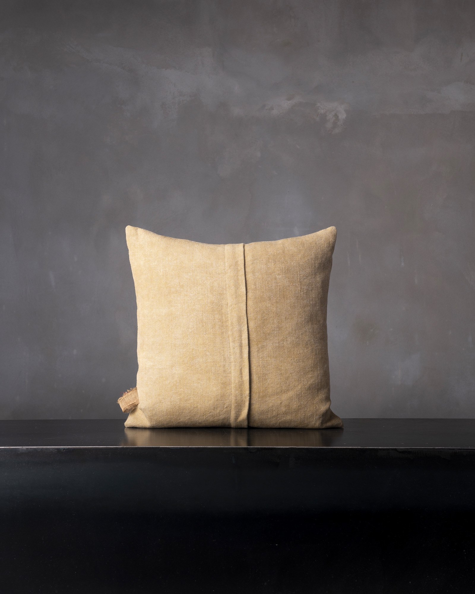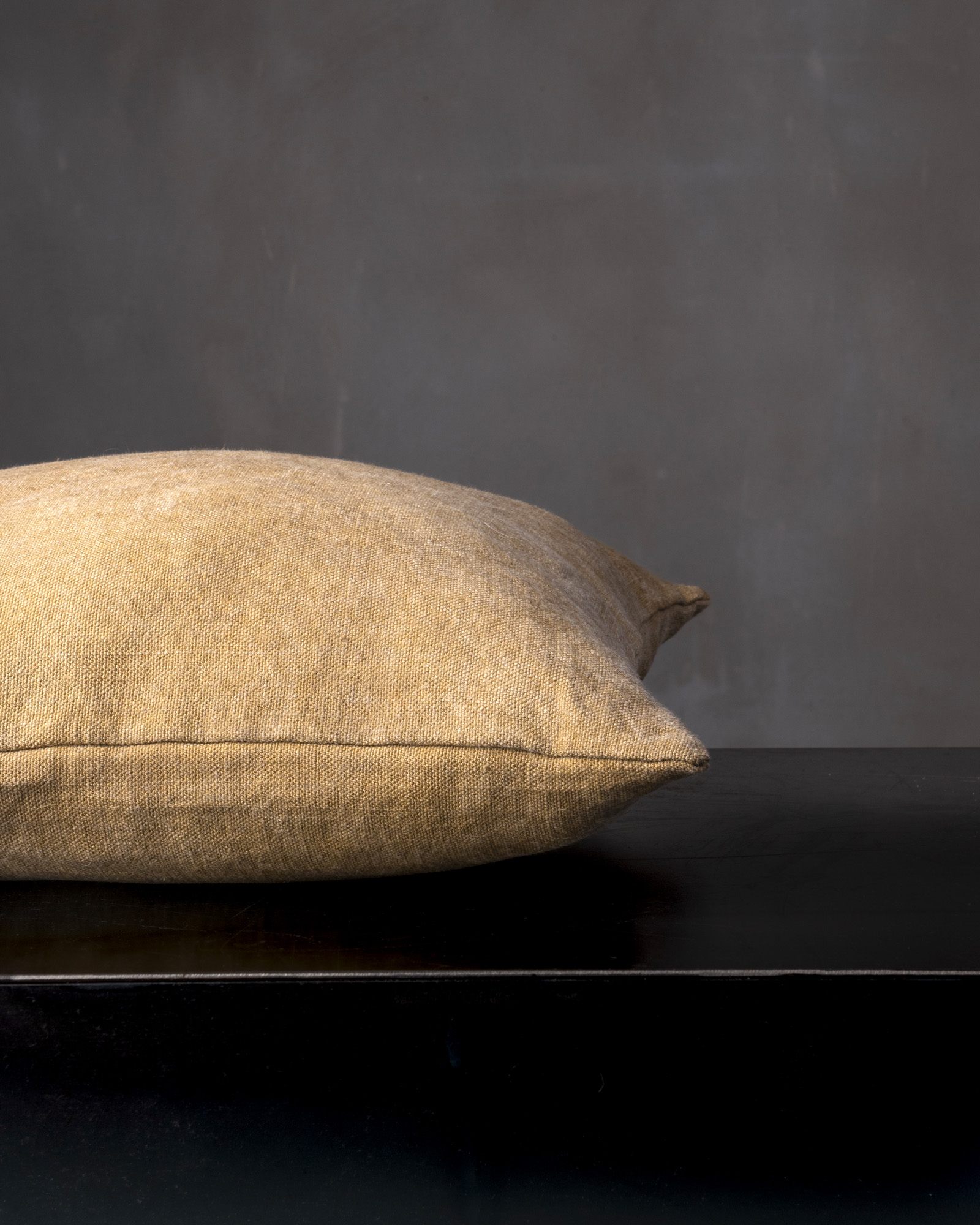 Decorative cushion in linen. The authentic texture of the fibre expresses an essential beauty, made of irregularities and living matter that allows itself to be observed in its purity. A discreet and sincere presence, like a fragment of nature inhabiting the space with silent harmony.