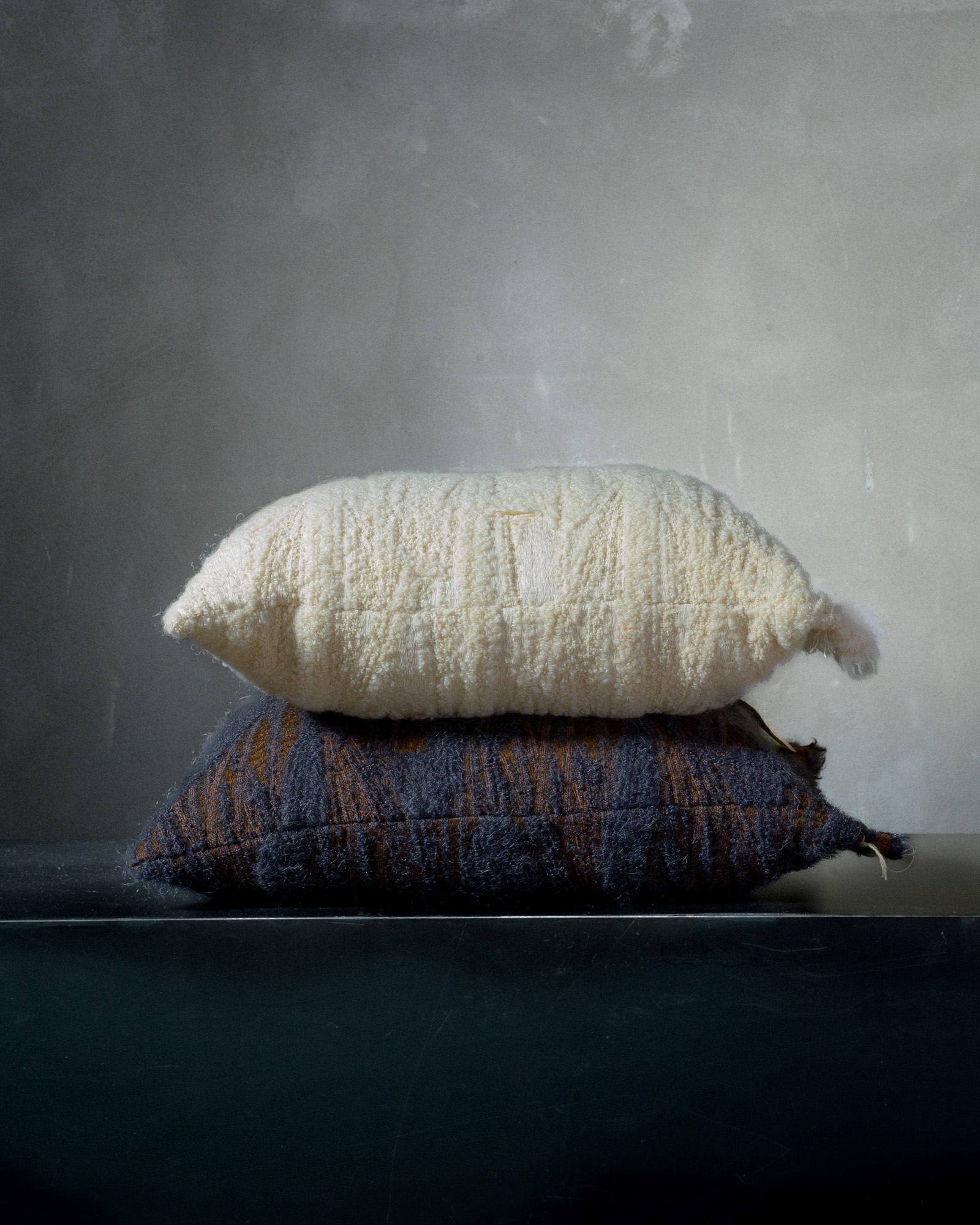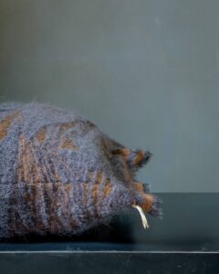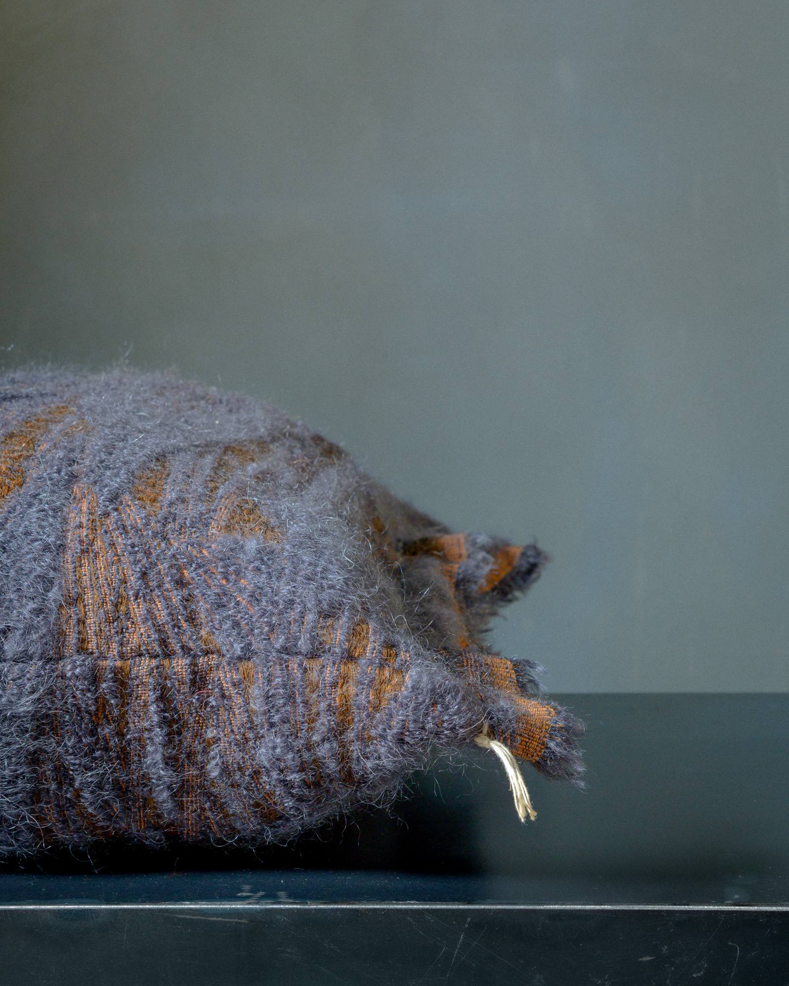 Decorative cushion in mohair. The airy jacquard amplifies the softness of the yarn, building a plush and enveloping surface where the material seems to expand into space. A light veil settles on the fabric, like an impalpable presence that ignites the atmosphere with silent elegance.