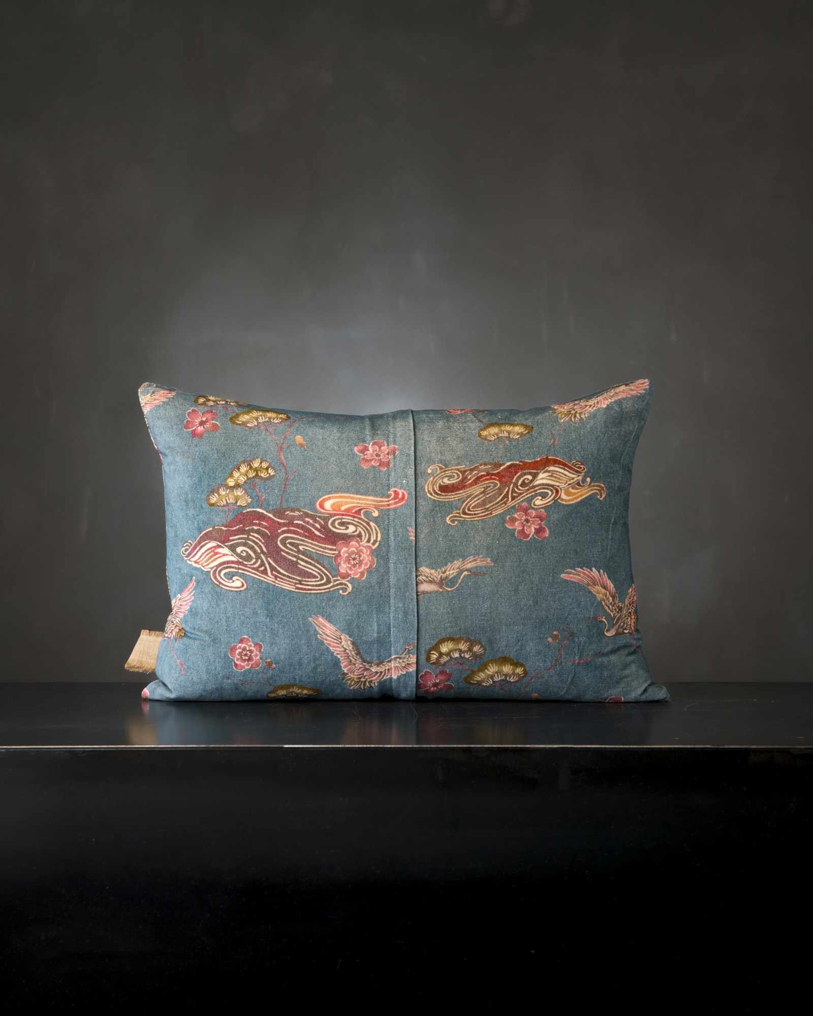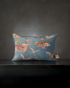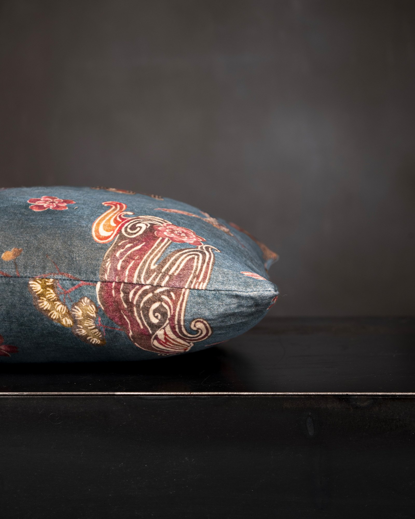 Decorative cushion in cotton and linen. The dialogue between velvet and natural weave creates a rich and measured material contrast, where different surfaces meet in a refined balance. Signs inspired by distant imaginaries surface in the fabric, like visions that emerge slowly between light and shadow.