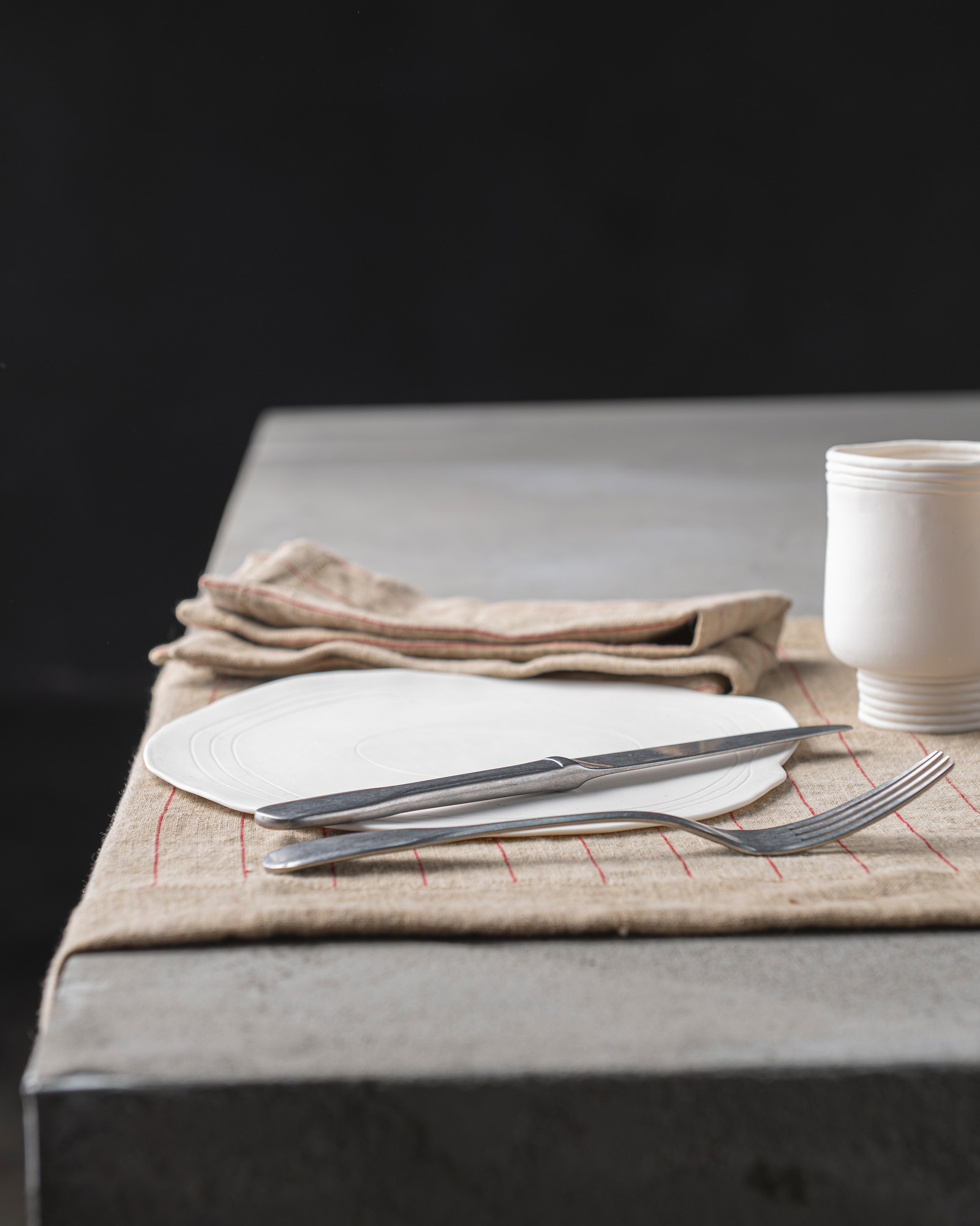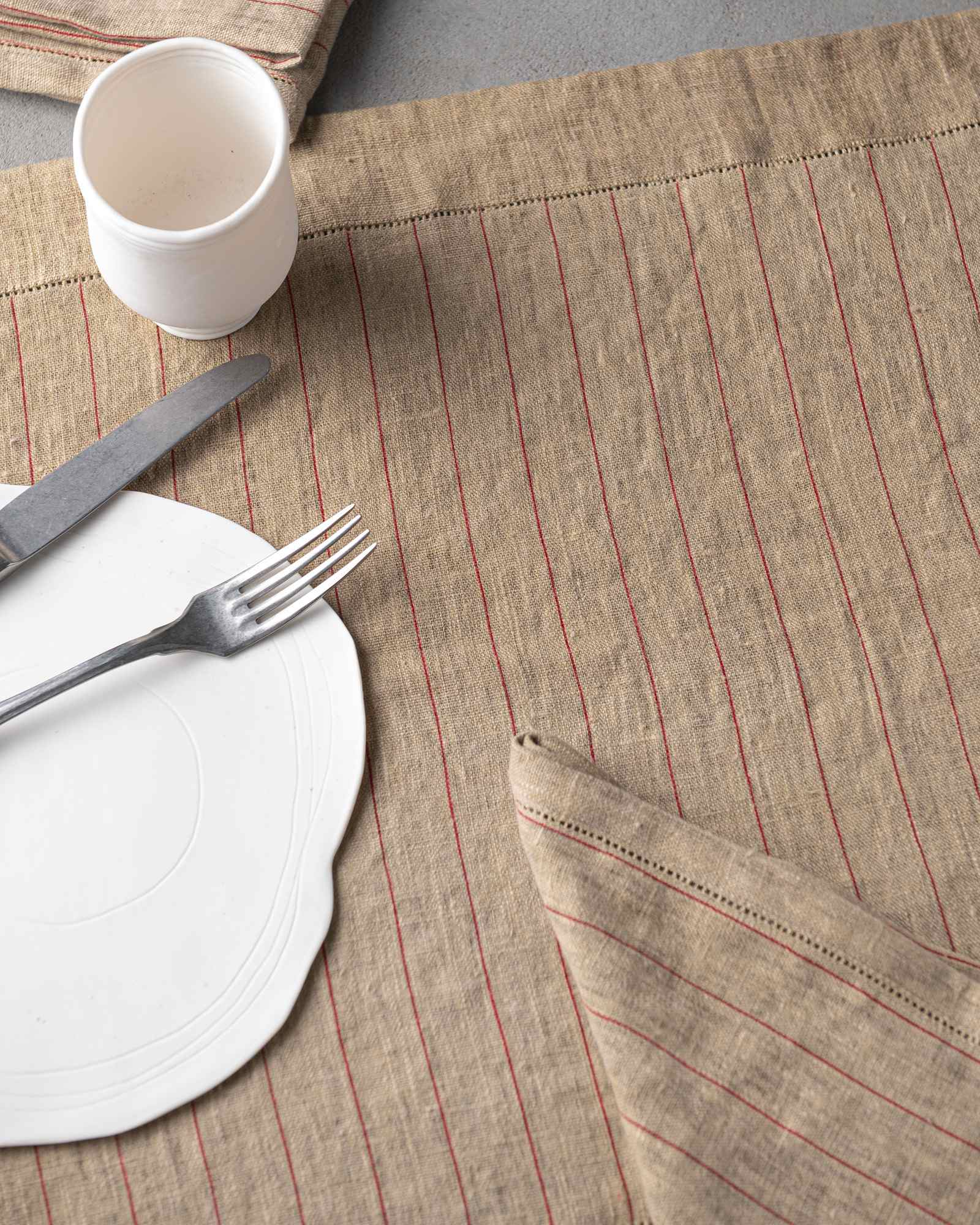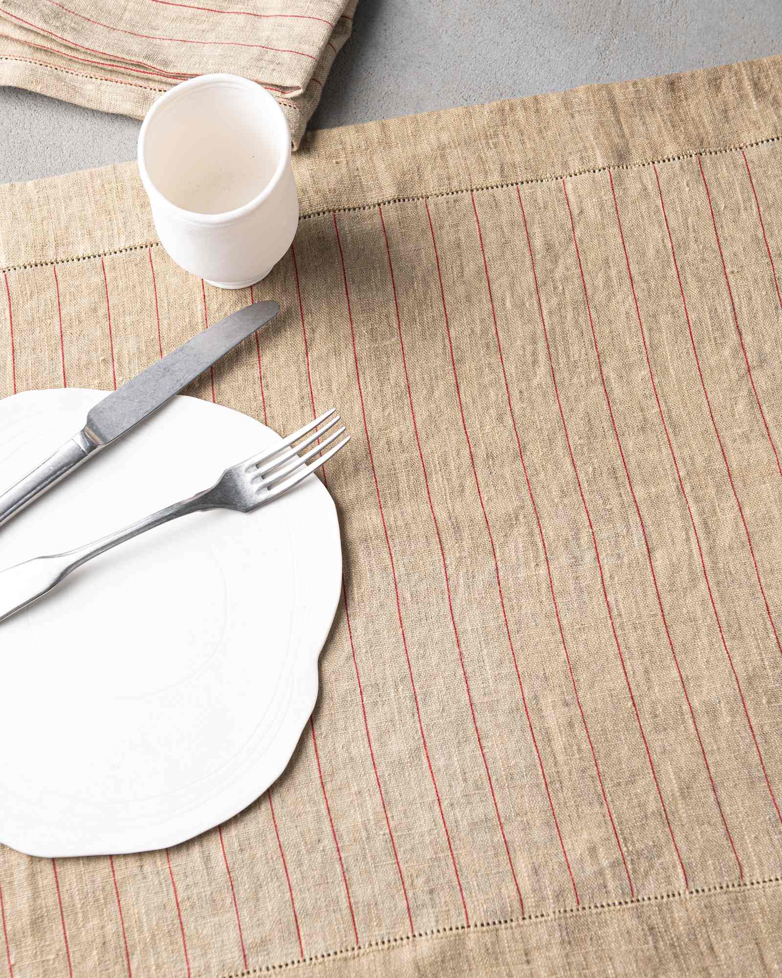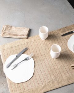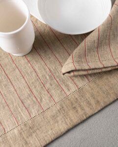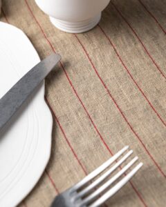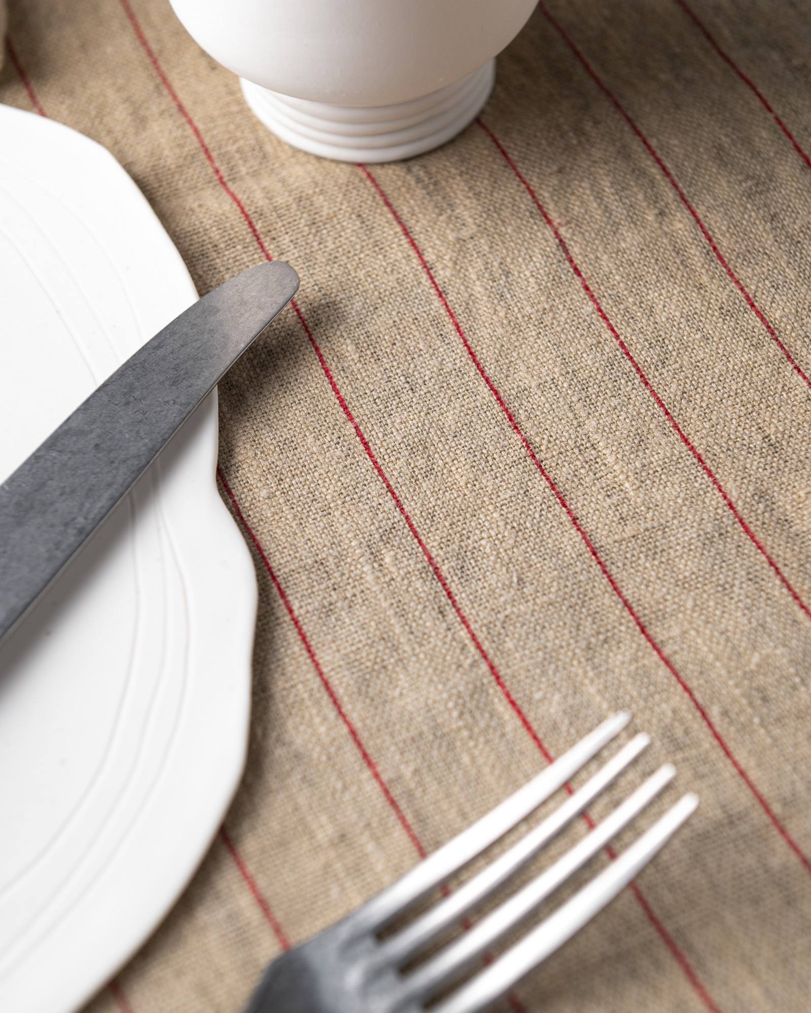 Table runner in linen. The rich weave develops across a compact surface, where subtle lines emerge with discreet rhythm and natural continuity. Light marks move through the fabric like a silent heartbeat, creating an essential presence that unites balance and delicacy.
