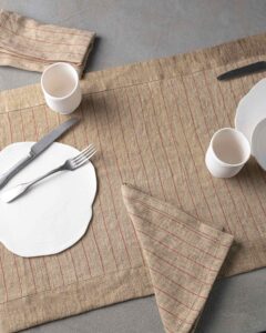 Napkin in linen. The rich weave develops across a compact surface, where subtle lines emerge with discreet rhythm and natural continuity. Light marks move through the fabric like a silent heartbeat, creating an essential presence that unites balance and delicacy.