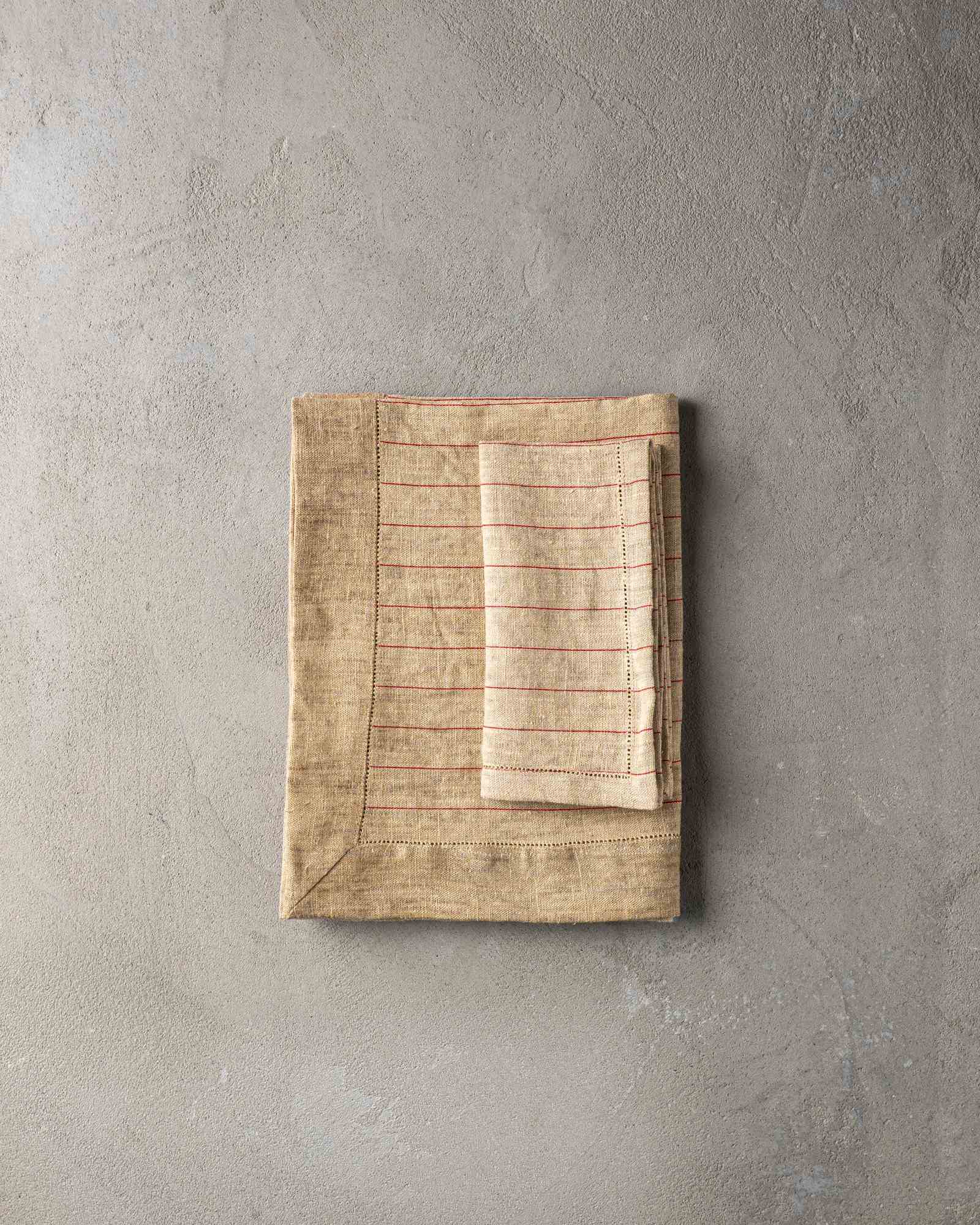 Napkin in linen. The rich weave develops across a compact surface, where subtle lines emerge with discreet rhythm and natural continuity. Light marks move through the fabric like a silent heartbeat, creating an essential presence that unites balance and delicacy.