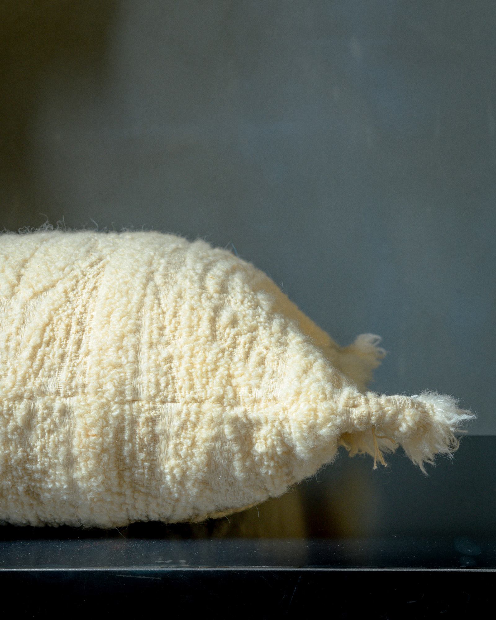 Decorative cushion in wool. The material jacquard pattern emerges with decisiveness, building a surface where reliefs define themselves with depth and rhythm. The material surfaces with natural intensity, like an incised mark that gives form to a strong and measured presence.