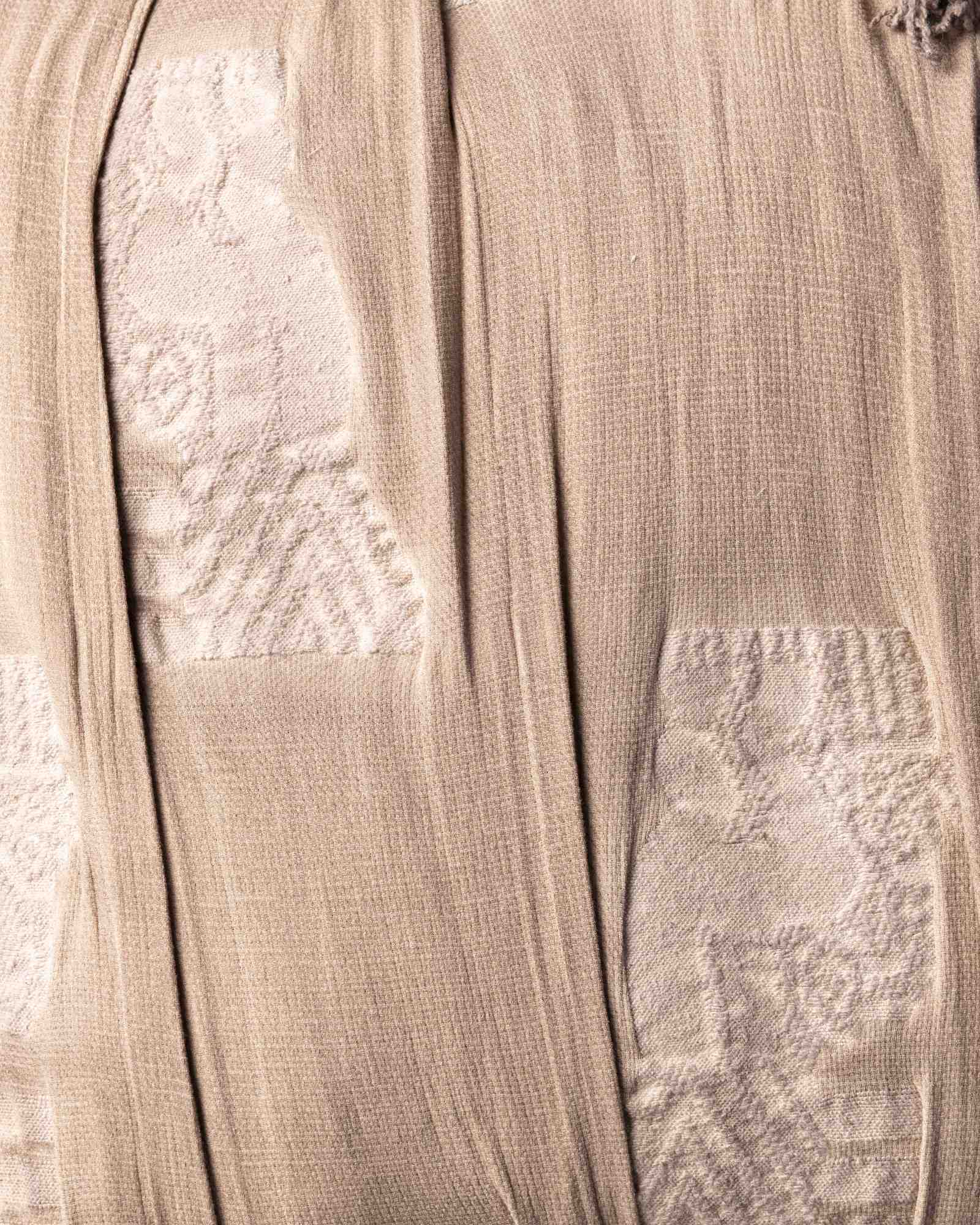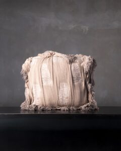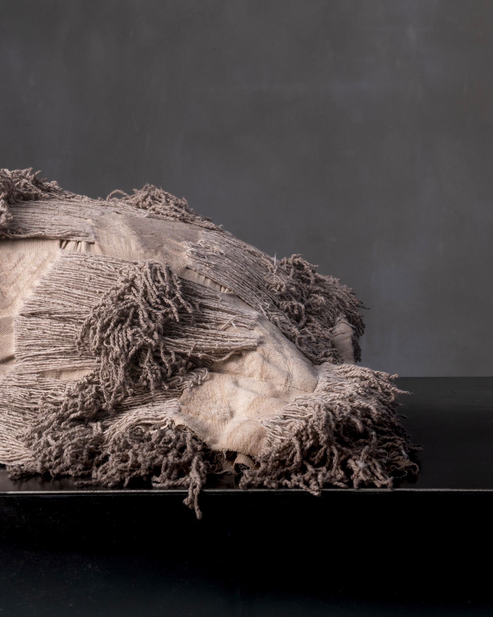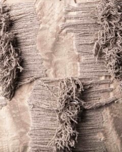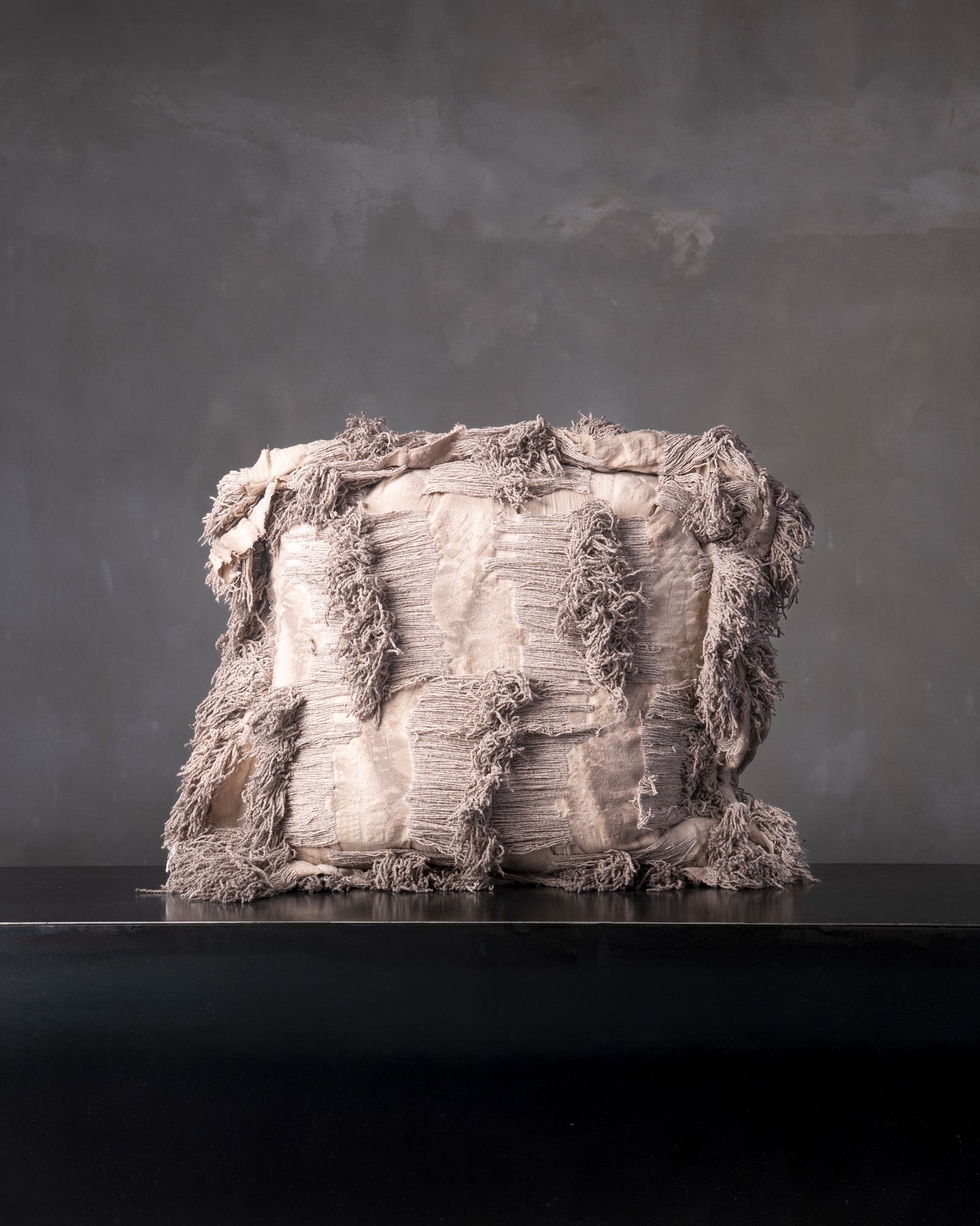 Decorative cushion in virgin wool. The material texture develops with depth and structure, giving life to a rich and articulated surface that expresses a decisive character. An organic landscape takes shape in the weave, like a material that slowly models itself under the sign of time.