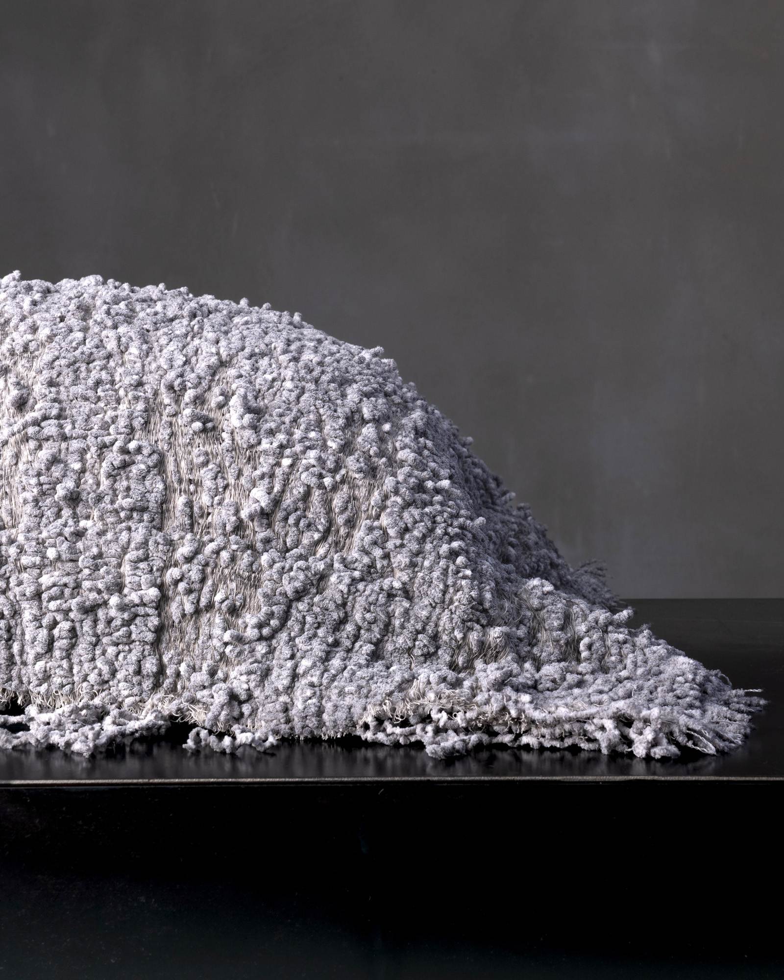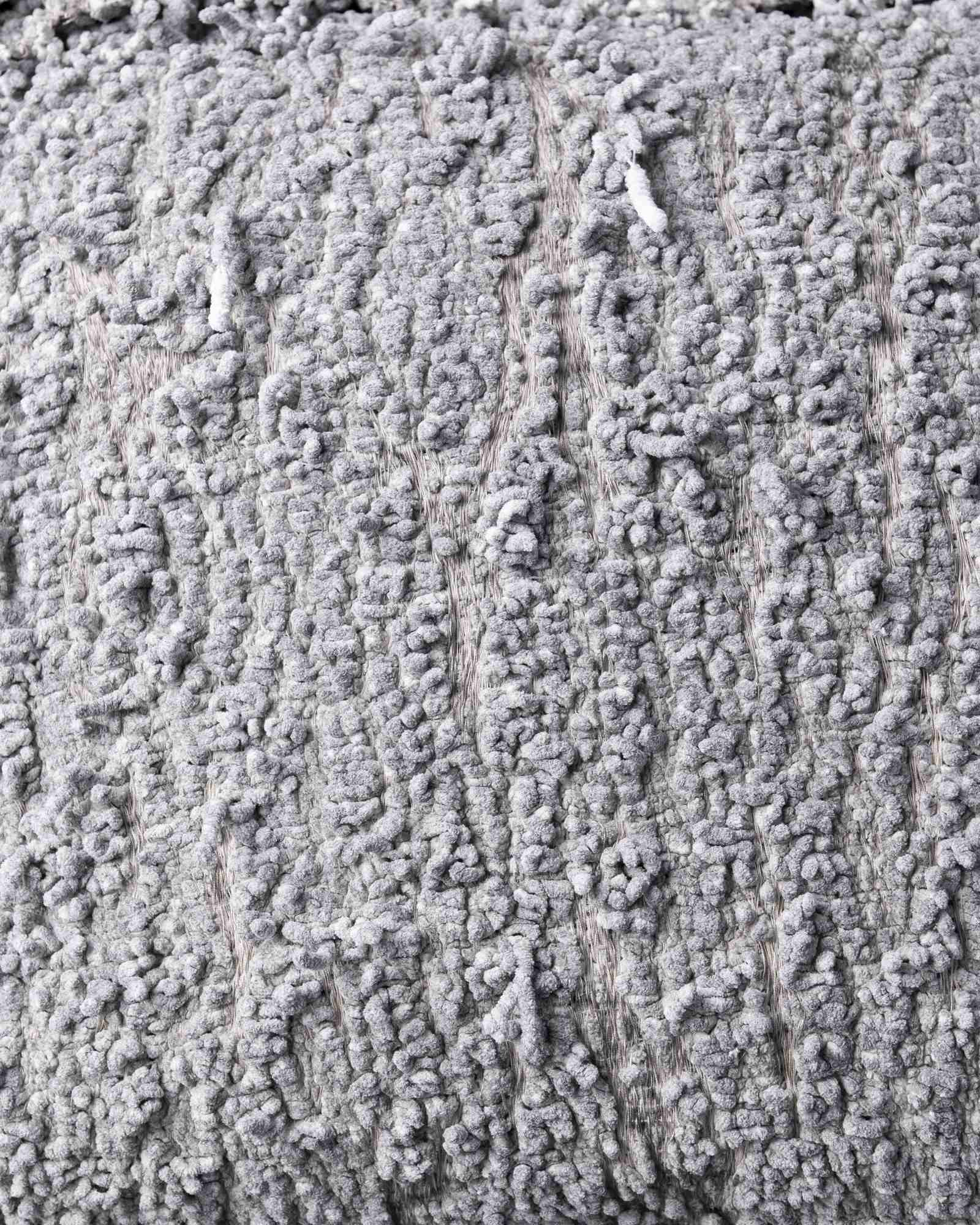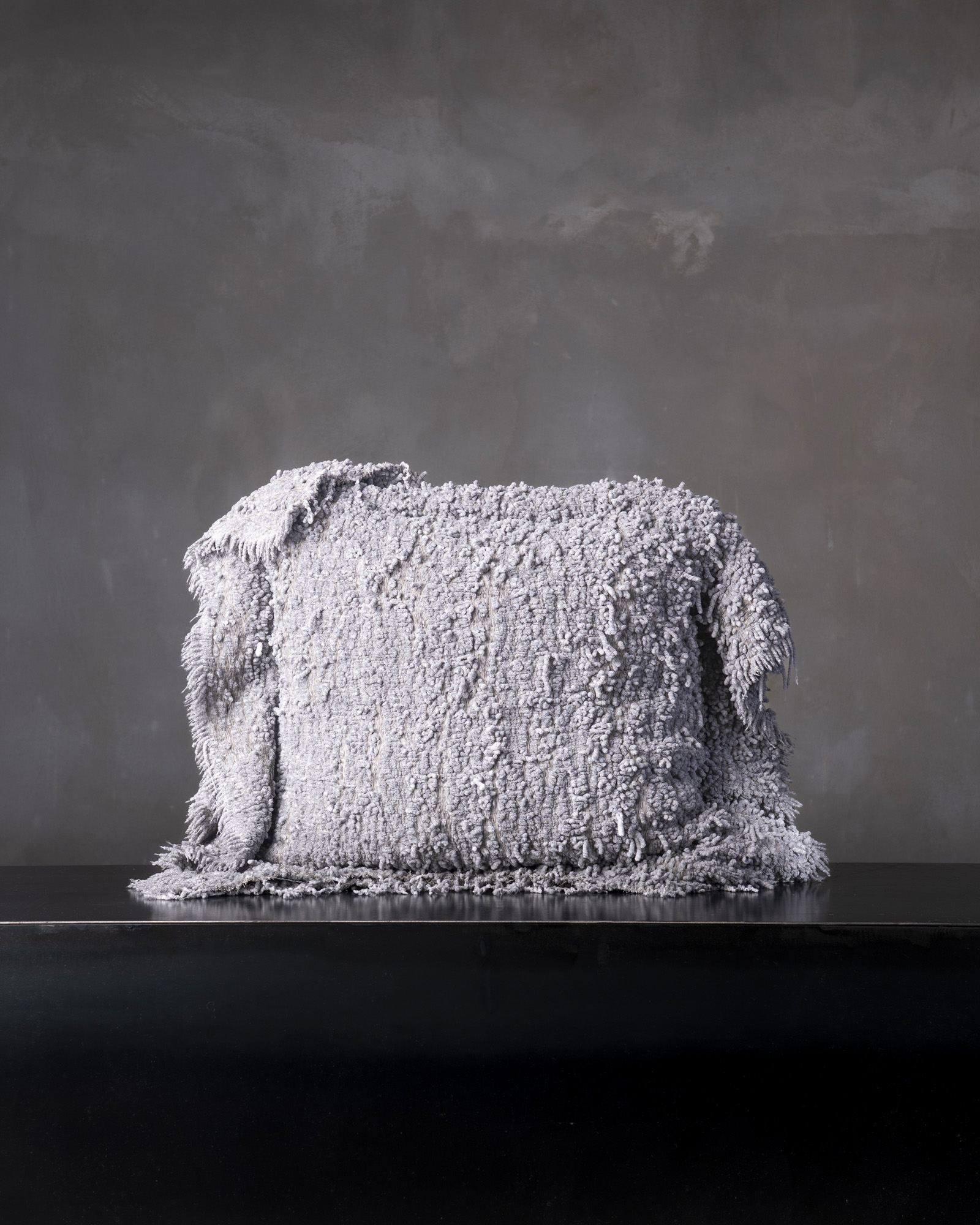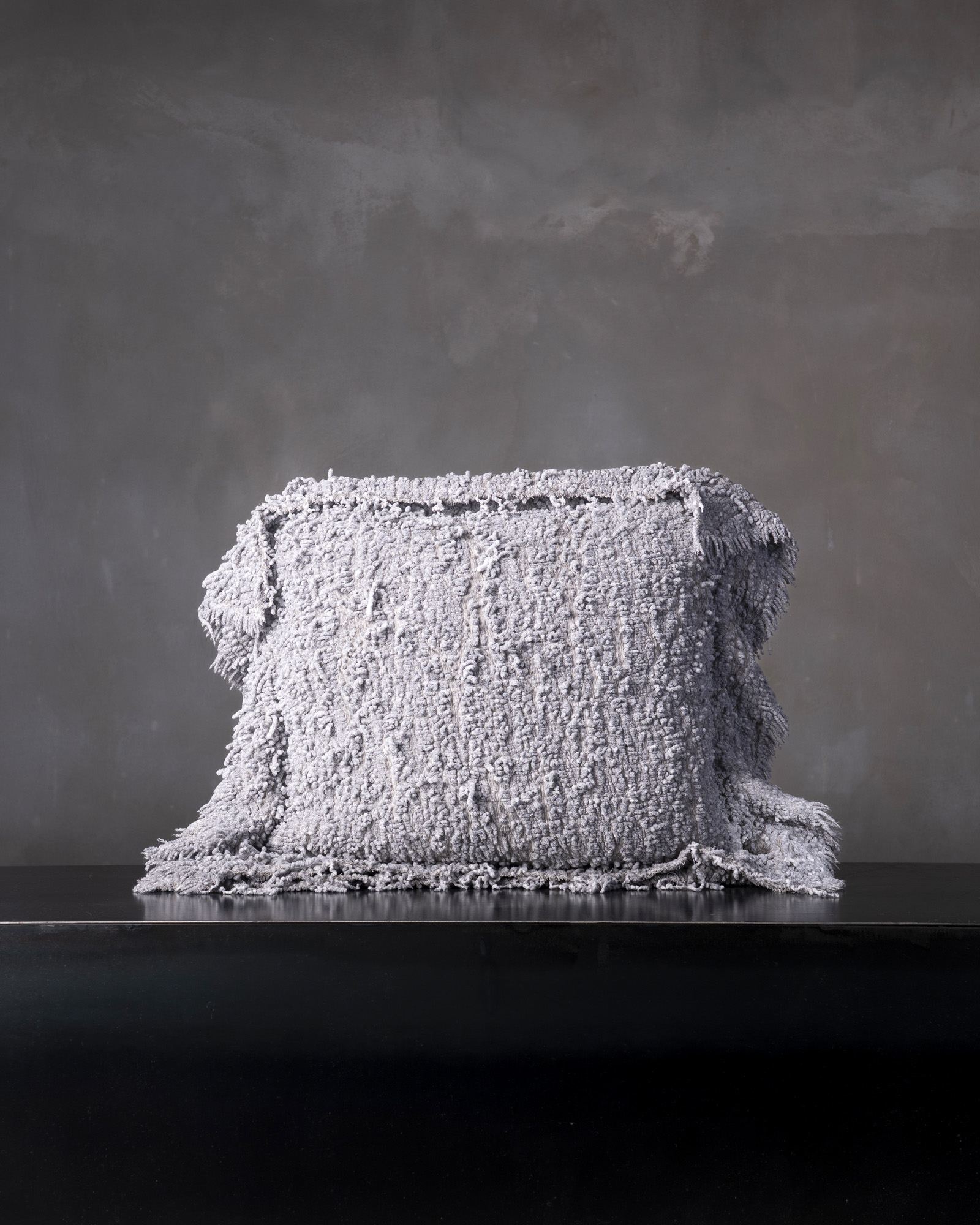 Decorative cushion in polyester. The compact surface defines itself through a decisive structure, where the material organises itself in a balanced and contemporary presence. A deep weave moves through the fabric, like a silent trace that evokes the essential force of the earth.
