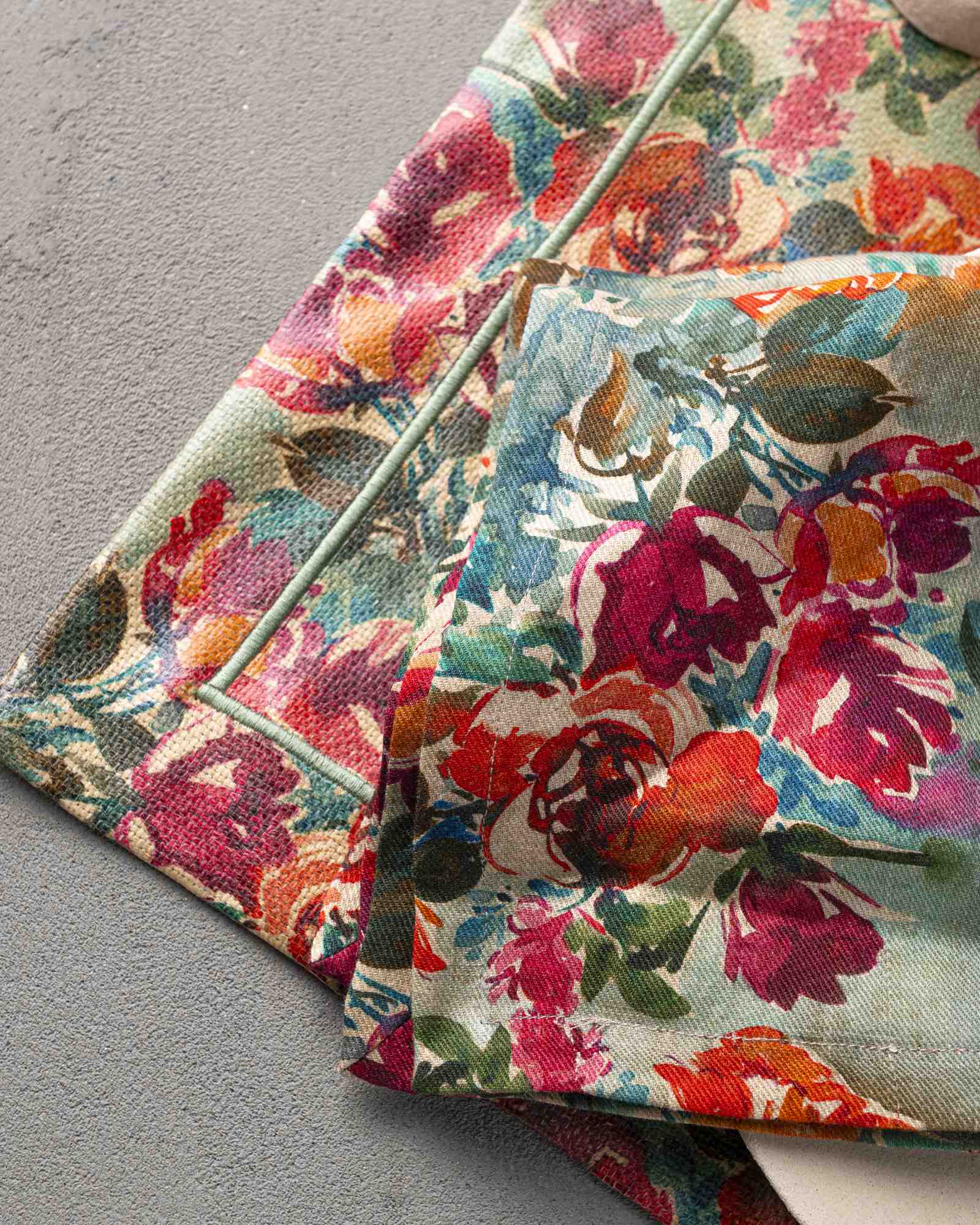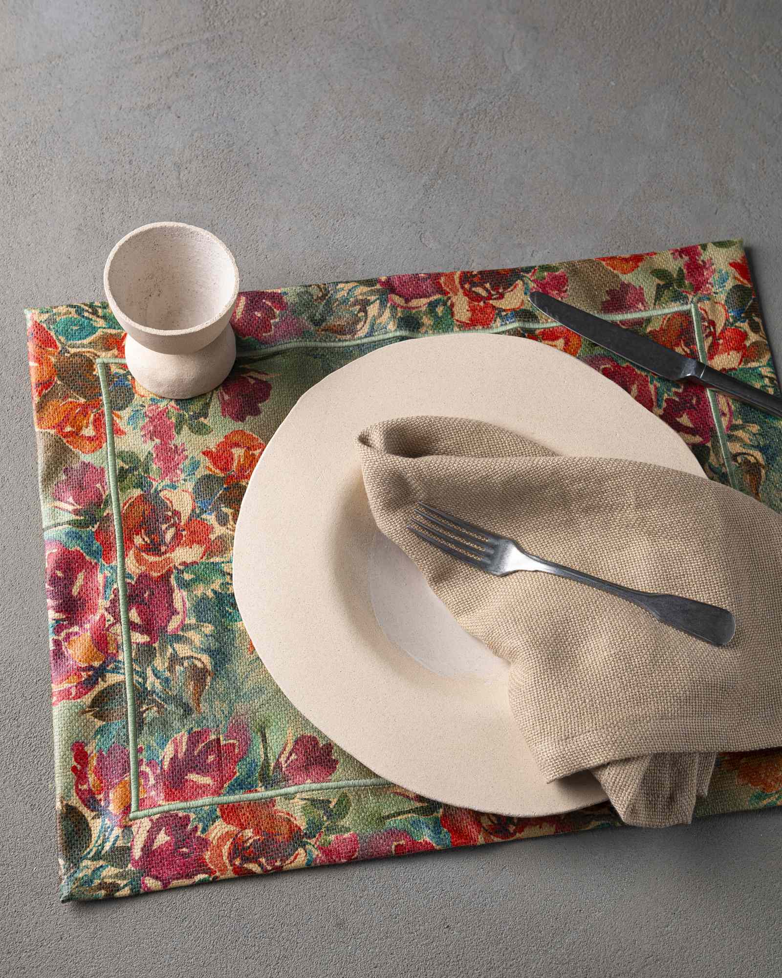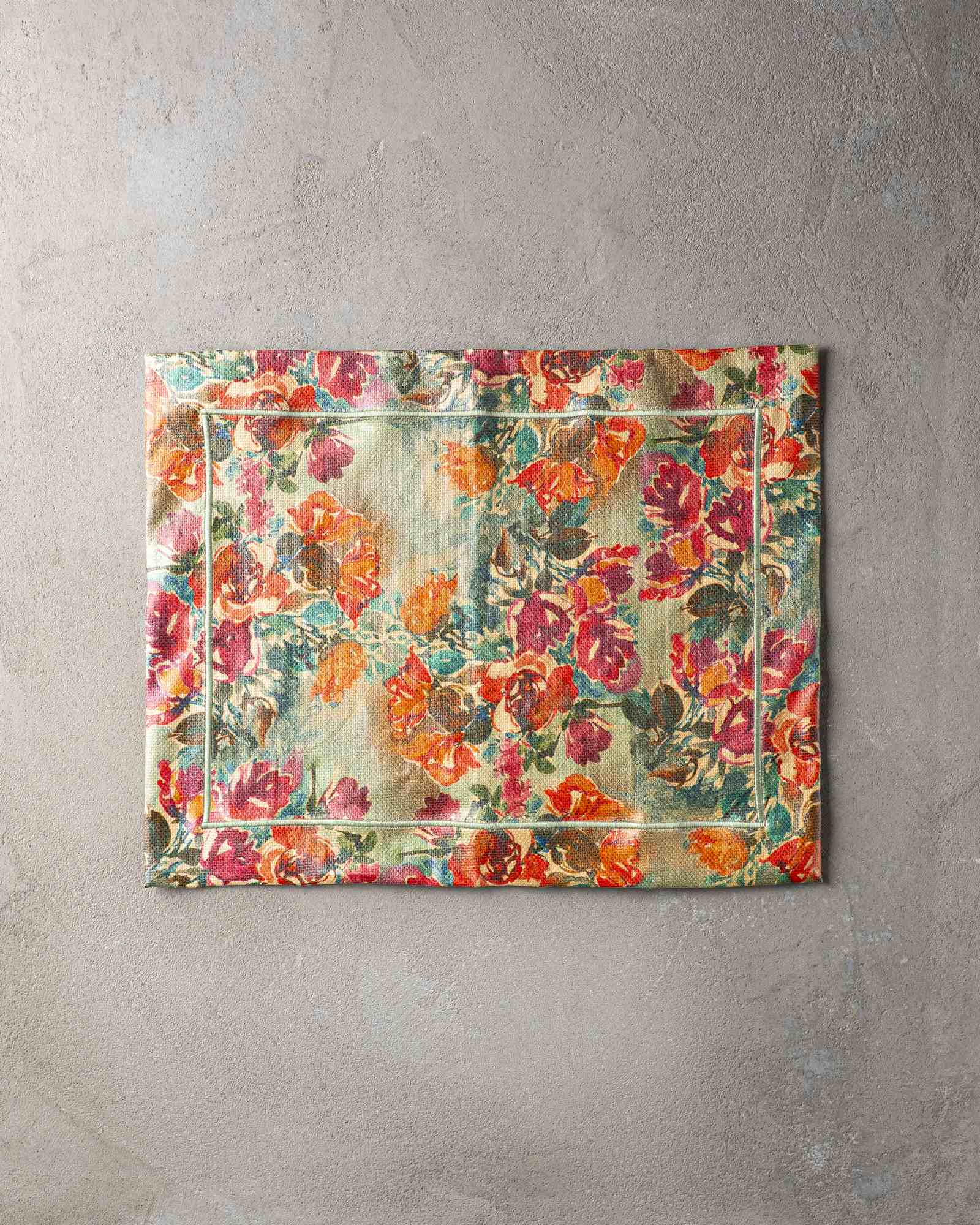 Placemat in linen. The surface comes alive through a floral print that spreads in the weave with natural spontaneity, like light brushstrokes that emerge with fluidity. Vibrant flowers surface as living presences, creating a luminous composition that opens between material and imagination.