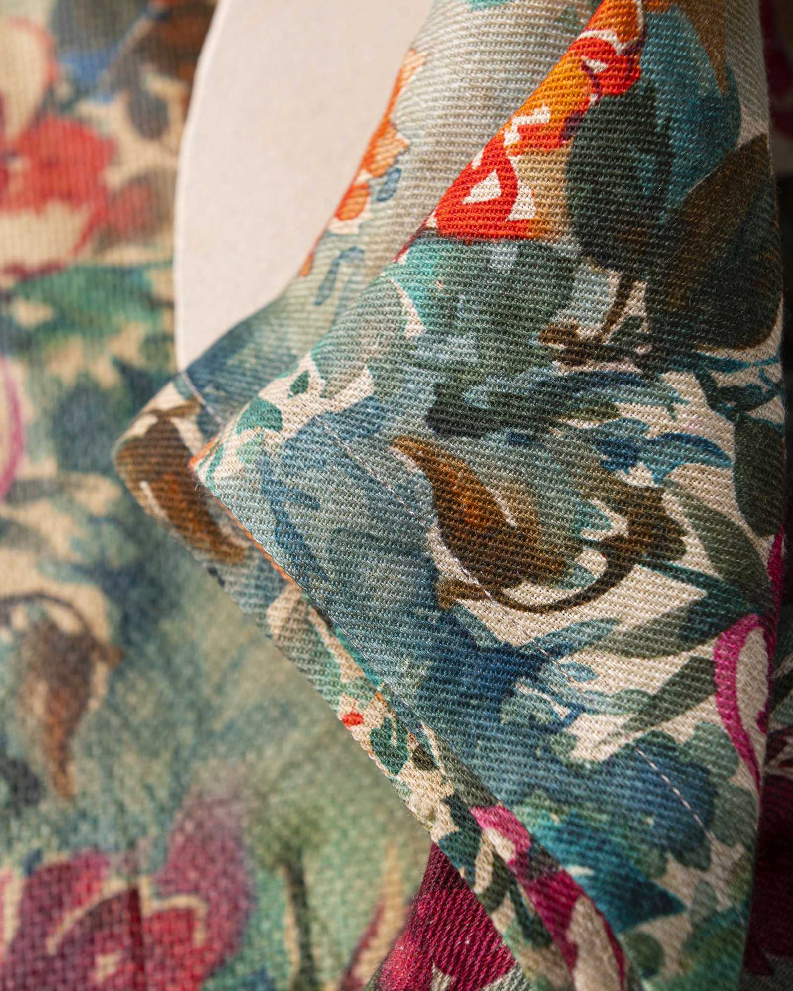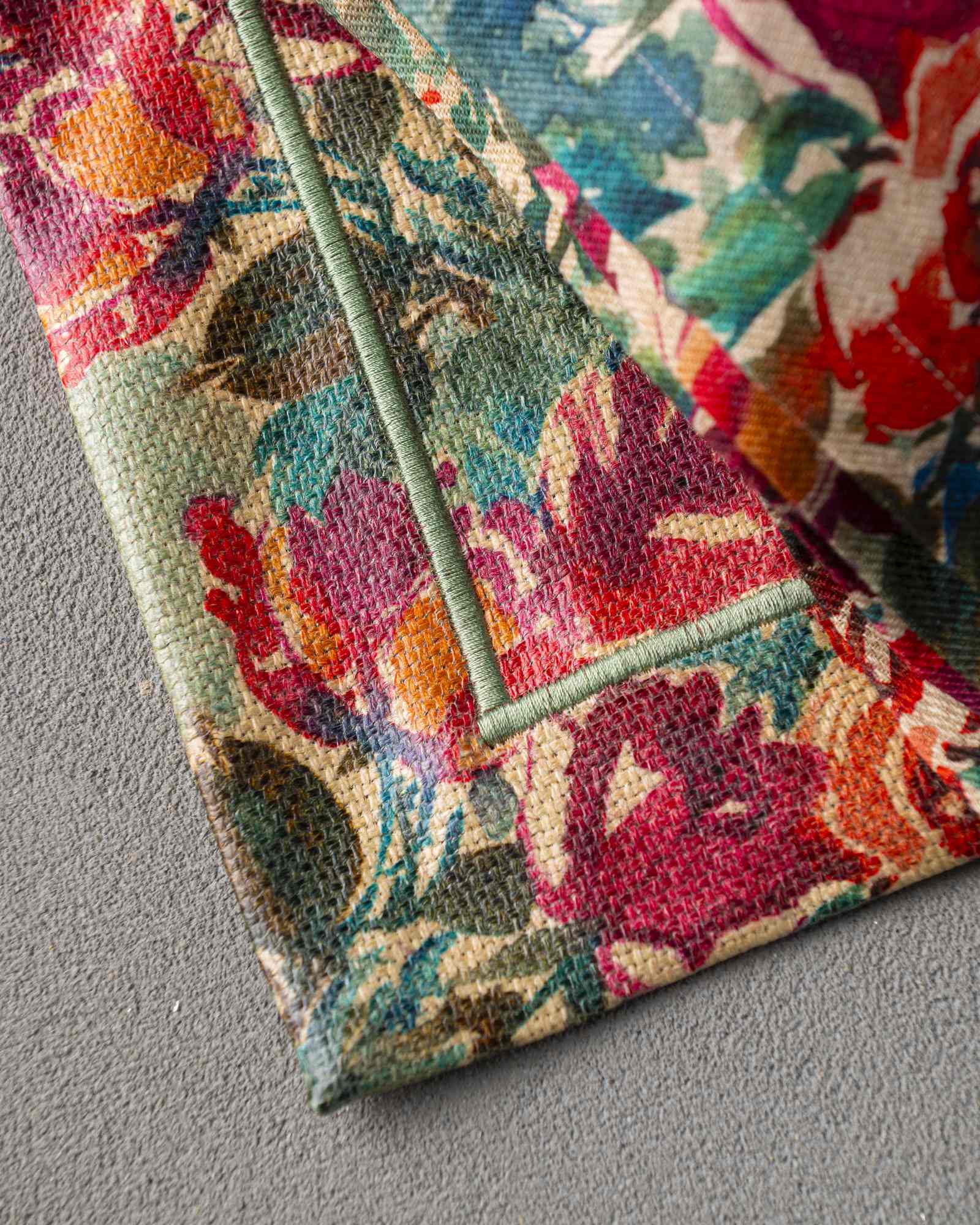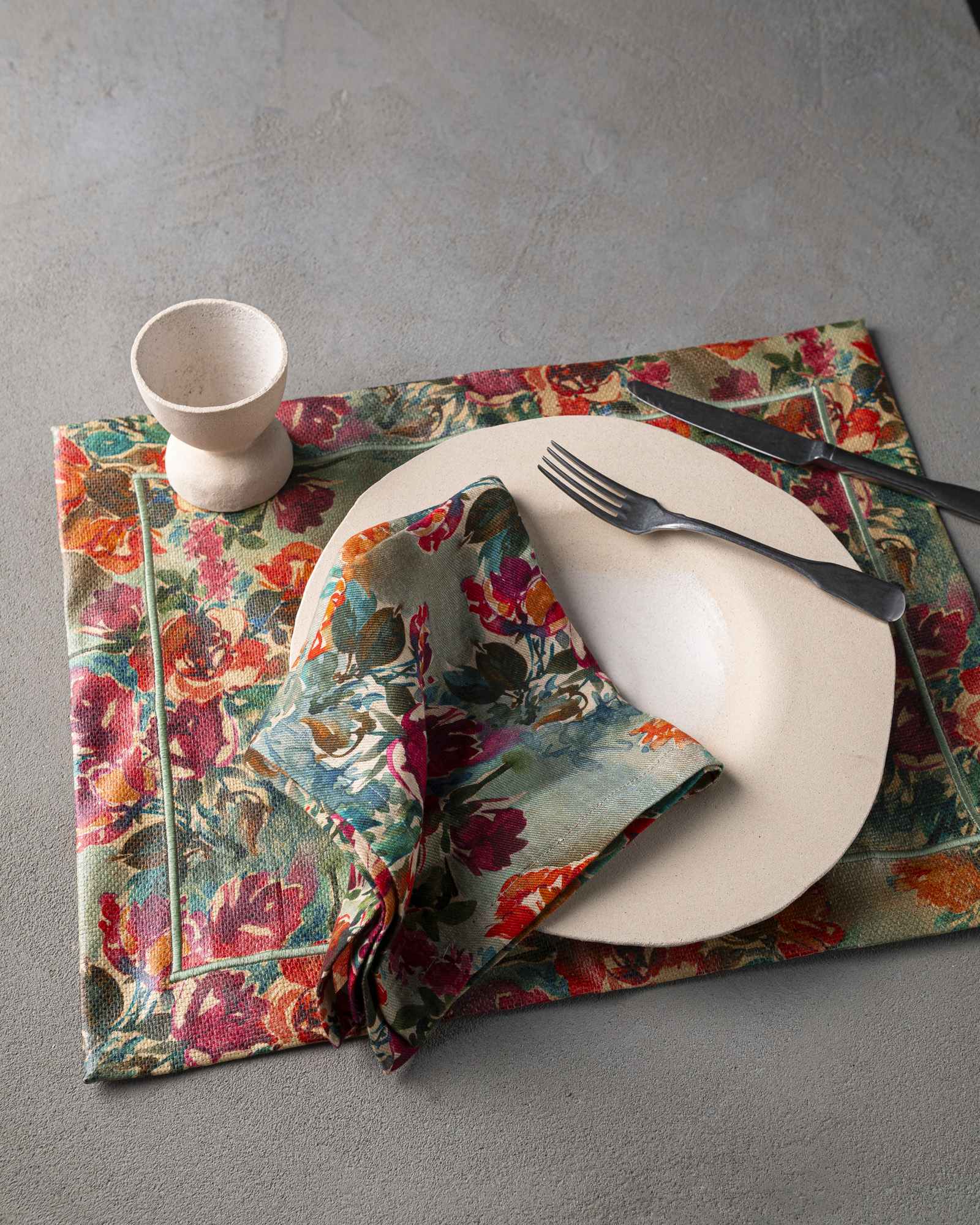 Placemat in linen. The surface comes alive through a floral print that spreads in the weave with natural spontaneity, like light brushstrokes that emerge with fluidity. Vibrant flowers surface as living presences, creating a luminous composition that opens between material and imagination.