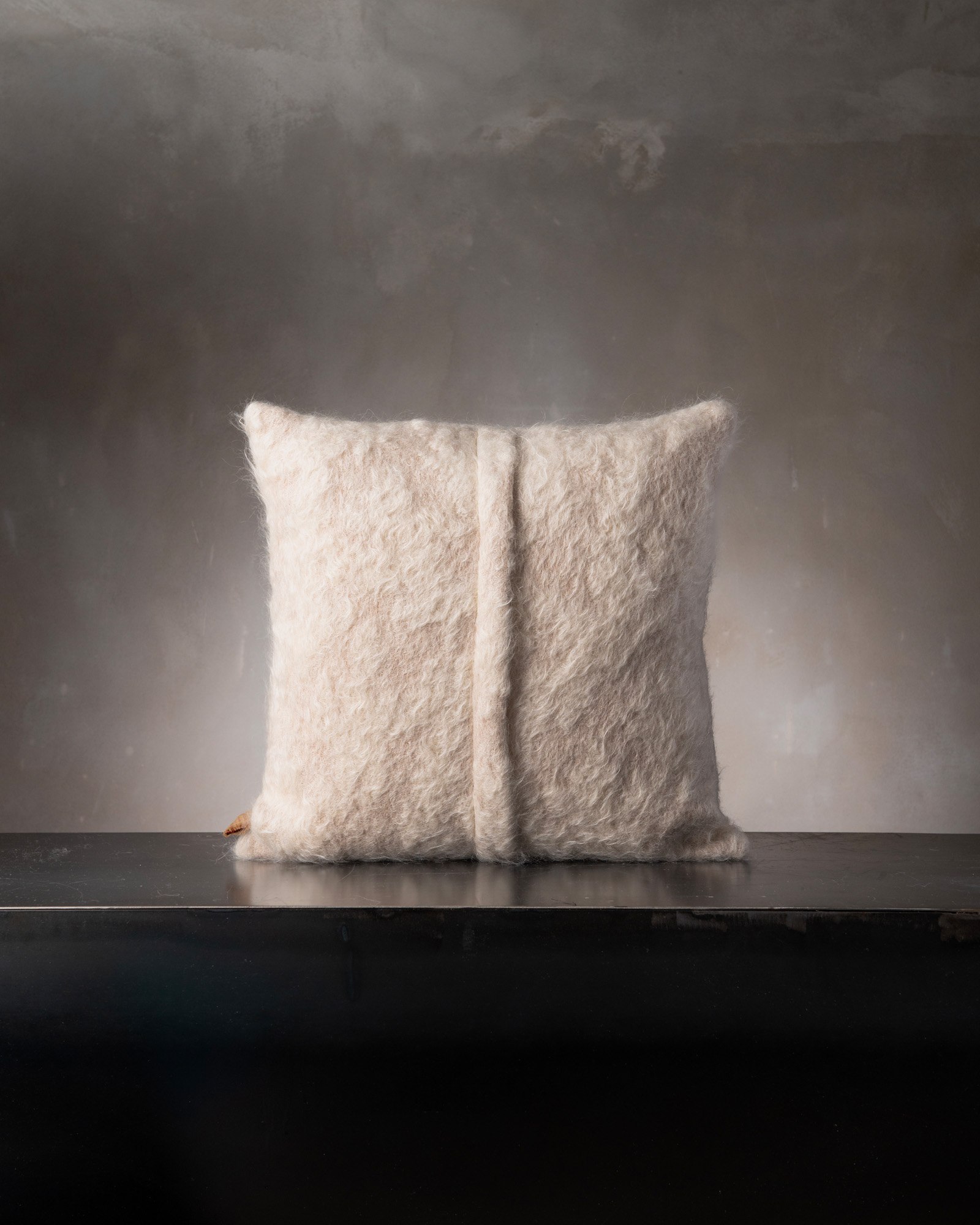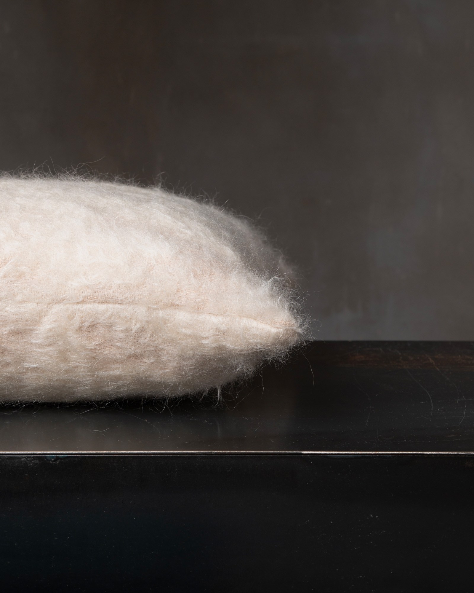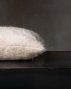 Decorative cushion in mohair. The soft pile spreads across the surface with lightness, creating an impalpable material where nuances dissolve naturally. A soft veil moves through the fabric, like a light mist that softens the contours and envelops the space in a silent light.