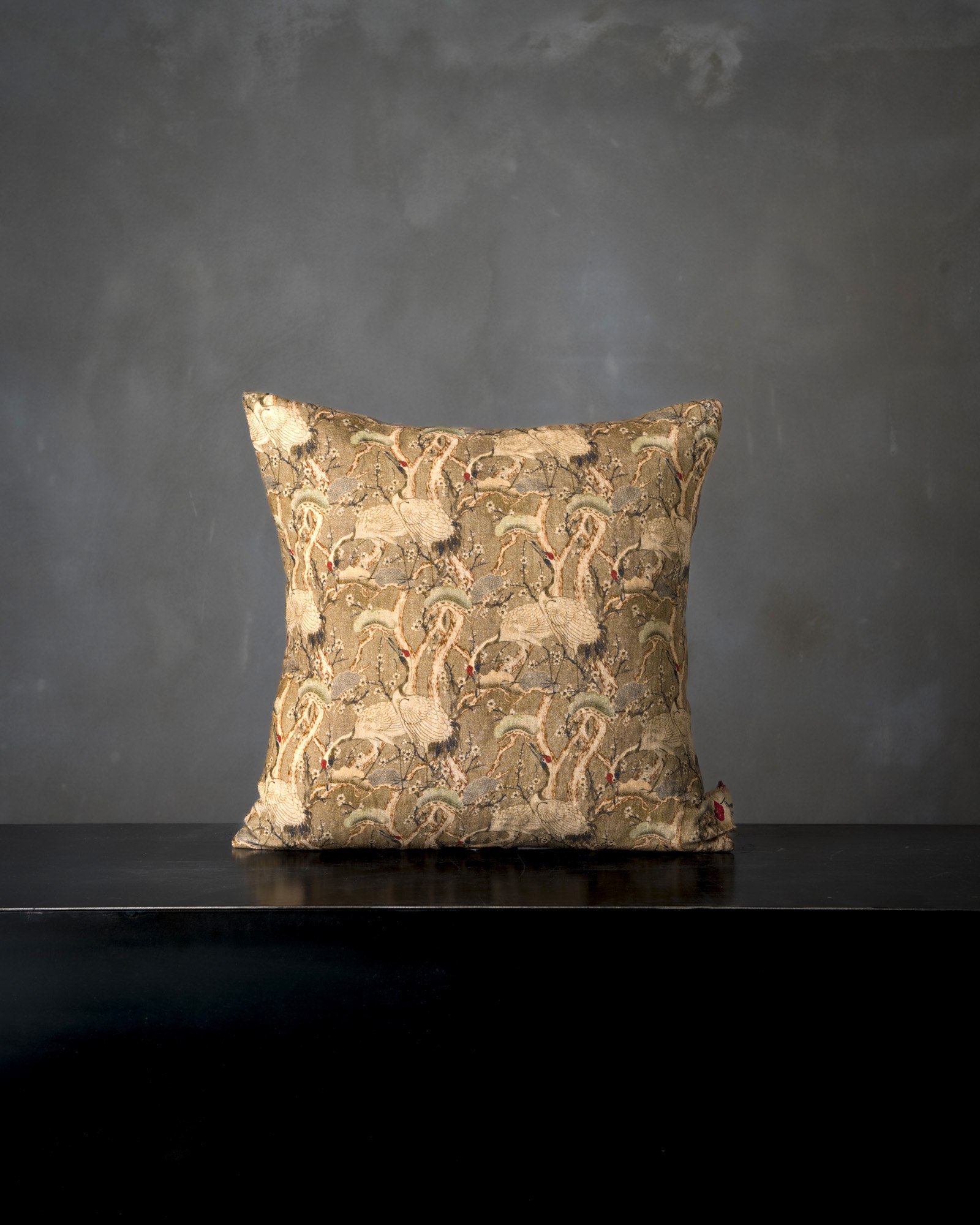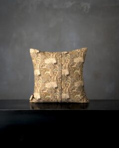 Decorative cushion in cotton and linen. The velvet joins the weave with depth, giving life to a refined pattern that evokes period suggestions and ever-varying material nuances. The surface comes alive like a layered narrative, where every mark surfaces with a silent and ever-changing memory.