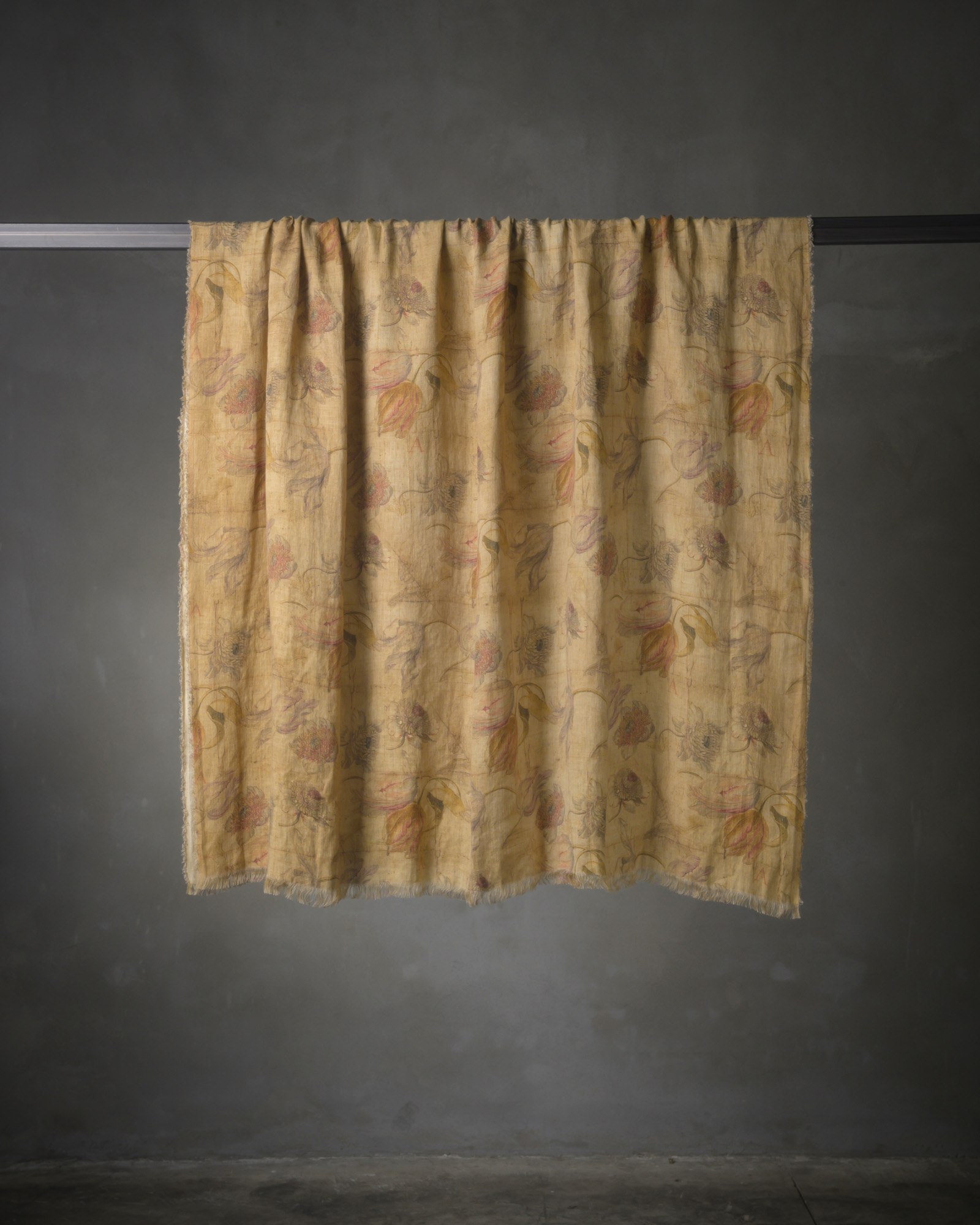 Throw in linen. The surface comes alive with lightness through a fluid weave, where a floral motif emerges with discretion from an irregular and vibrant material. Light forms surface like silent constellations, drawing a landscape suspended between light and imagination.