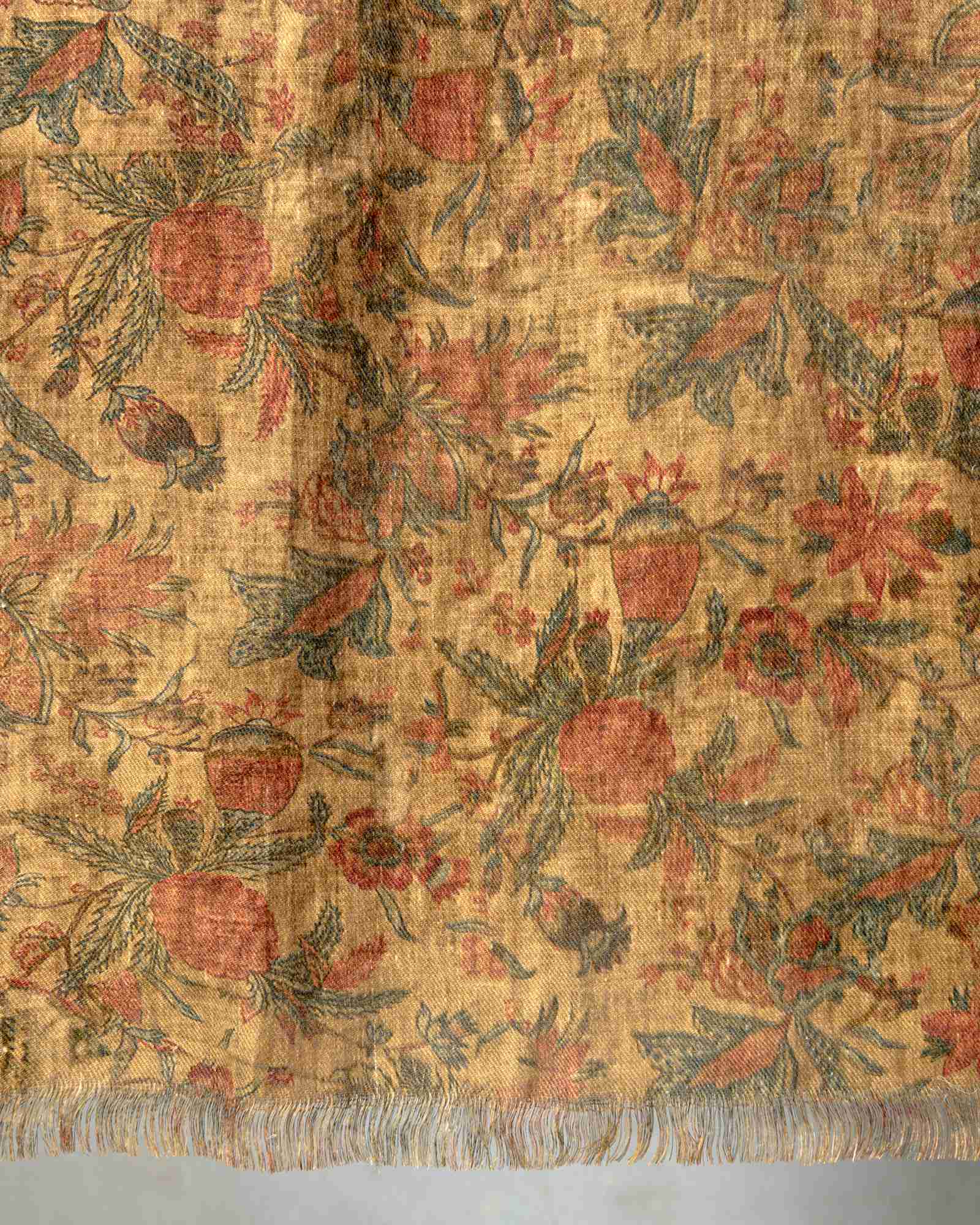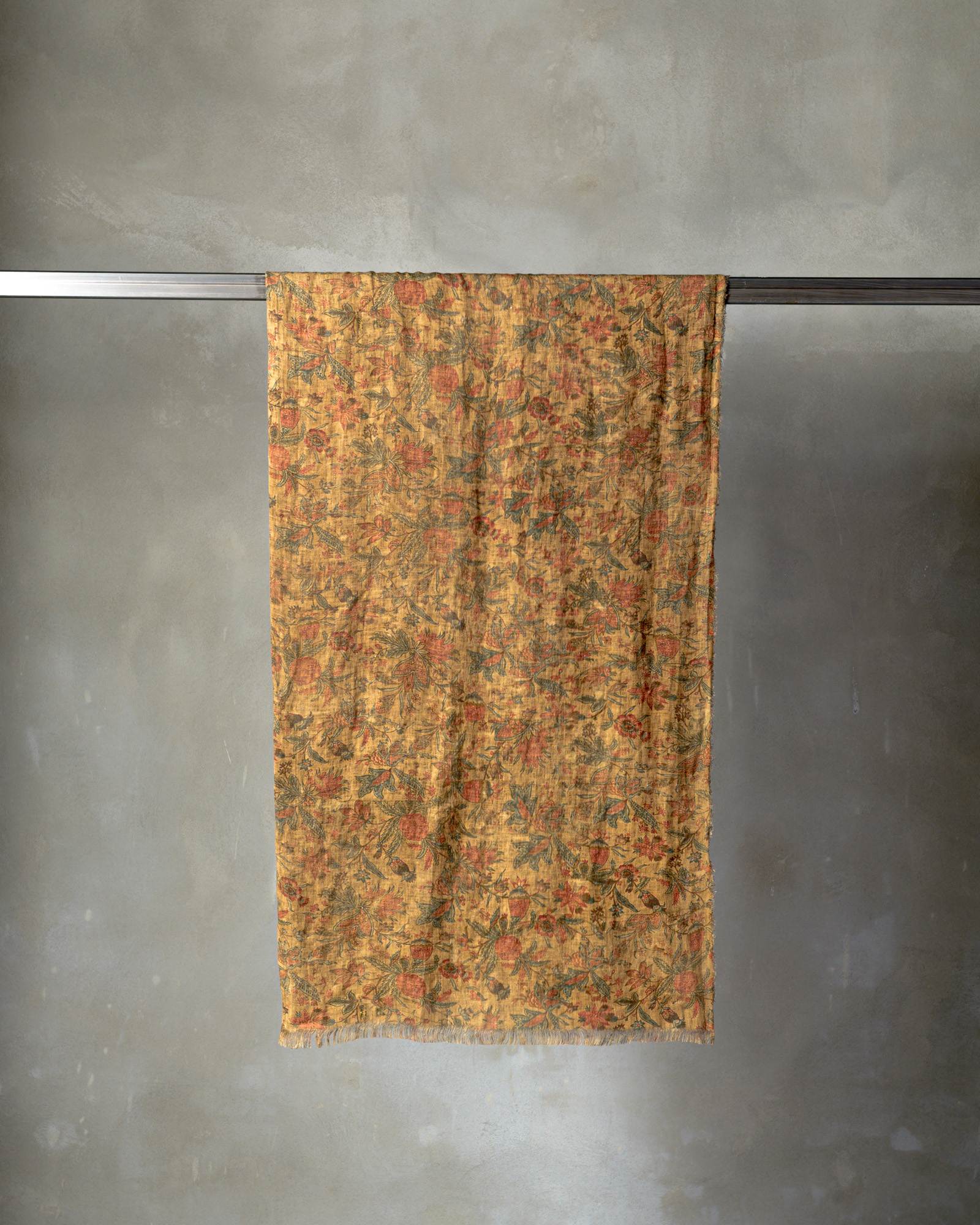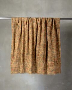 Throw in linen. The surface receives a floral motif that develops with lightness across the impalpable weave, creating a rich and enveloping composition. The forms move as if in a silent dance, immersed in a material that fades and transforms with natural continuity.