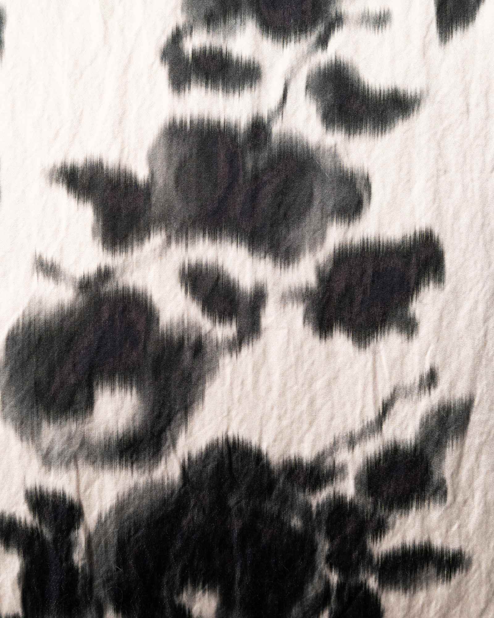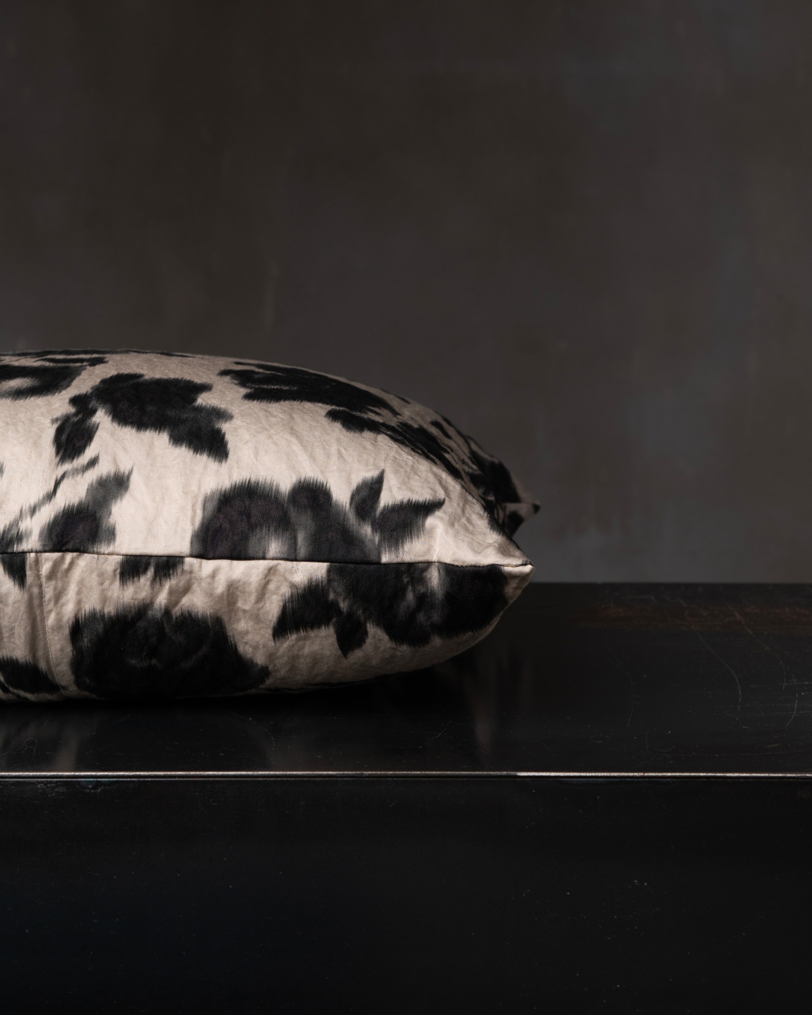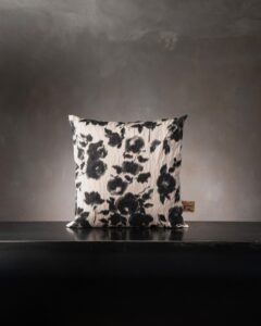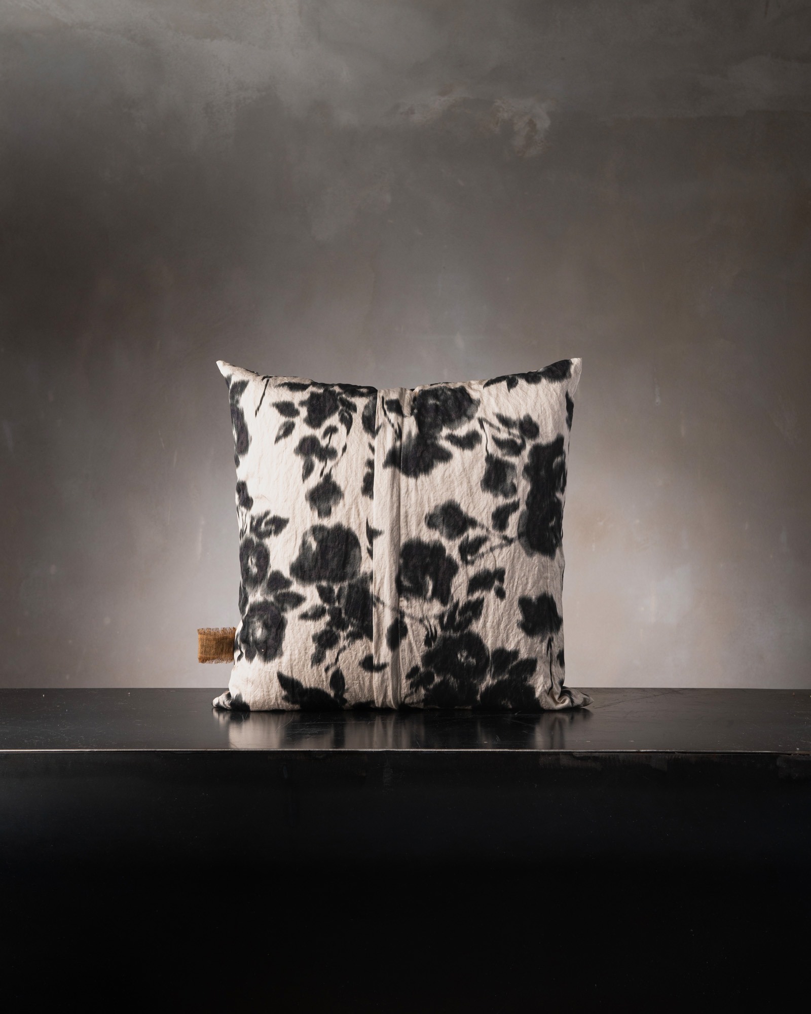 Decorative cushion in cotton and metallic fibres. The floral pattern develops with graphic rhythm across the surface, building an elegant and dynamic composition. Light marks interweave like a design in motion, evoking an abstract garden suspended between order and spontaneity.