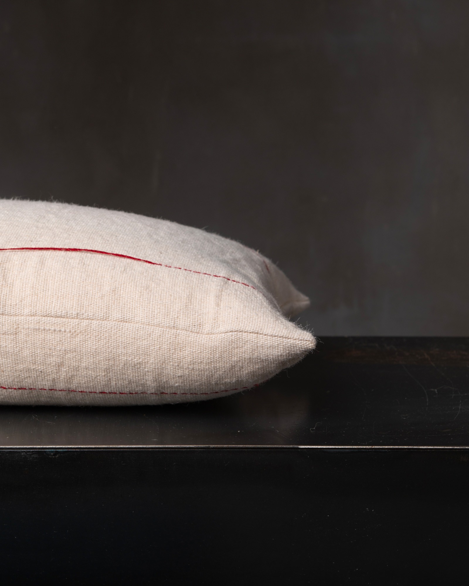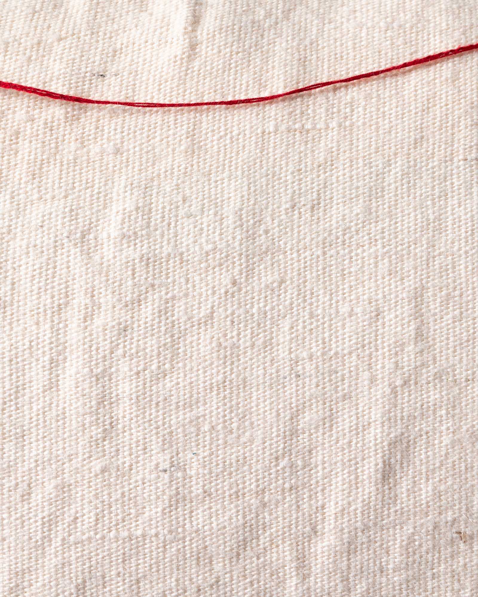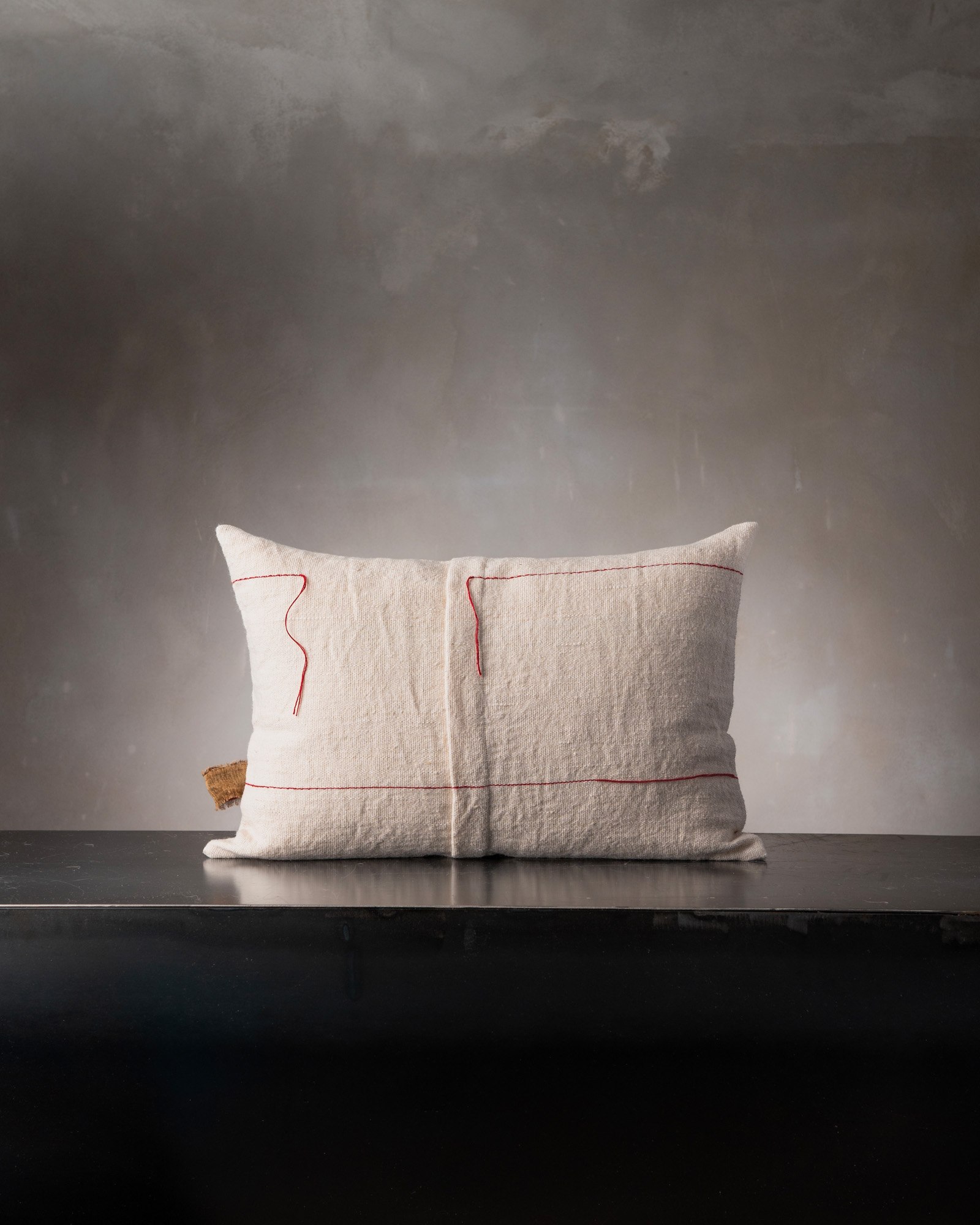 Decorative cushion in jute and linen. The natural fibre expresses itself with authenticity, traversed by flou thread details that emerge in an irregular and spontaneous manner, making every surface unique. A free mark moves through the fabric, like an instinctive gesture that tells of the imperfect beauty of matter.