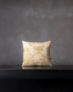 Cuscino decorativo in lino. Il disegno si ispira a un immaginario bucolico, reinterpretando il linguaggio del toile de jouy con sensibilità contemporanea e leggerezza narrativa. Scene delicate si dispiegano sulla superficie, come frammenti di paesaggio che affiorano tra memoria e quiete naturale.