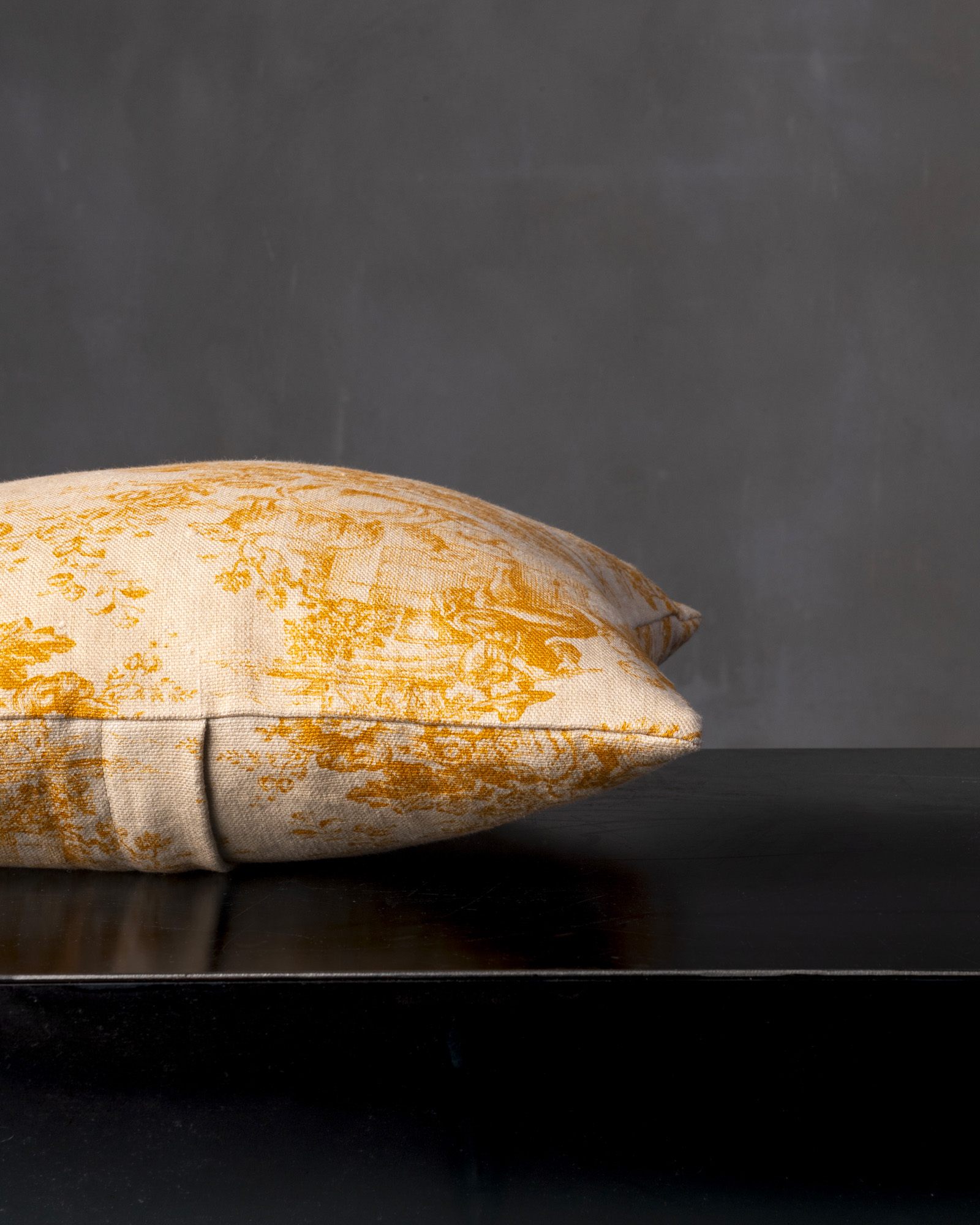Decorative cushion in linen. The pattern draws inspiration from a bucolic imaginary, reinterpreting the language of toile de jouy with contemporary sensibility and narrative lightness. Delicate scenes unfold across the surface, like fragments of landscape that surface between memory and natural quiet.