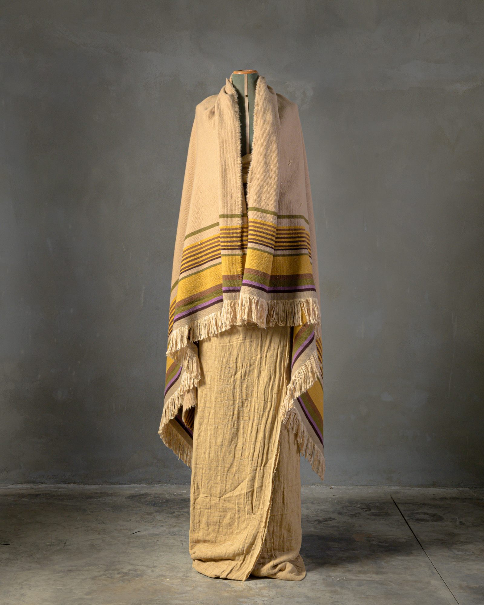 The slight tactile irregularities are the result of the dialogue between wool and silk.