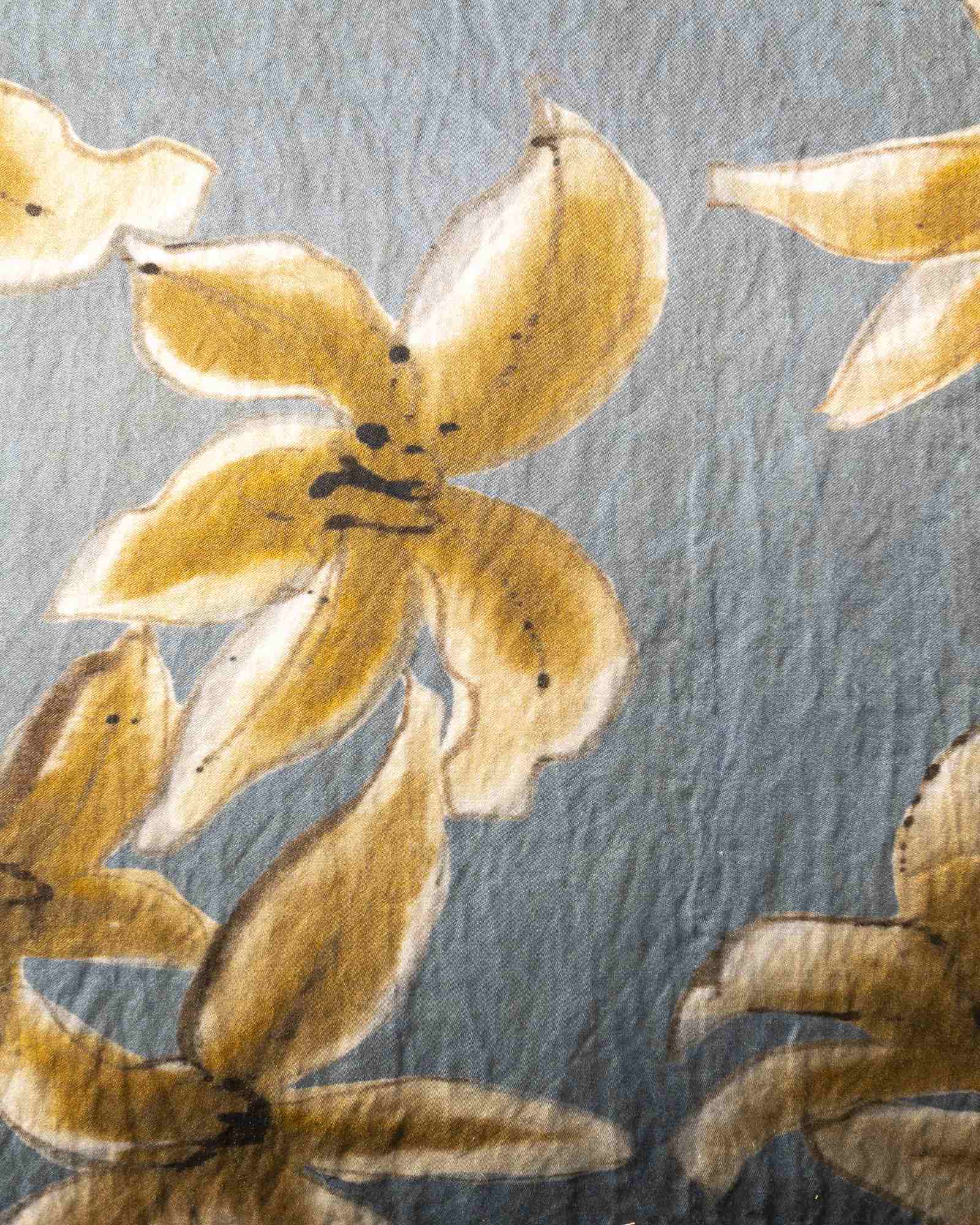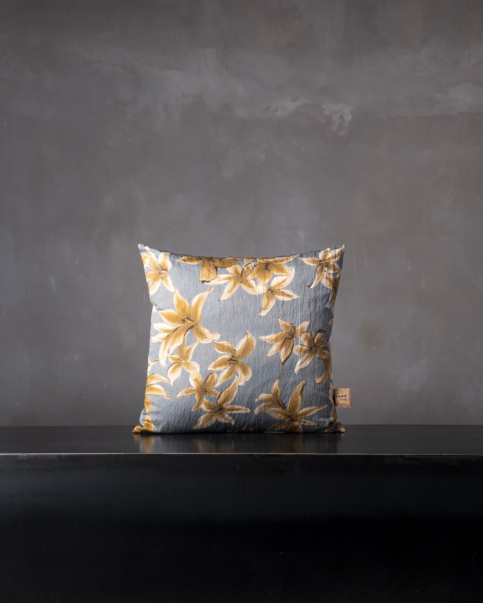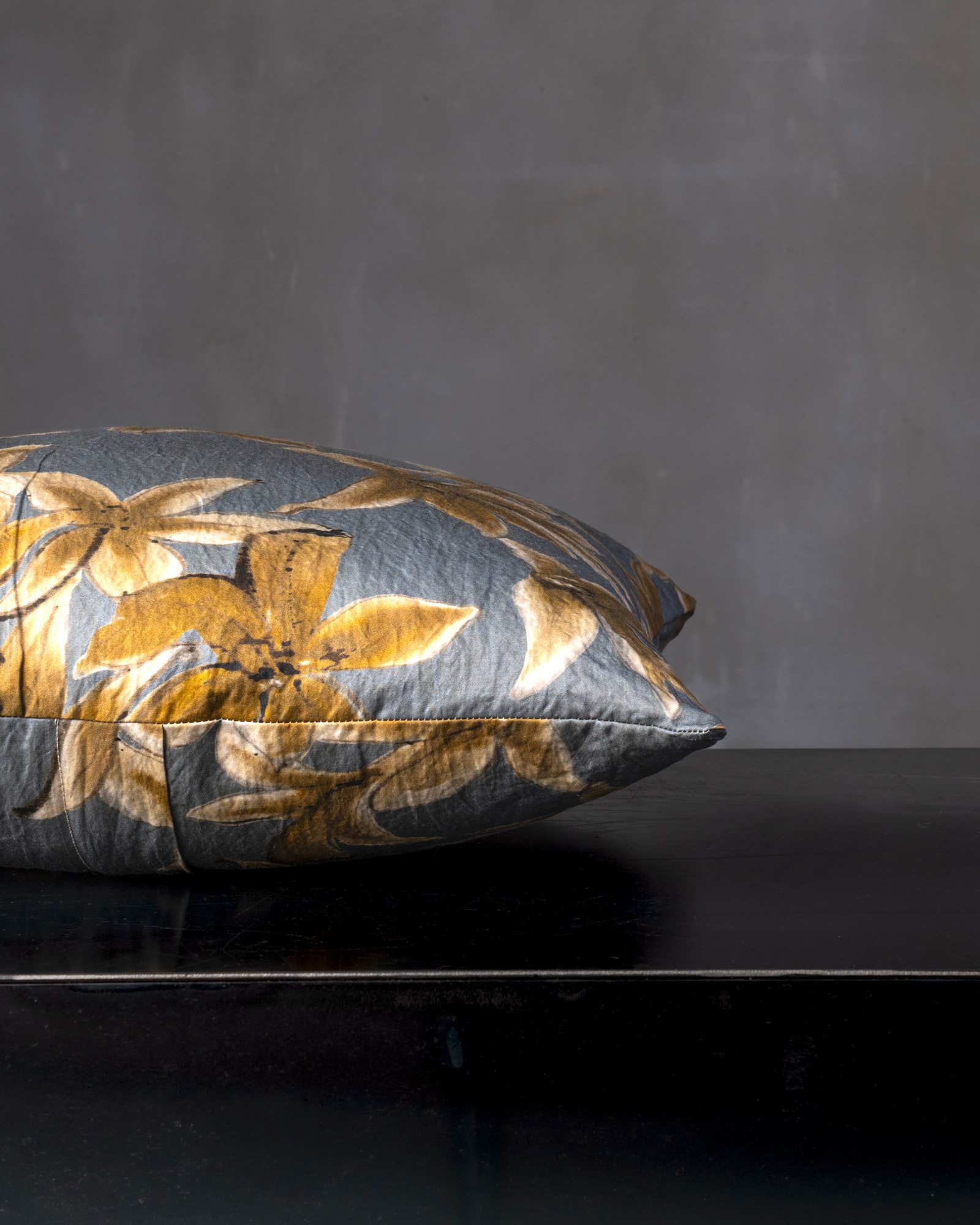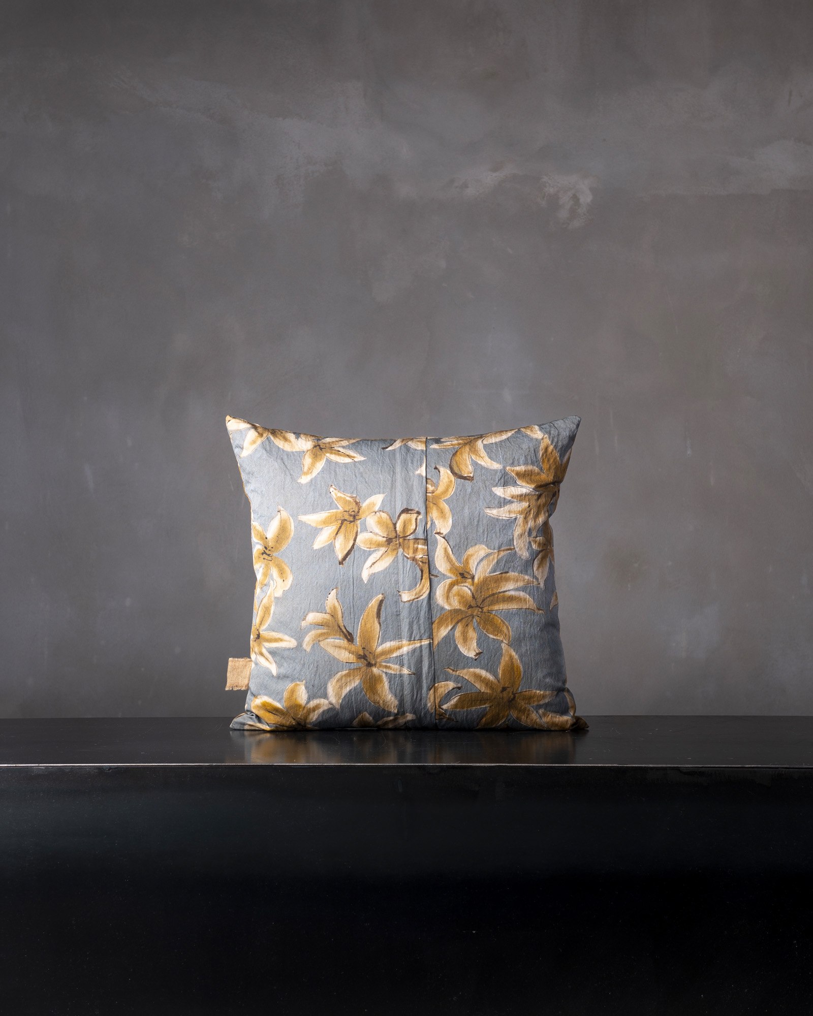 Decorative cushion in cotton and metallic fibres. The large floral motif opens across the surface with a broad and luminous gesture, where the material welcomes subtle variations that intensify its depth. Petals and forms unfold like a delicate apparition, evoking a garden that comes to life in a suspended and vibrant dimension.
