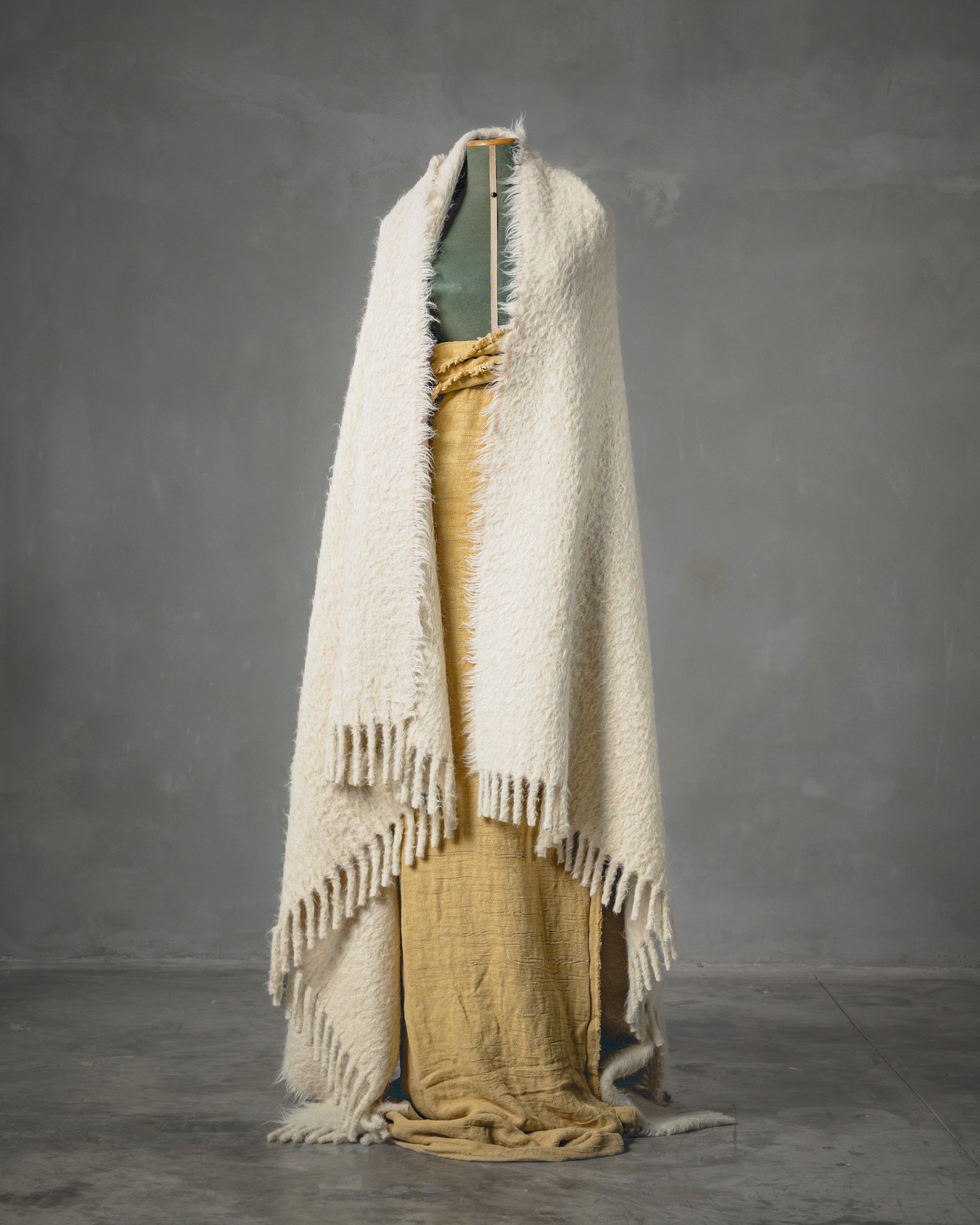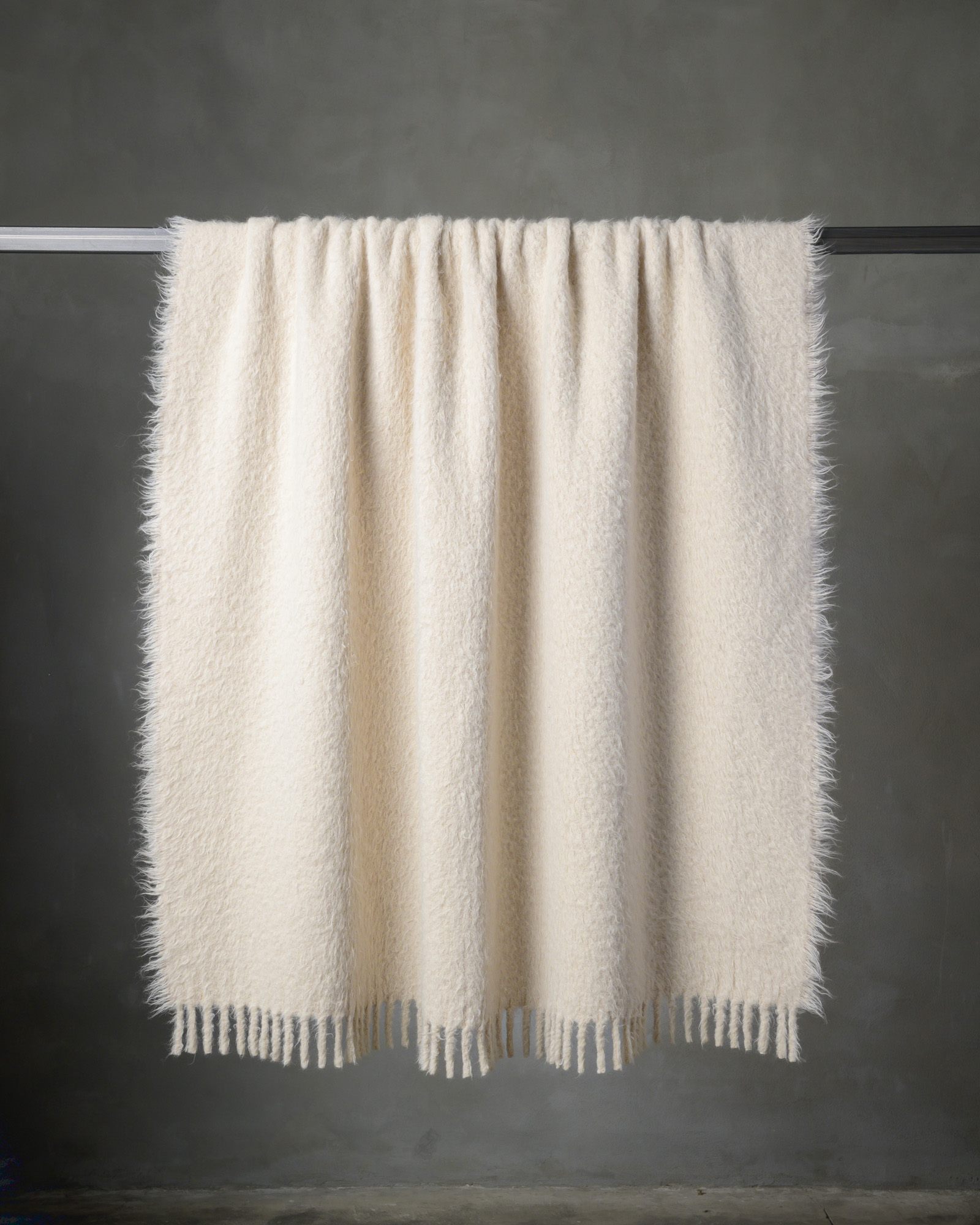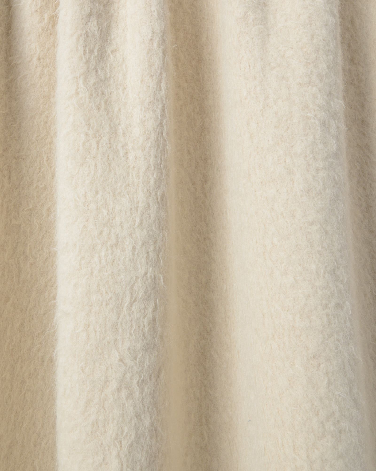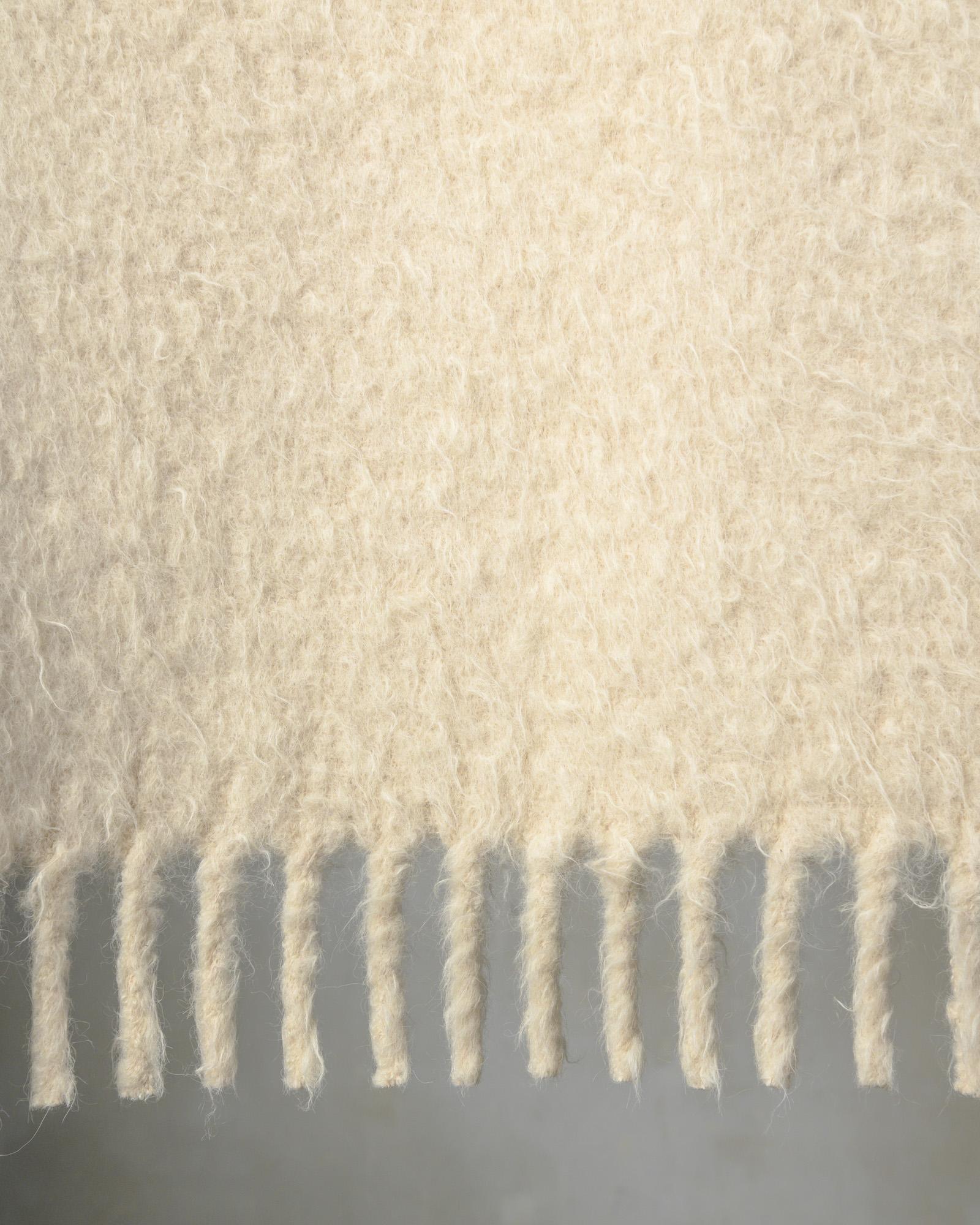 Throw in alpaca. The surface develops uniformly, allowing the full and enveloping softness of the fibre to emerge on both sides. A soft and continuous material that spreads like a silent light, enveloping the space in a warm and rarefied presence.