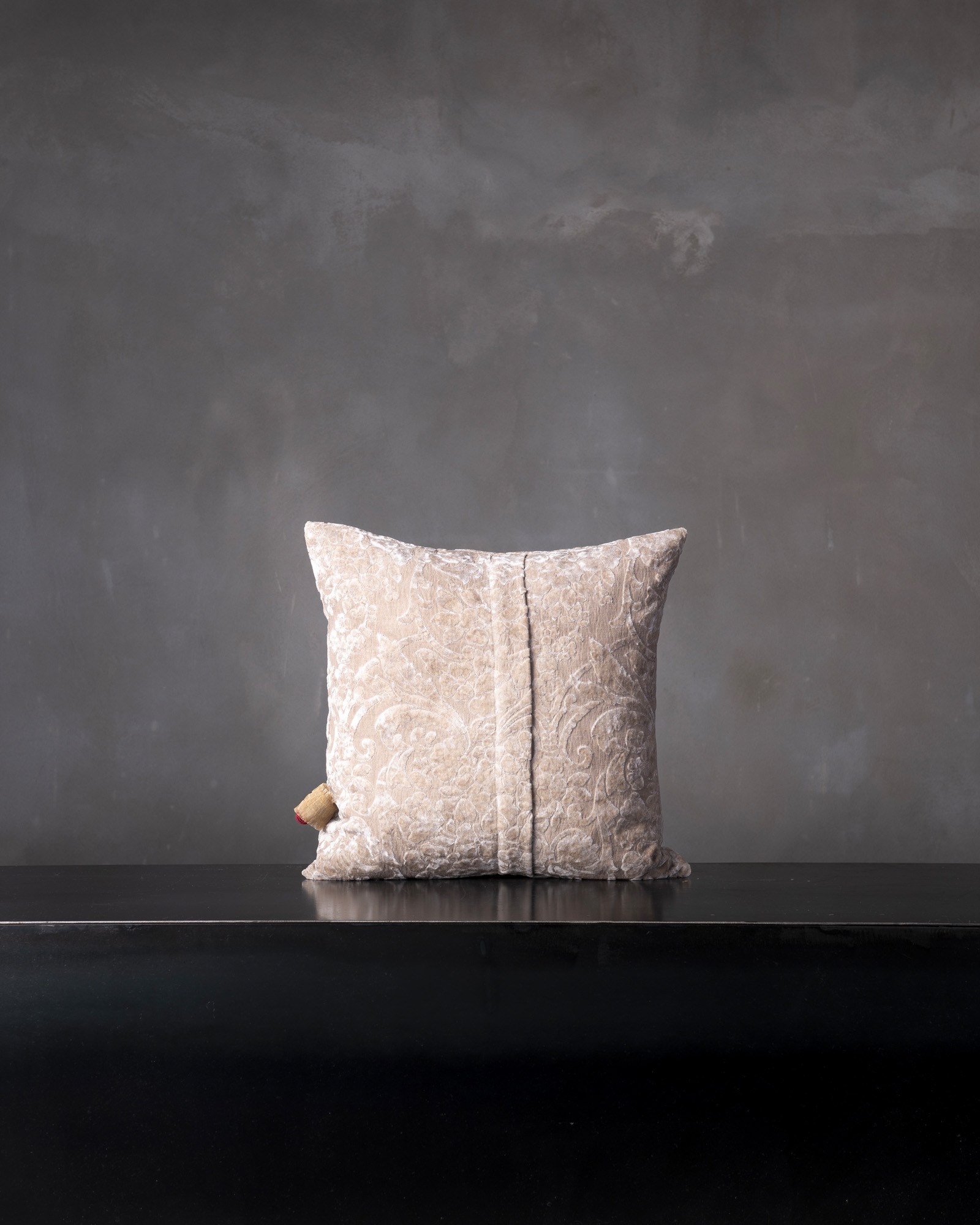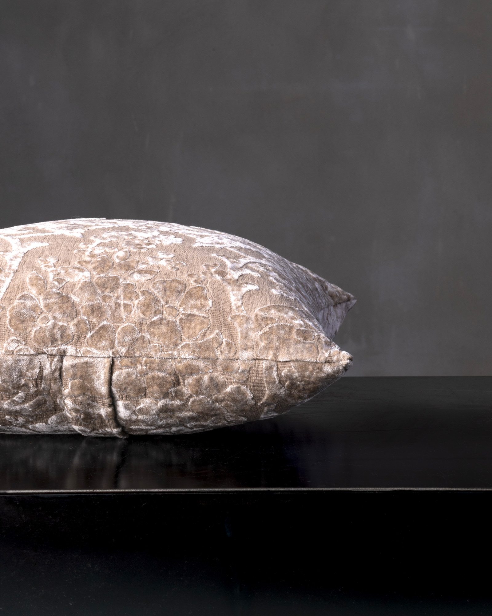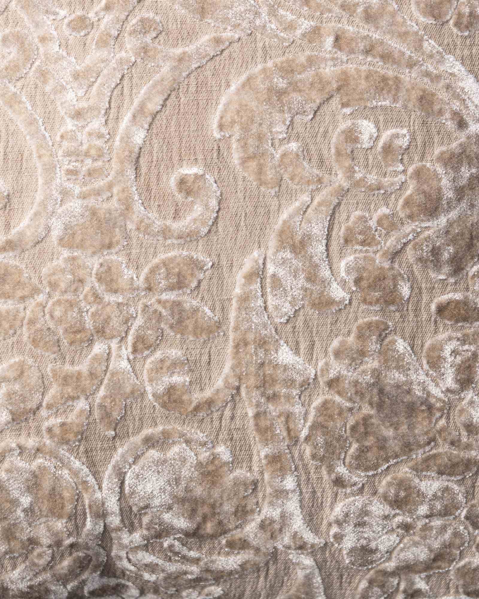 Decorative cushion in viscose and cotton. The graphic motif develops with rhythm across the structured surface, giving life to a refined balance between intensity and measure. A pattern inspired by baroque suggestions surfaces with discretion, like an ornamental echo that dissolves in an elegant and composed presence.