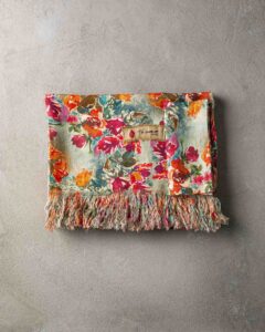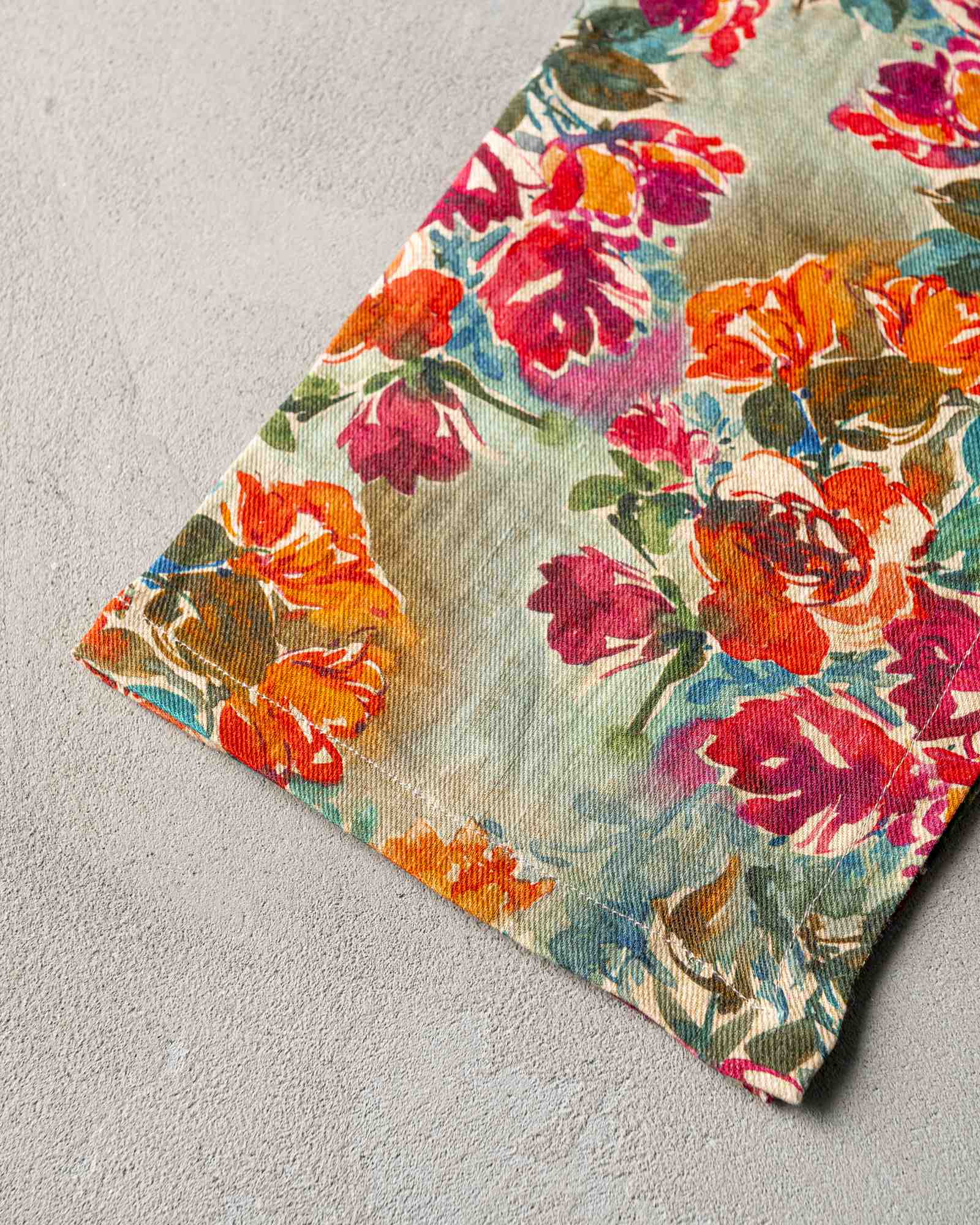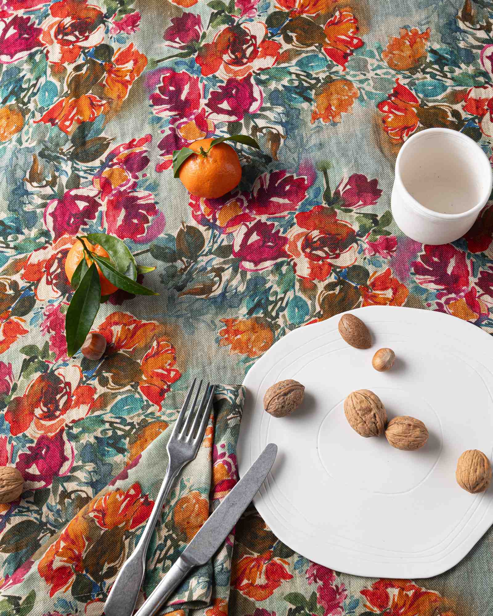Napkin in linen. The surface comes alive through a floral print that spreads in the weave with natural spontaneity, like hand-painted marks that emerge with lightness. Vibrant flowers surface as living presences, creating a luminous composition that opens between material and imagination.