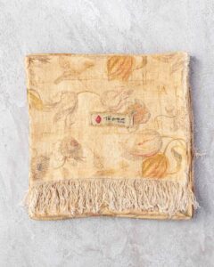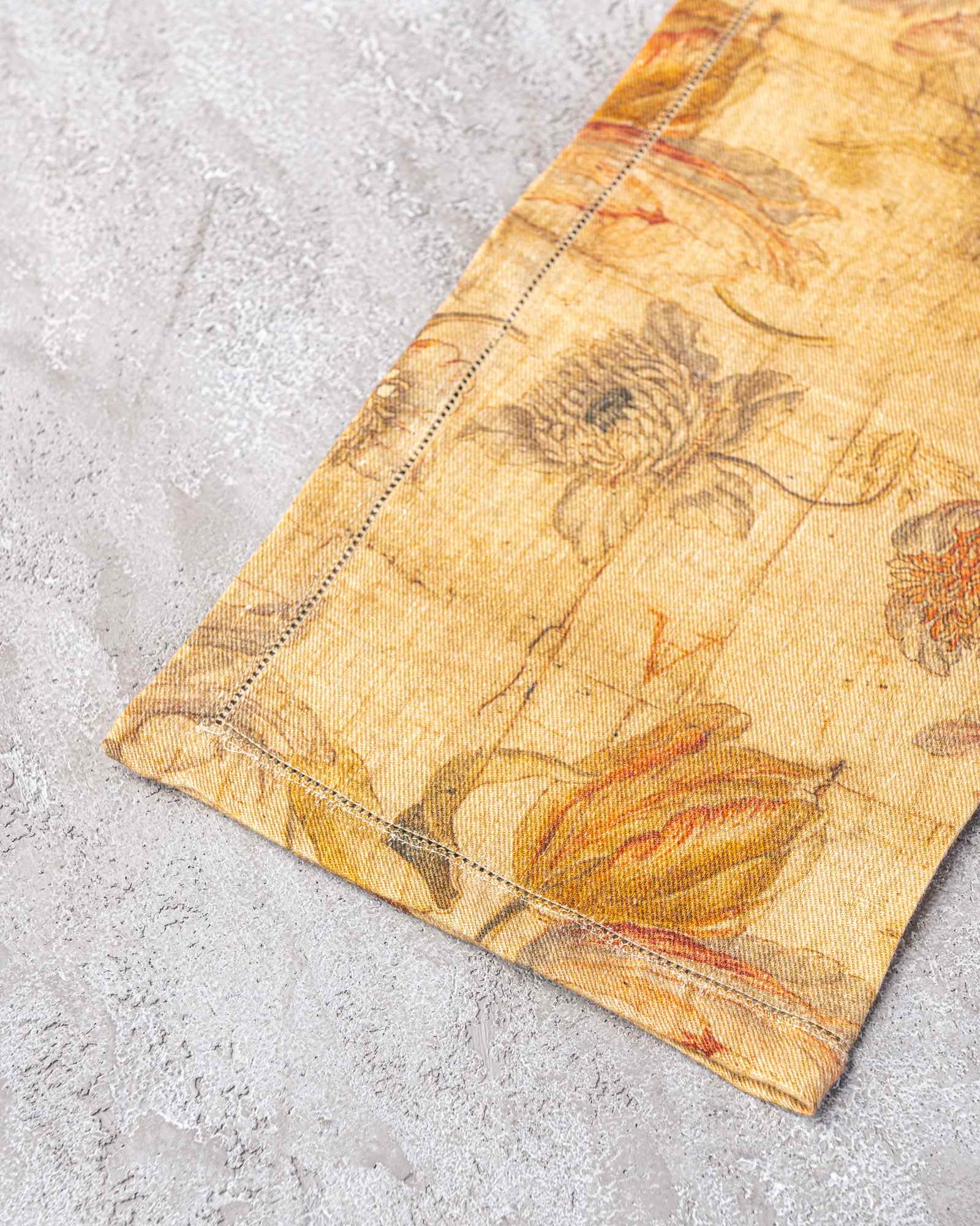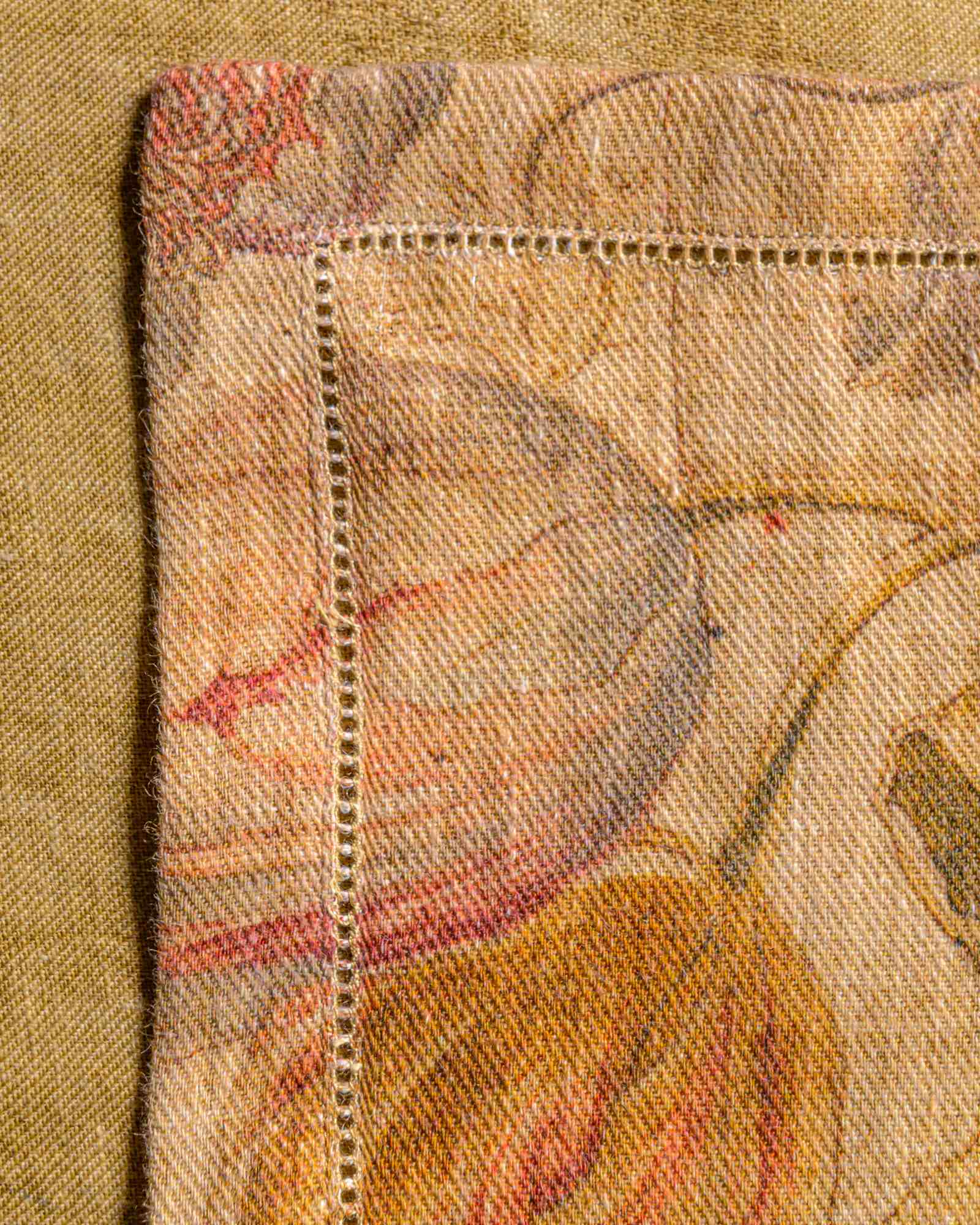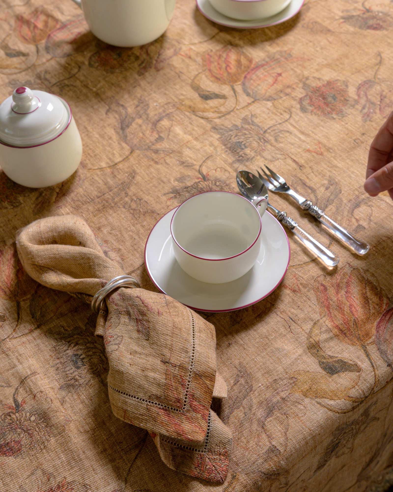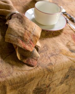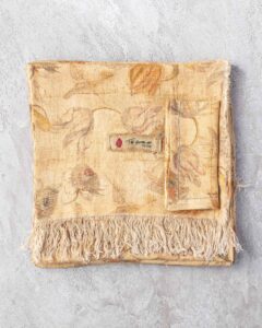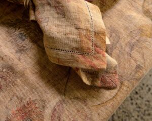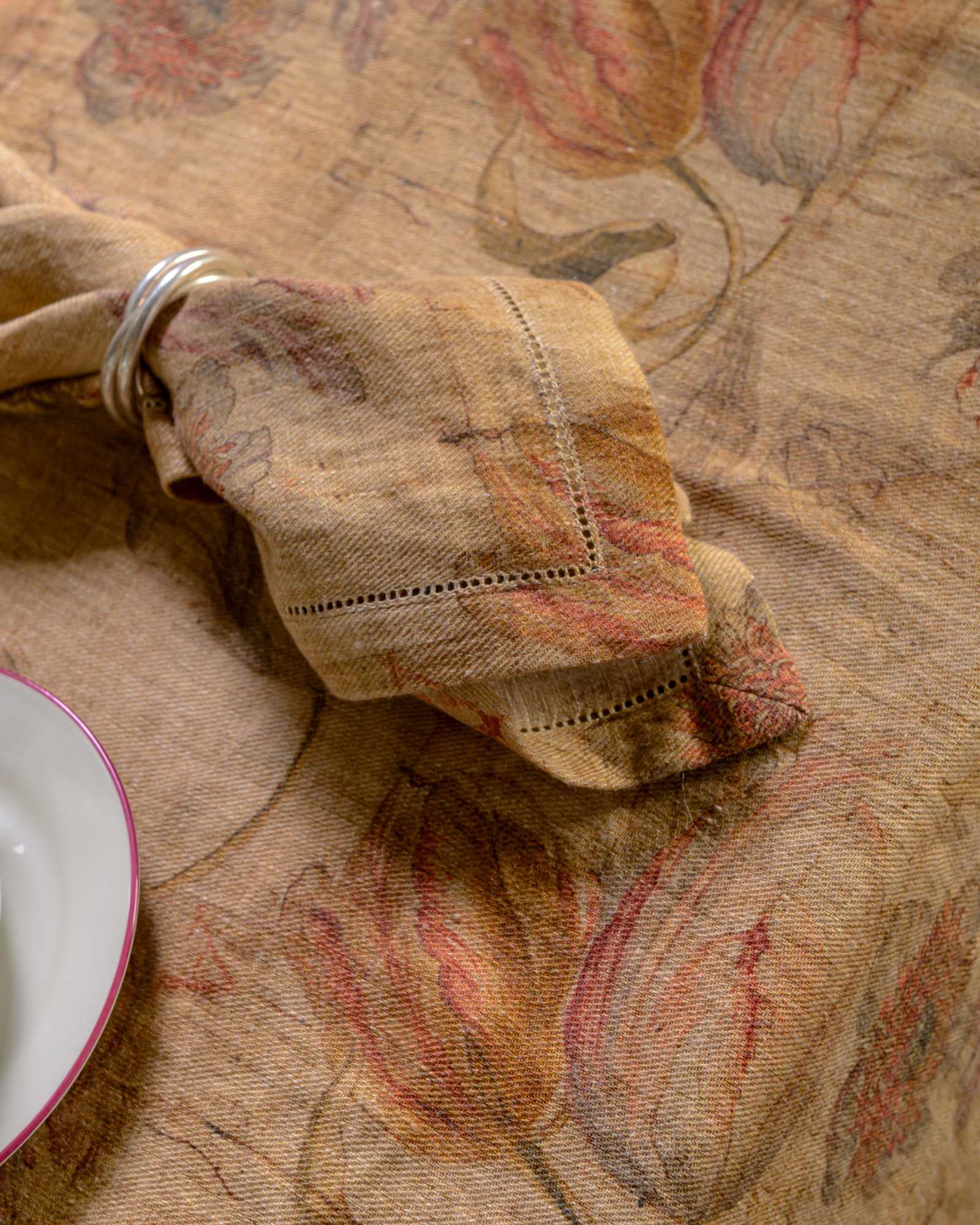 Napkin in linen. The material surface expresses itself with lightness, receiving a floral pattern that emerges with discretion in the weave, almost suspended in the material. Delicate forms surface like a light breath, creating a silent and naturally harmonious presence.
