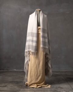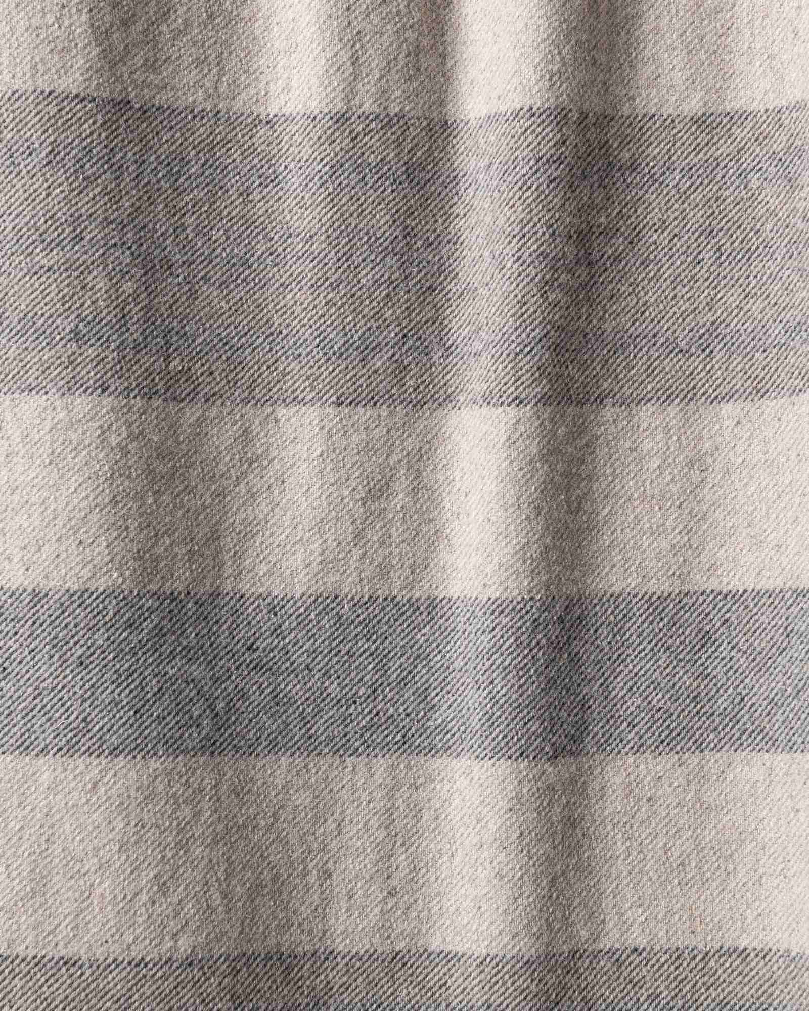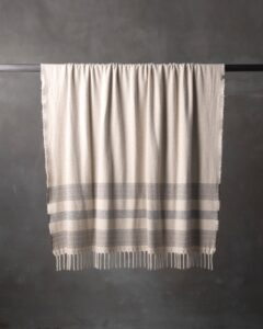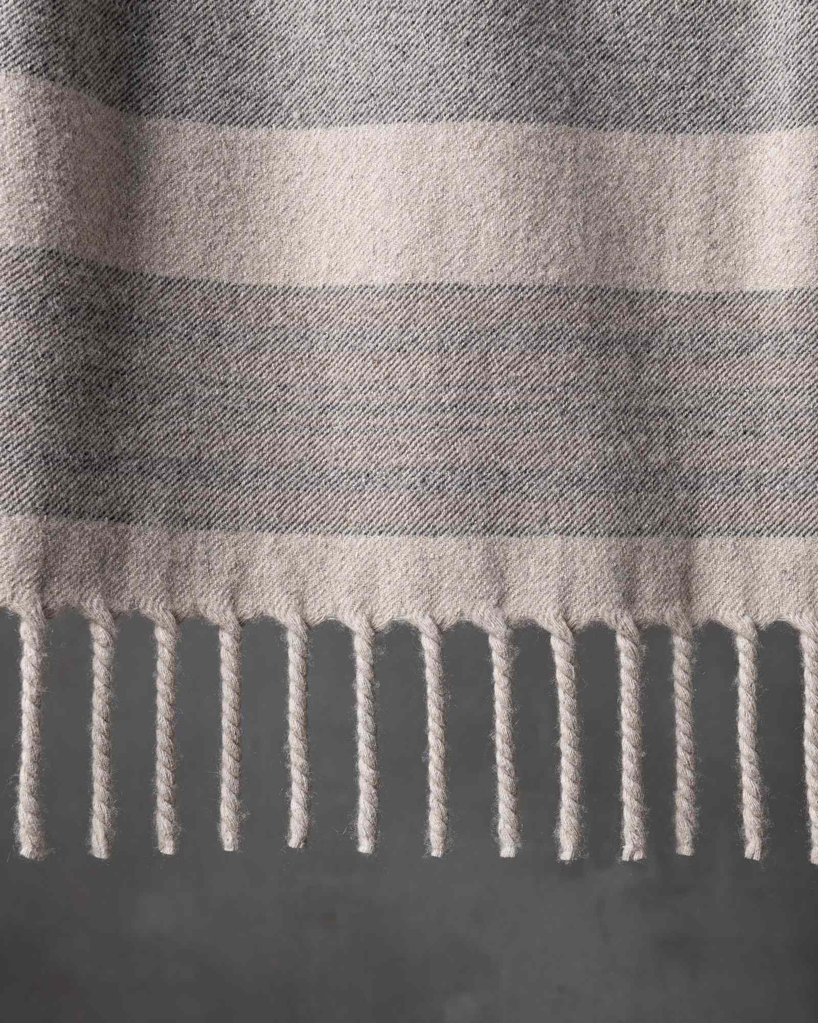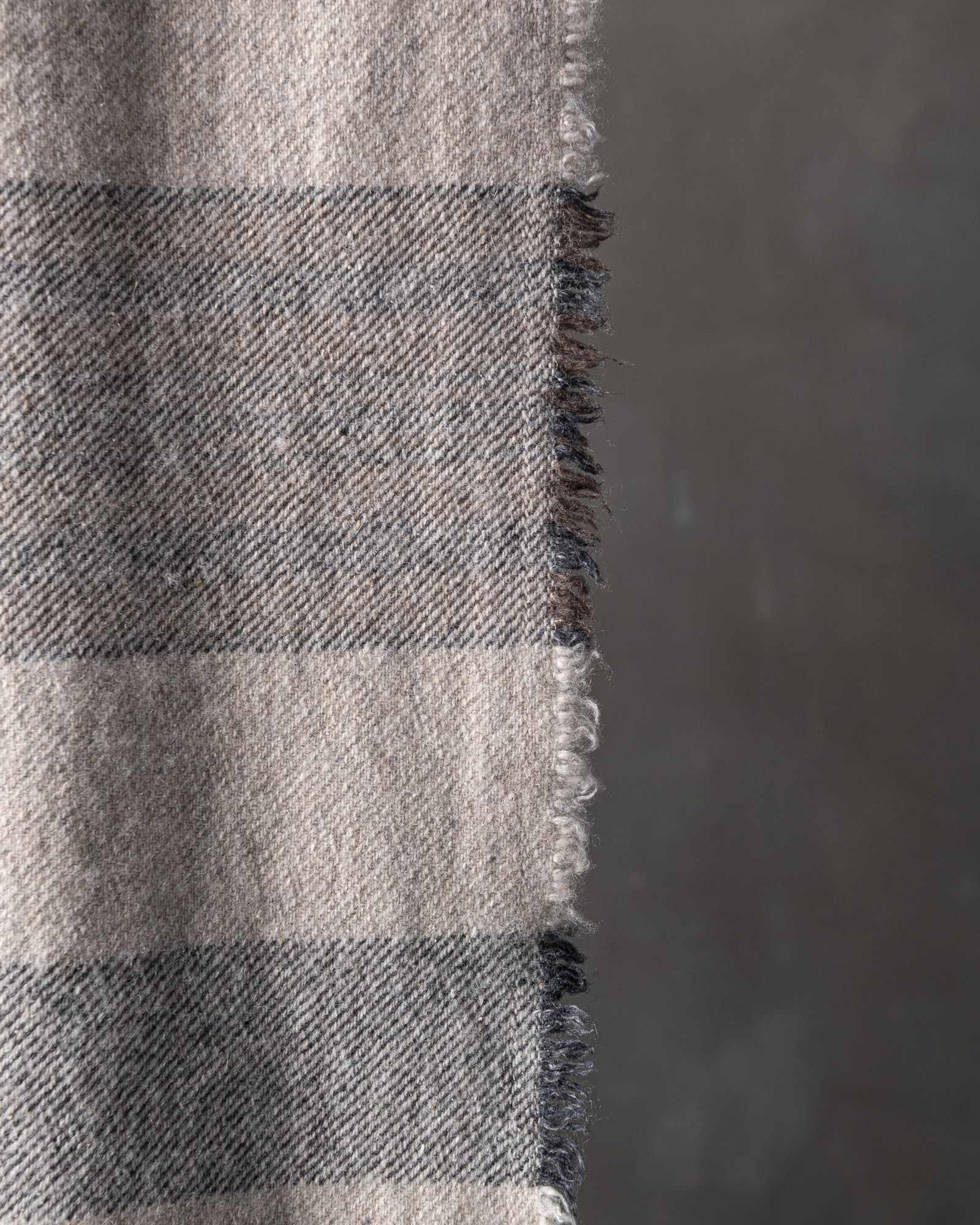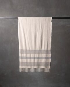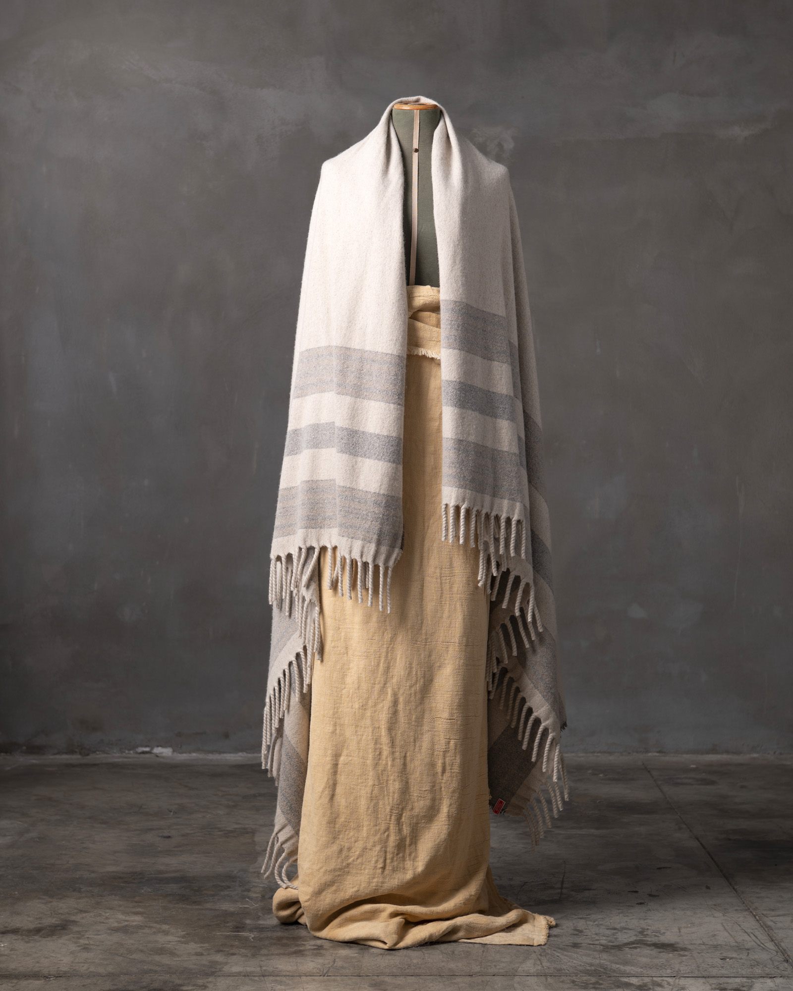 Throw in cashmere and silk. The striped pattern traverses the surface with lightness, building a subtle rhythm that integrates with the depth of the material. Barely suggested lines emerge like a continuous breath, evoking a refined presence that expresses itself with discreet harmony.