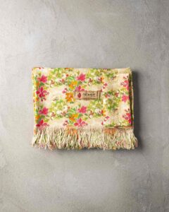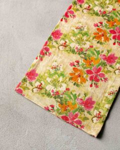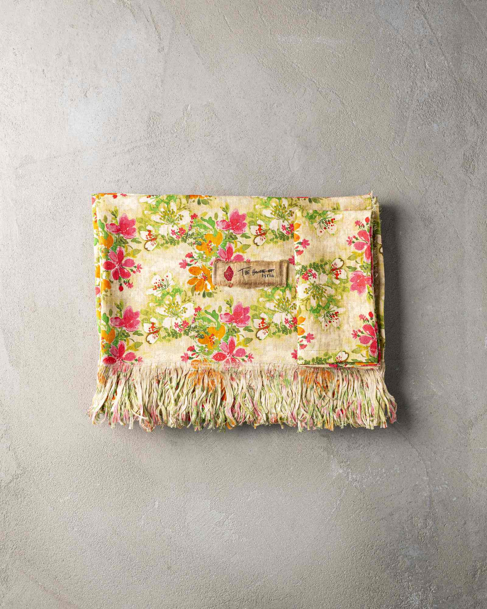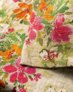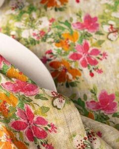 Tovagliolo in lino. La superficie si anima attraverso una stampa floreale che si diffonde nella trama con naturale vitalità, come pennellate leggere che emergono con spontaneità. Fiori vibranti affiorano come presenze luminose, creando una composizione viva che si apre tra materia e immaginazione.