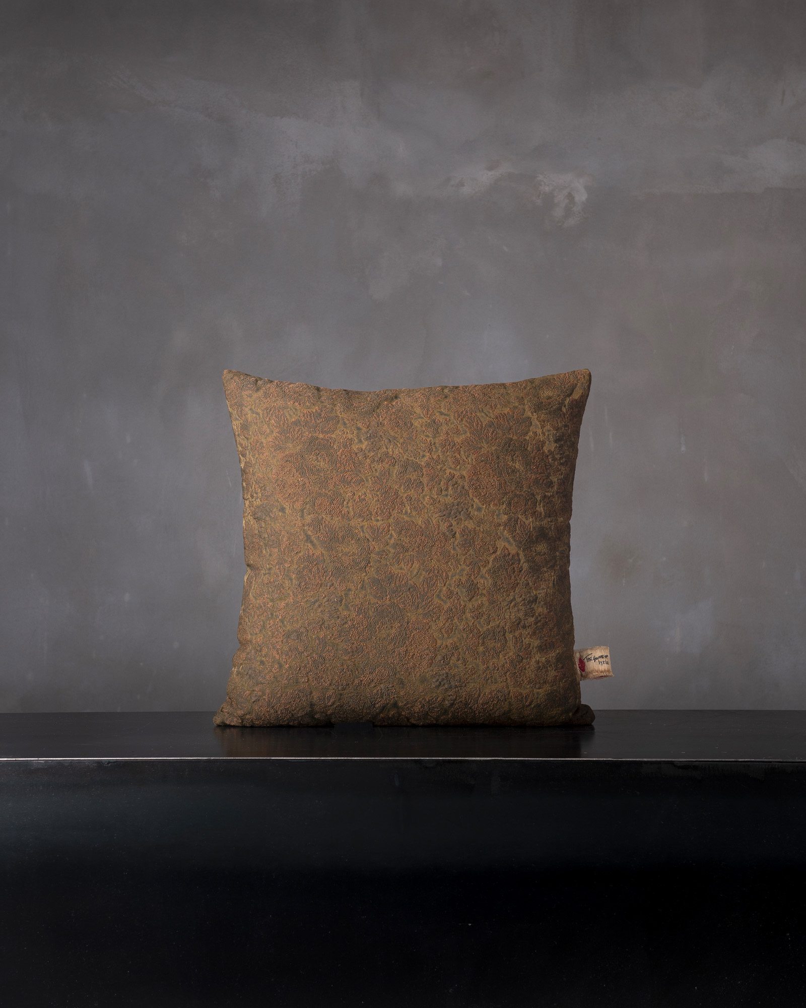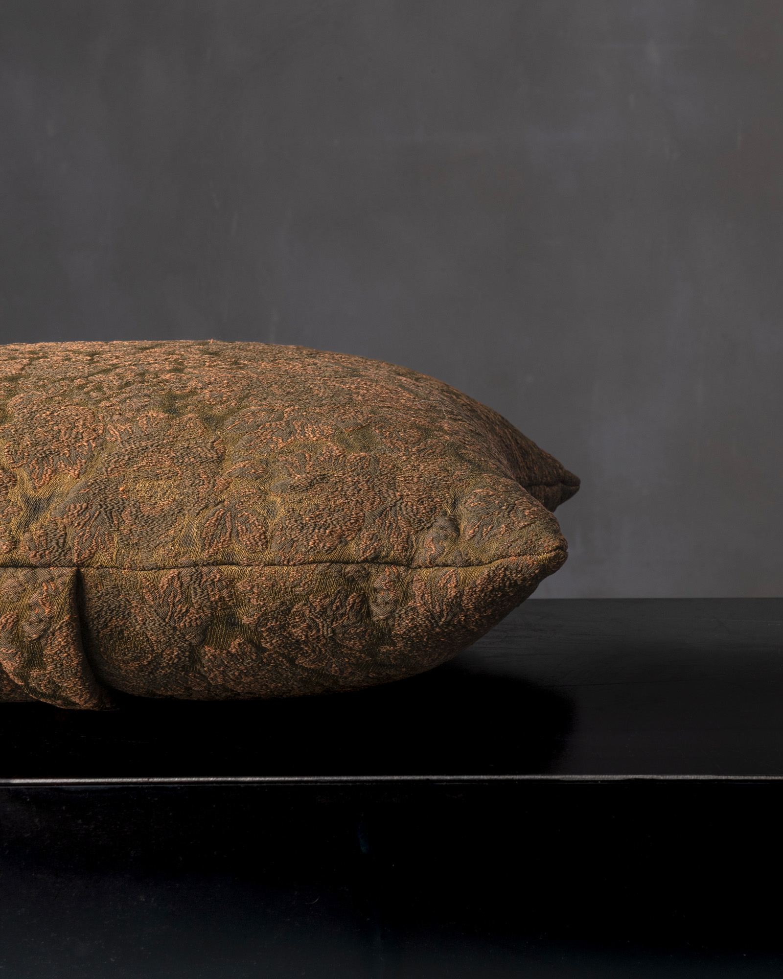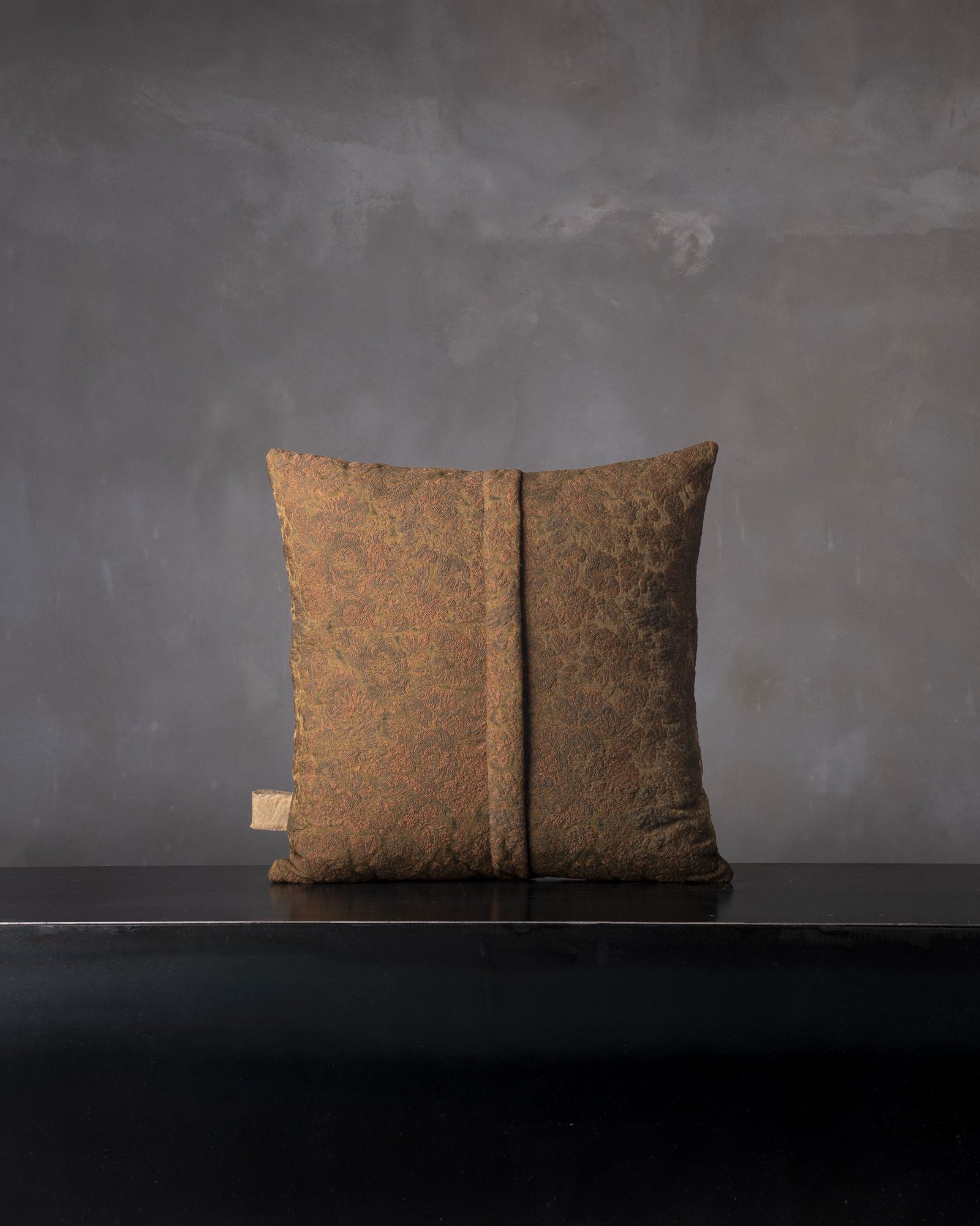 Decorative cushion in viscose. The graphic pattern develops with structure and depth across the compact surface, evoking an ancient elegance reinterpreted with contemporary sensibility. The material comes alive like a mark incised in time, conveying an intense and silent presence.