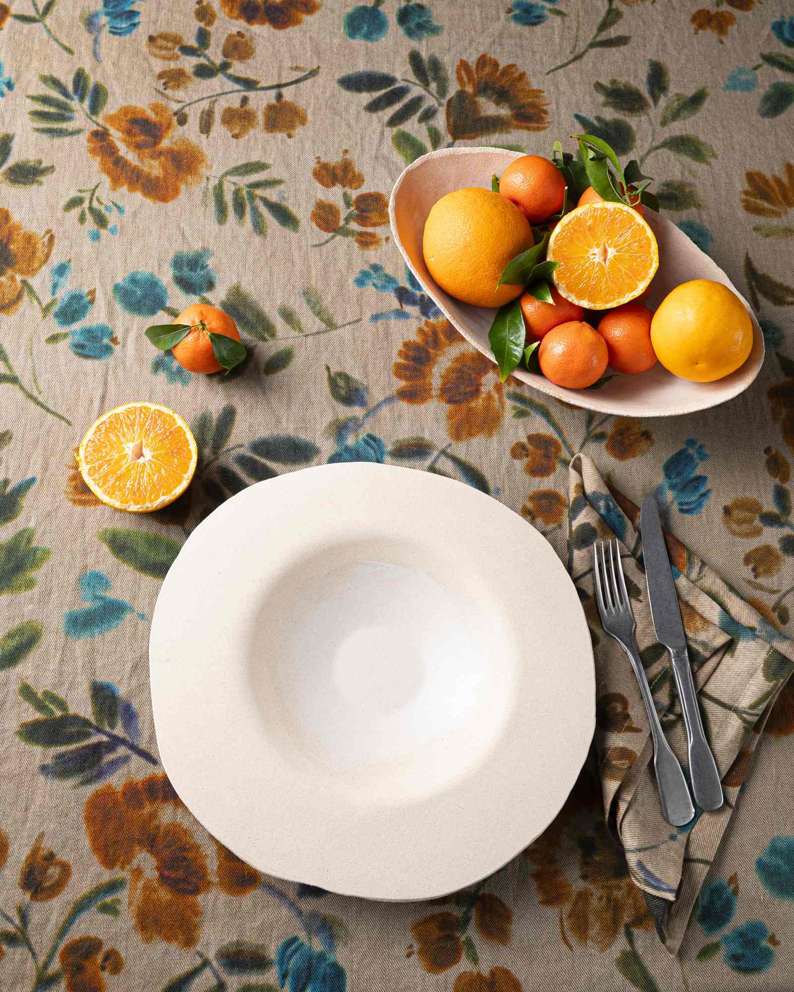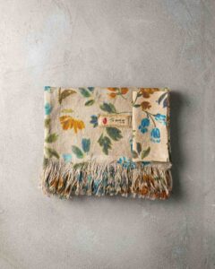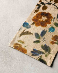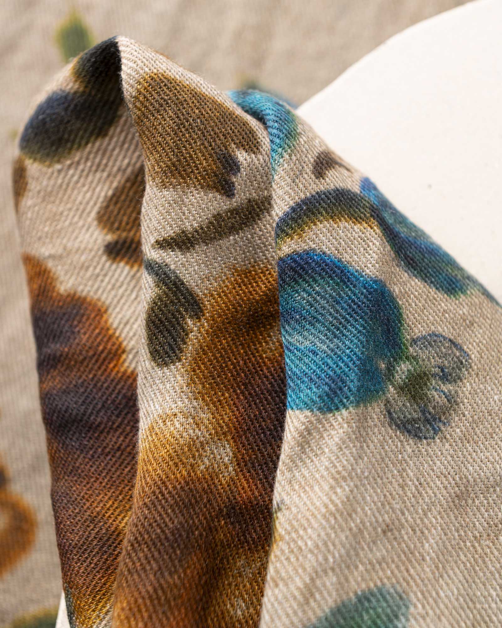 Napkin in linen. The compact surface receives a floral print that develops with lightness, like hand-painted strokes that emerge in the weave with natural harmony. Airy flowers surface like suspended marks, creating a delicate composition that moves between material and light.