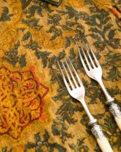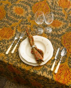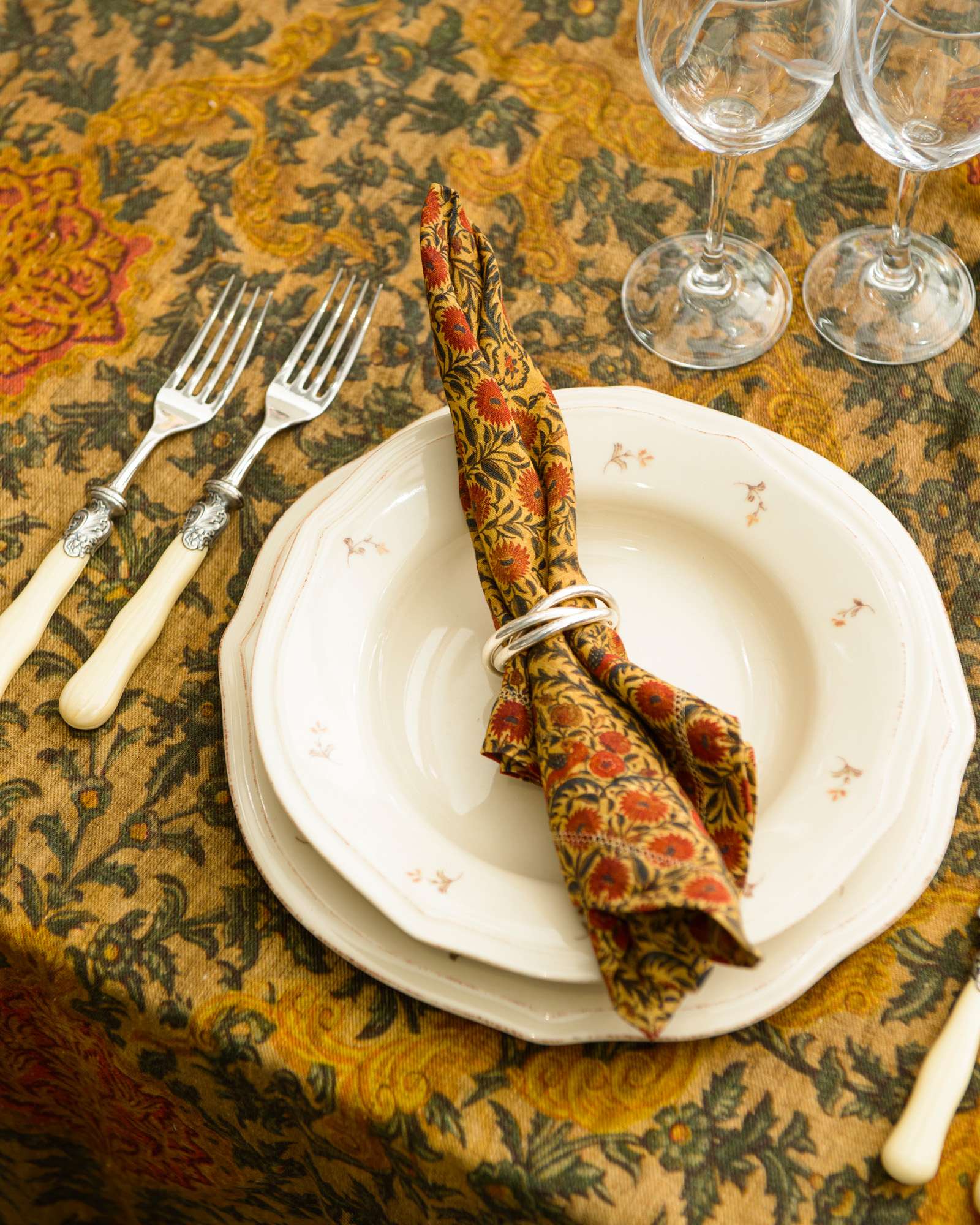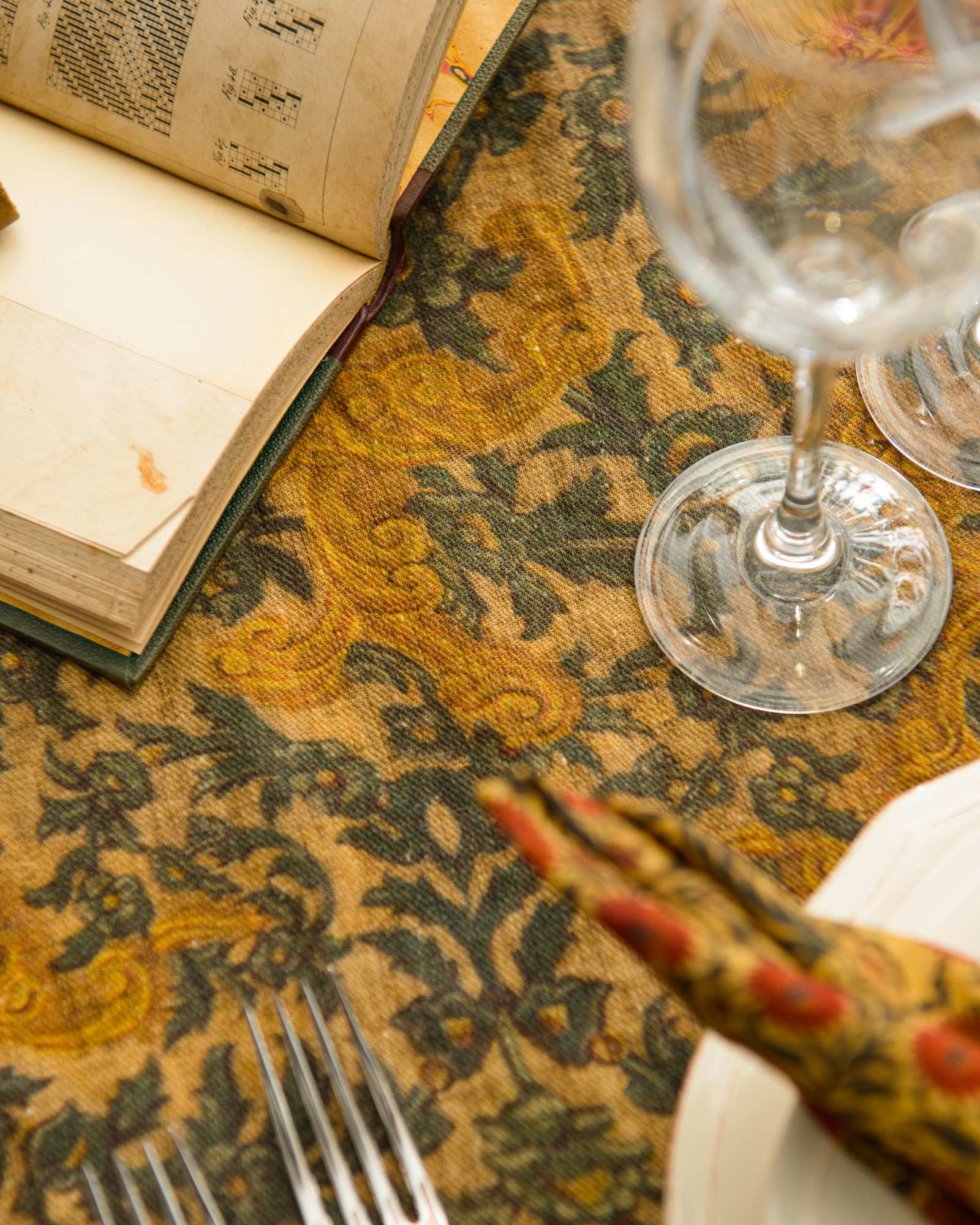 Tablecloth in linen. The pattern develops with rhythm across the fluid surface, reinterpreting baroque suggestions in a light and contemporary material. Subtle ornaments surface like suspended traces, creating a silent balance between decorative richness and natural harmony.