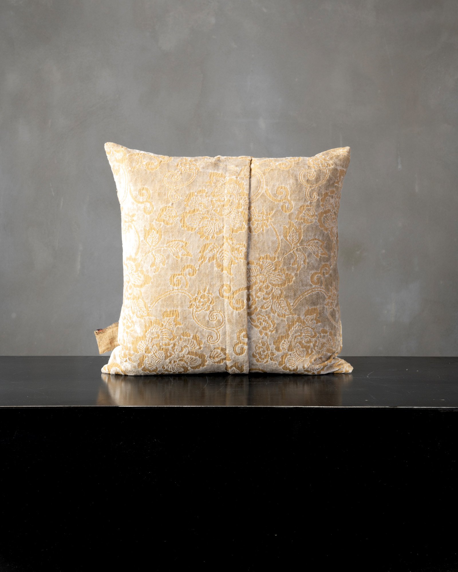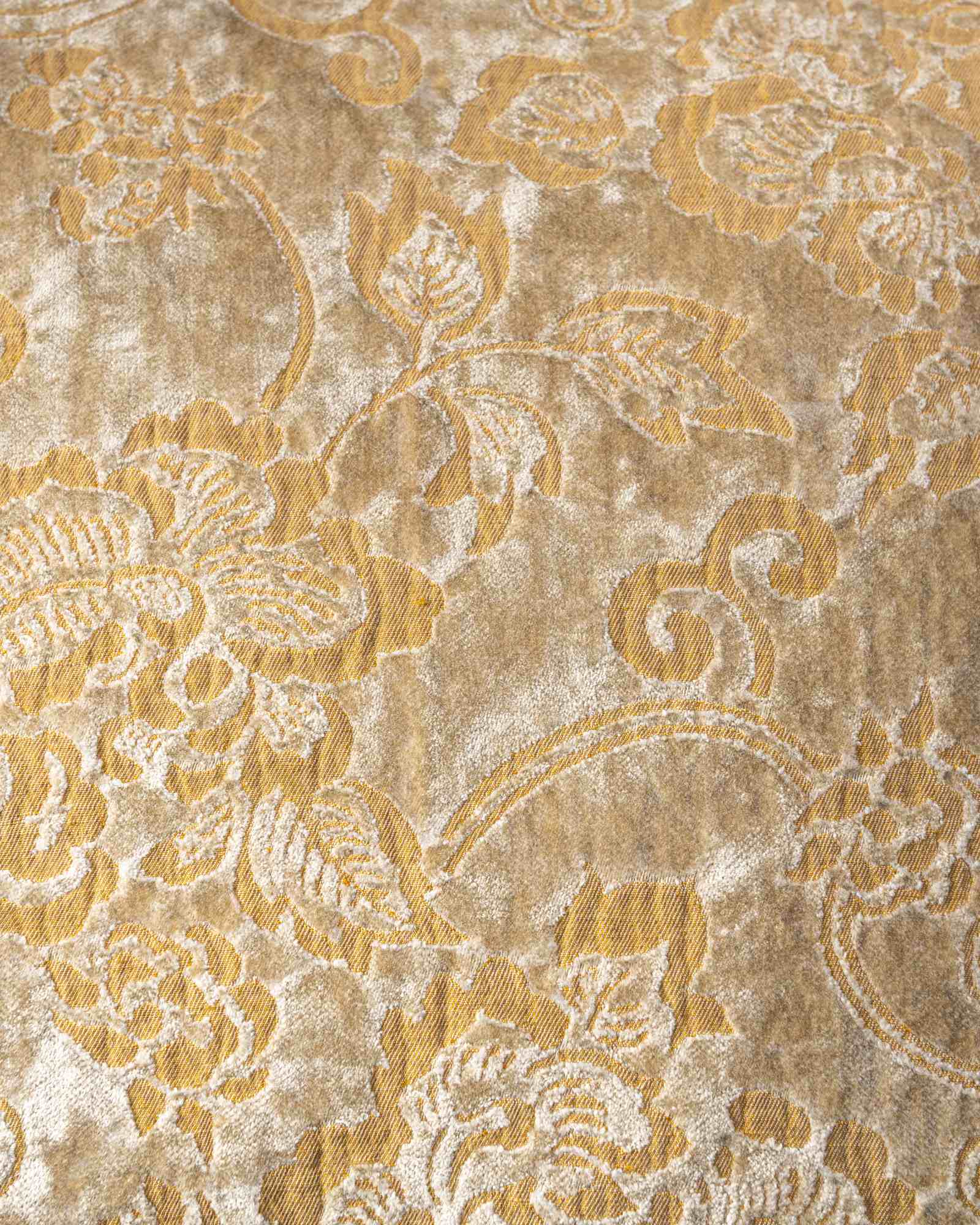 Decorative cushion in viscose and cotton. The soft surface receives a floral jacquard pattern that emerges with an irregular luminosity, creating a rich material in continuous transformation. Light settles and disperses between the weaves, like a living reflection that transforms every detail into a unique variation.