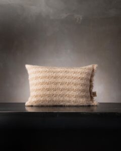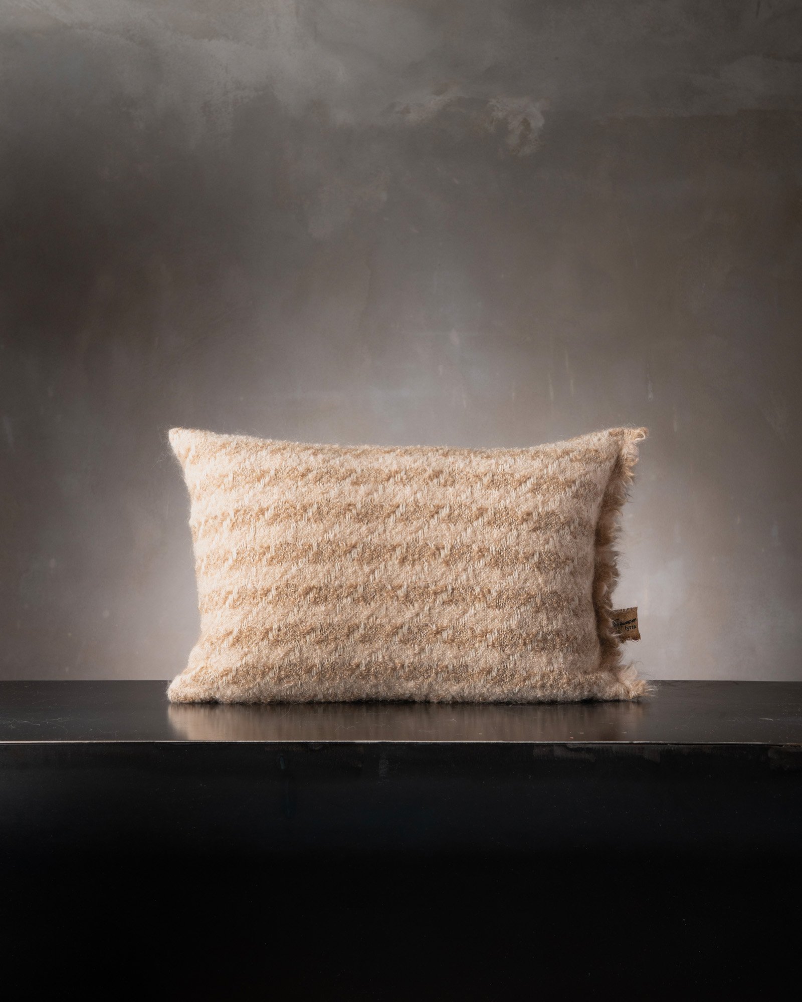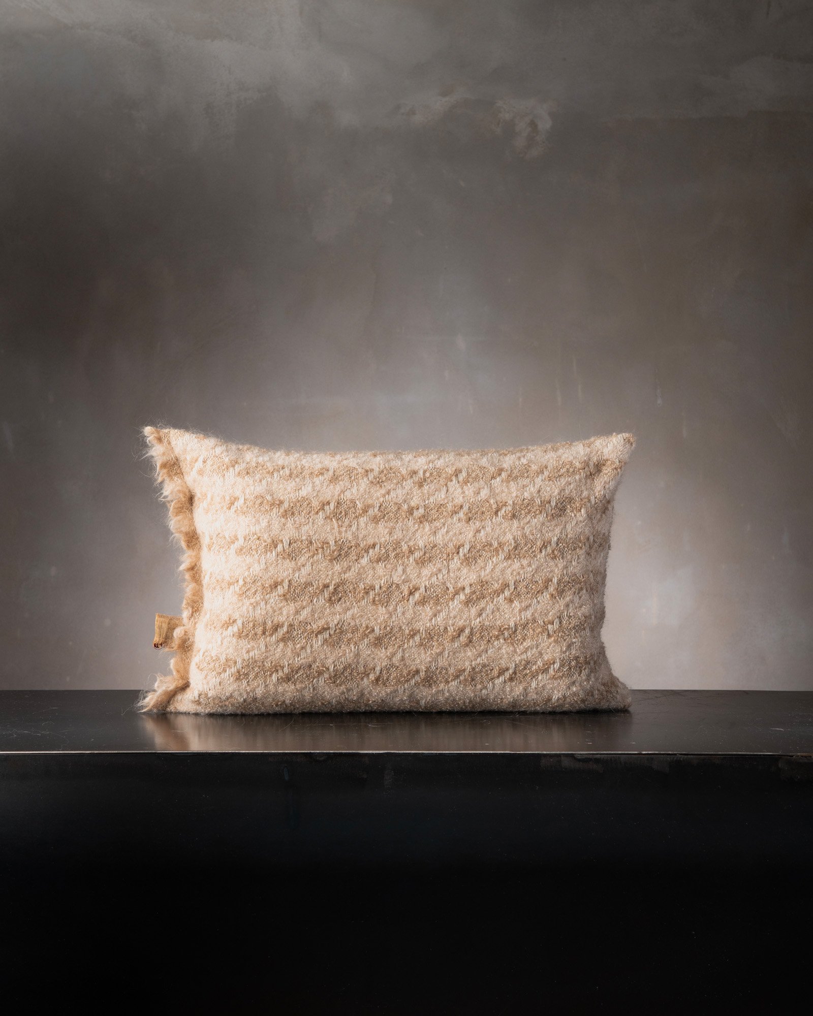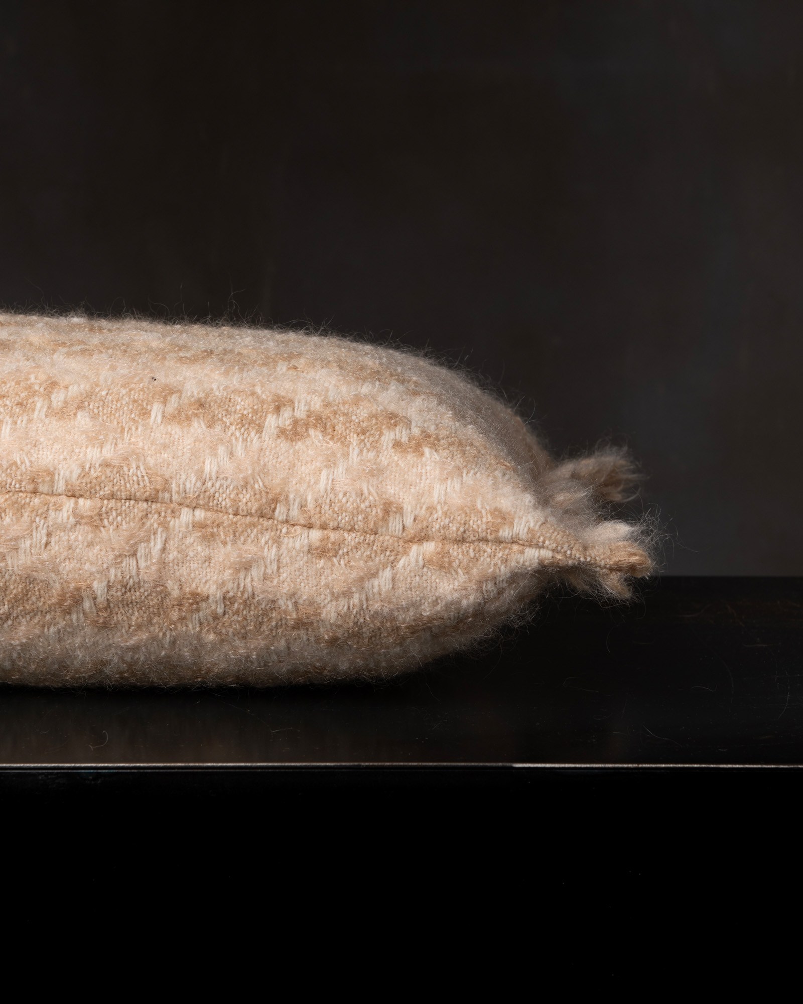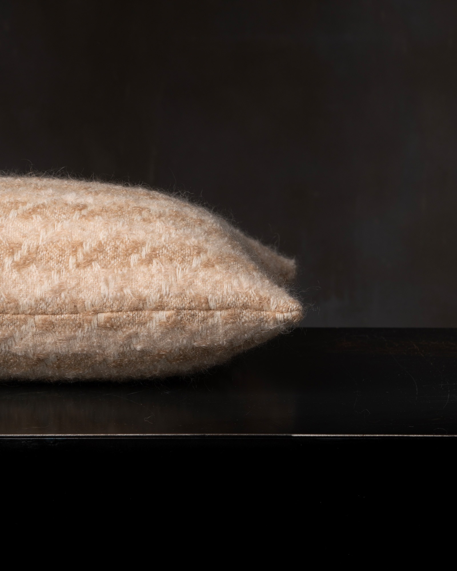 Decorative cushion in mohair. The structured motif develops across the compact surface with a precise graphic rhythm, giving life to a deep and balanced material. The houndstooth pattern surfaces with discretion, like a timeless mark that renews itself in the softness of the fibre.