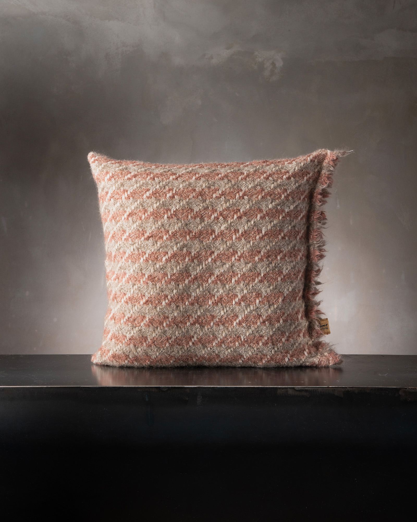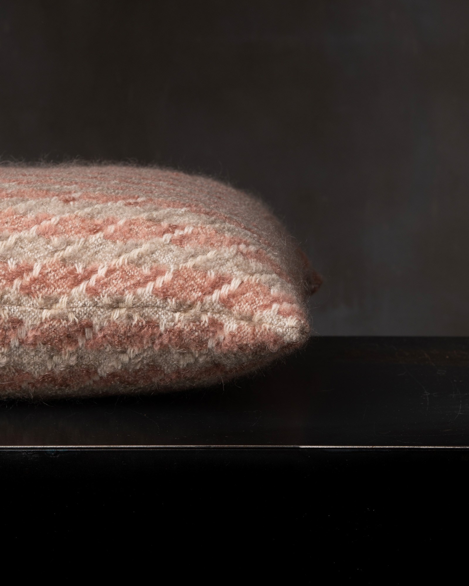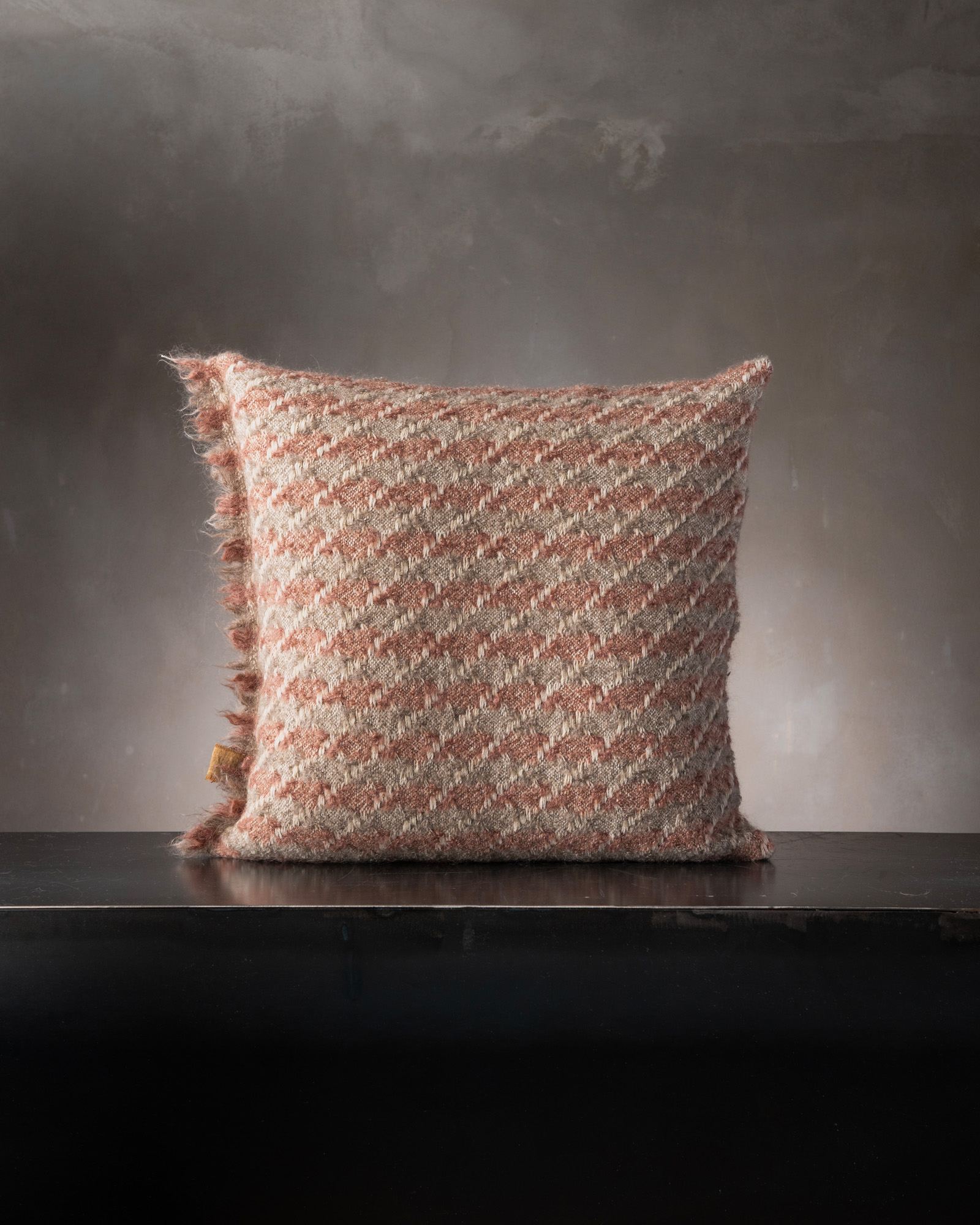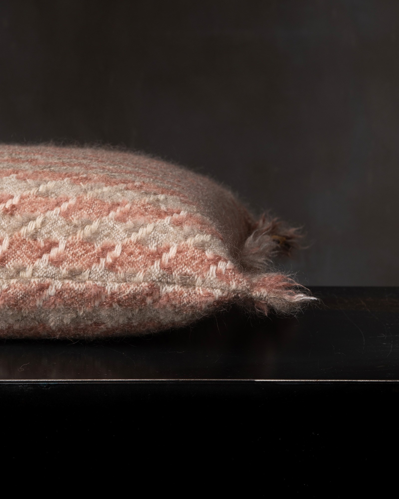 Decorative cushion in mohair. The structured motif develops across the compact surface with a precise graphic rhythm, giving life to a deep and balanced material. The houndstooth pattern surfaces with discretion, like a timeless mark that renews itself in the softness of the fibre.