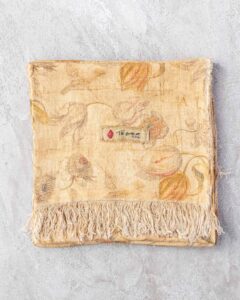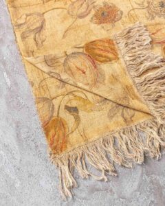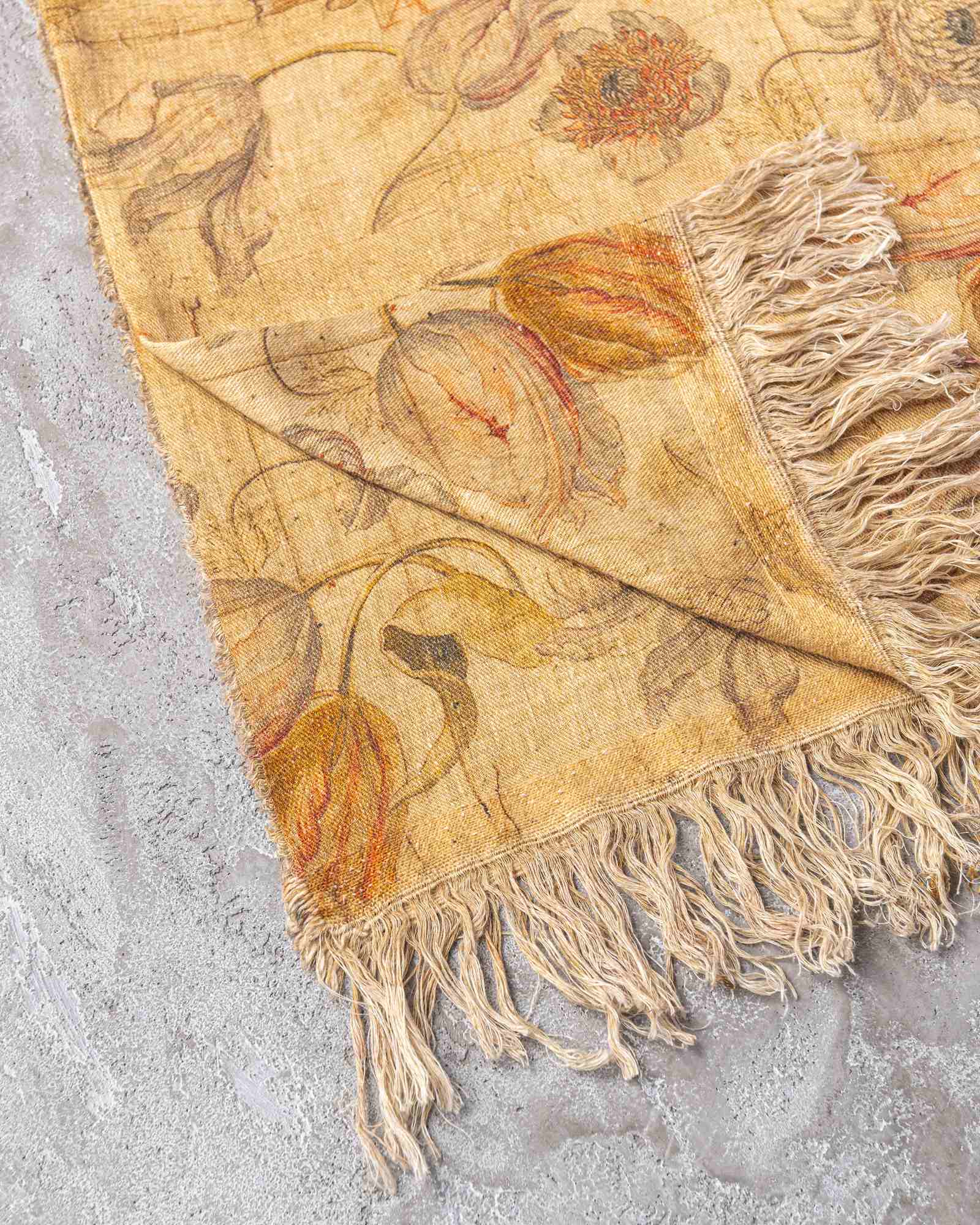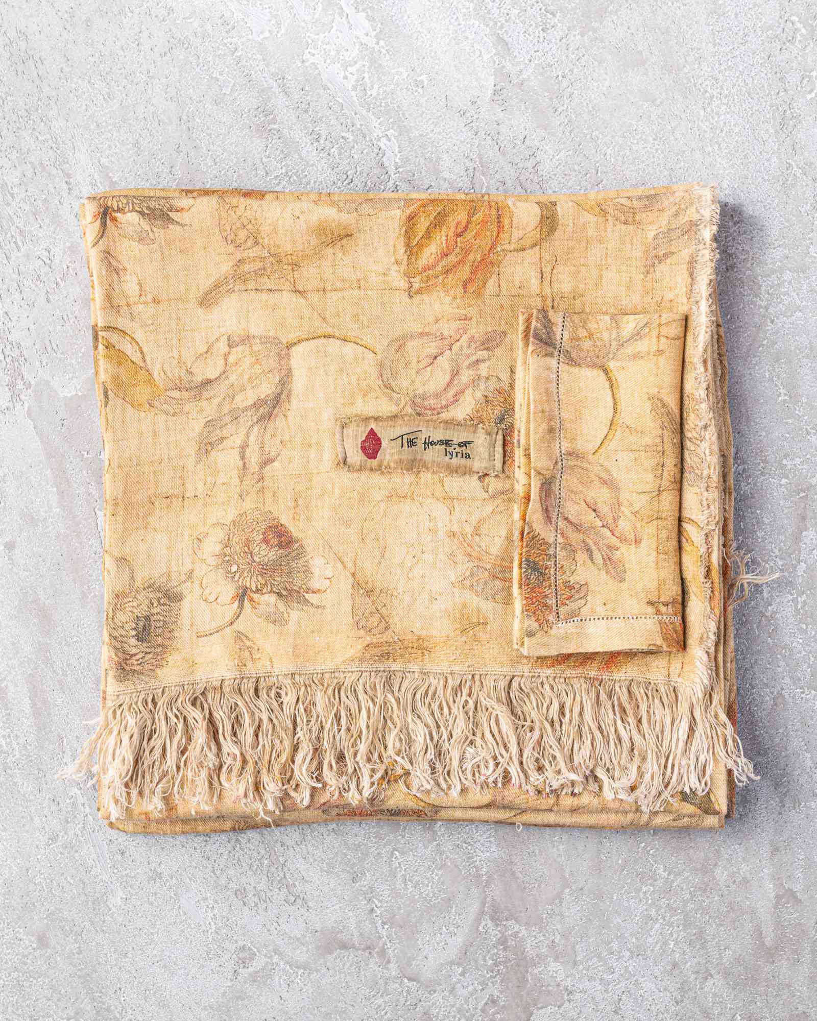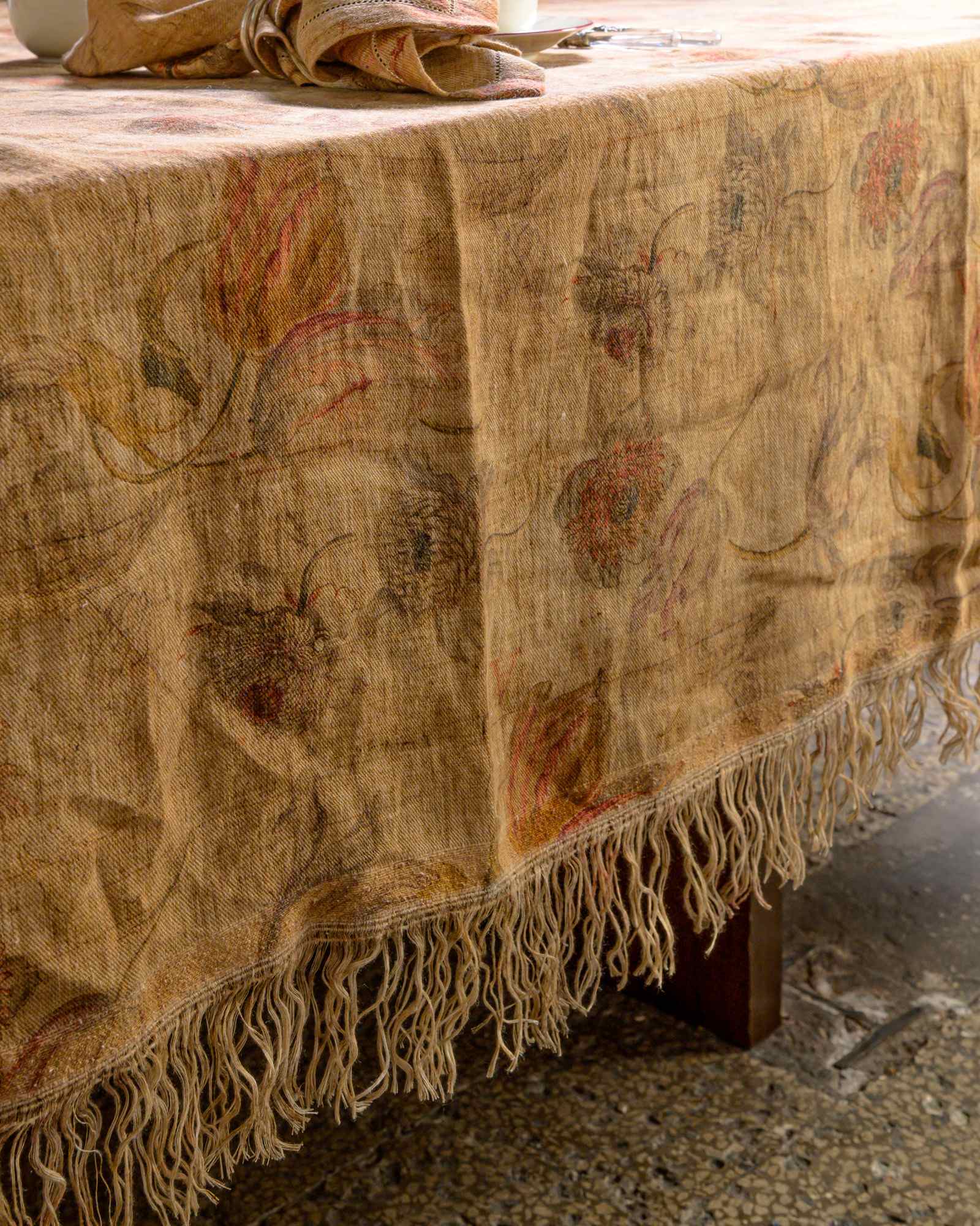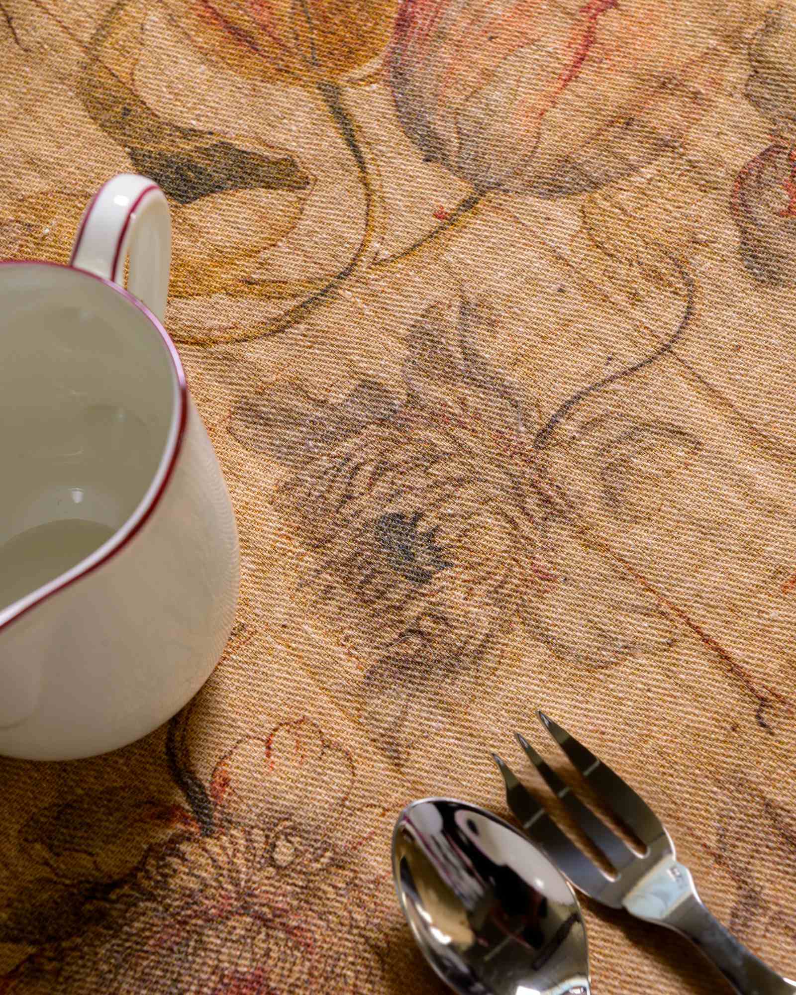 Tablecloth in linen. The surface spreads with lightness, traversed by a floral pattern that emerges with discretion in the weave, as if suspended in the material. A subtle veil envelops the fabric, evoking a fluid and silent presence that accompanies the table with natural elegance.