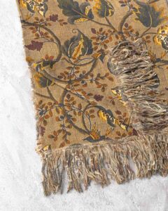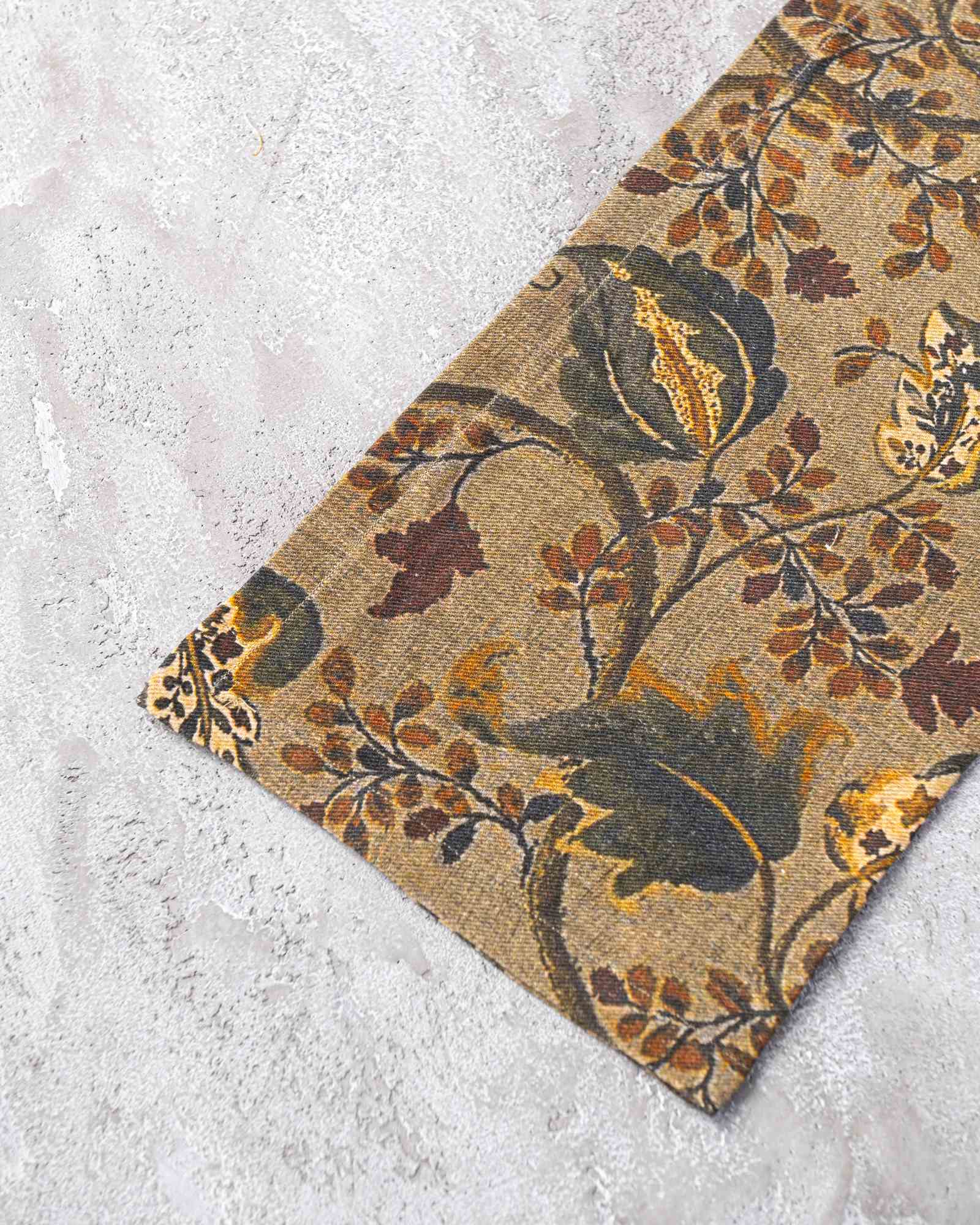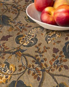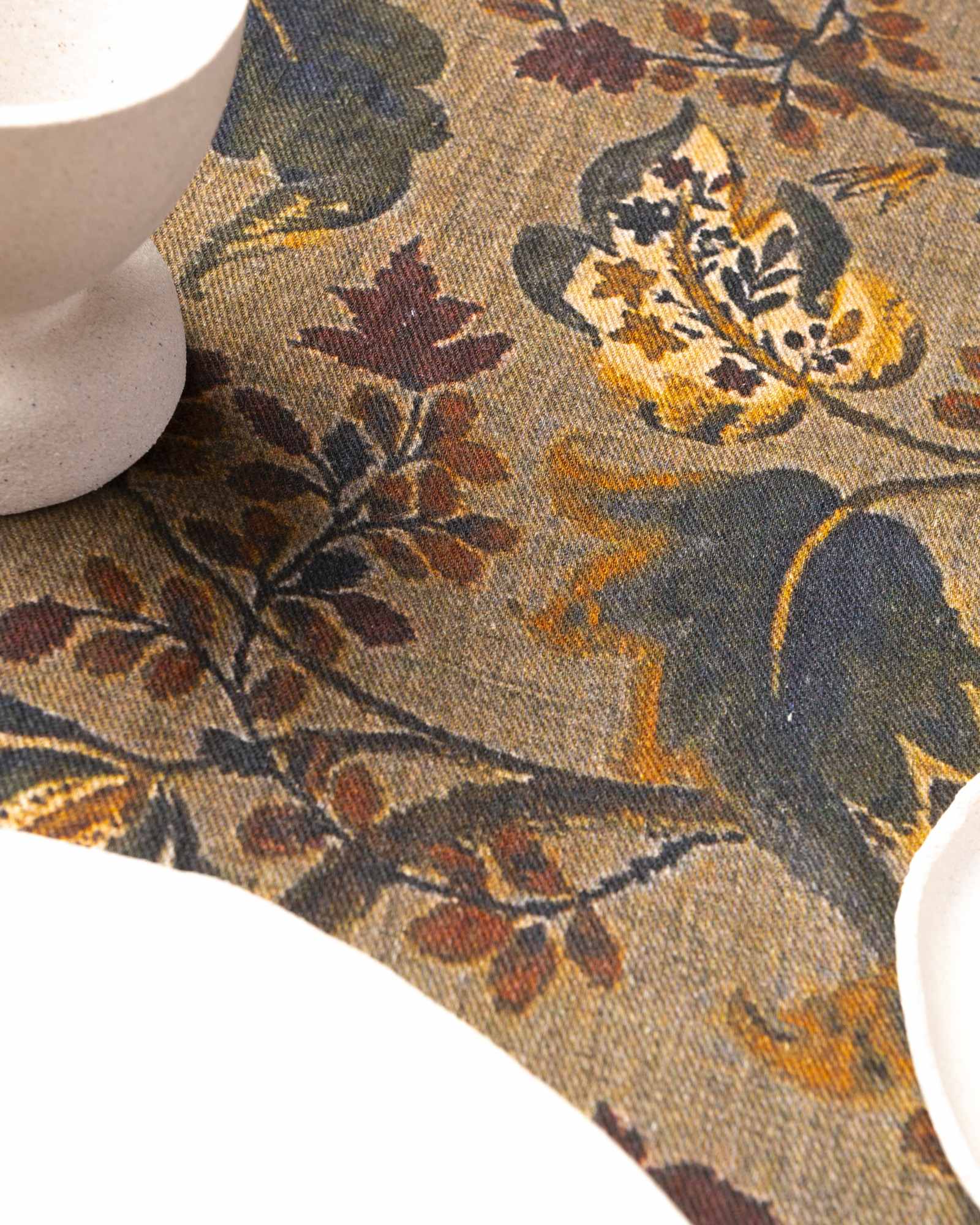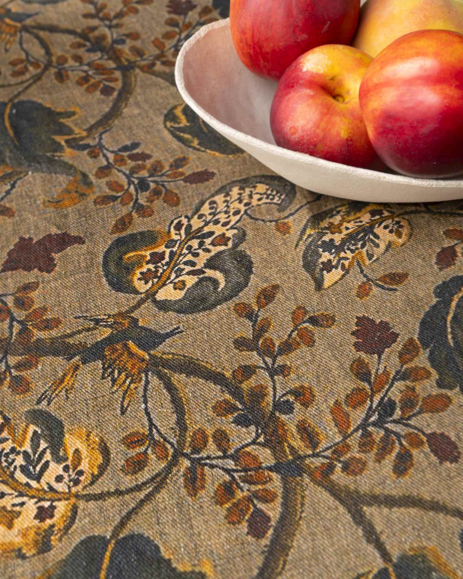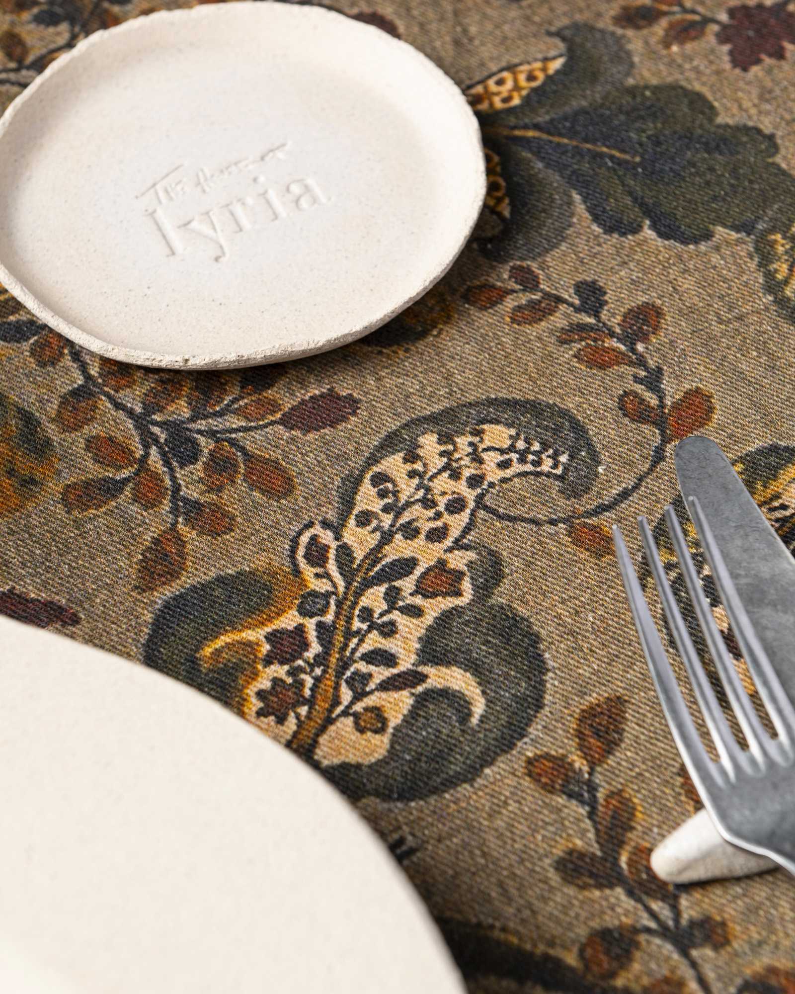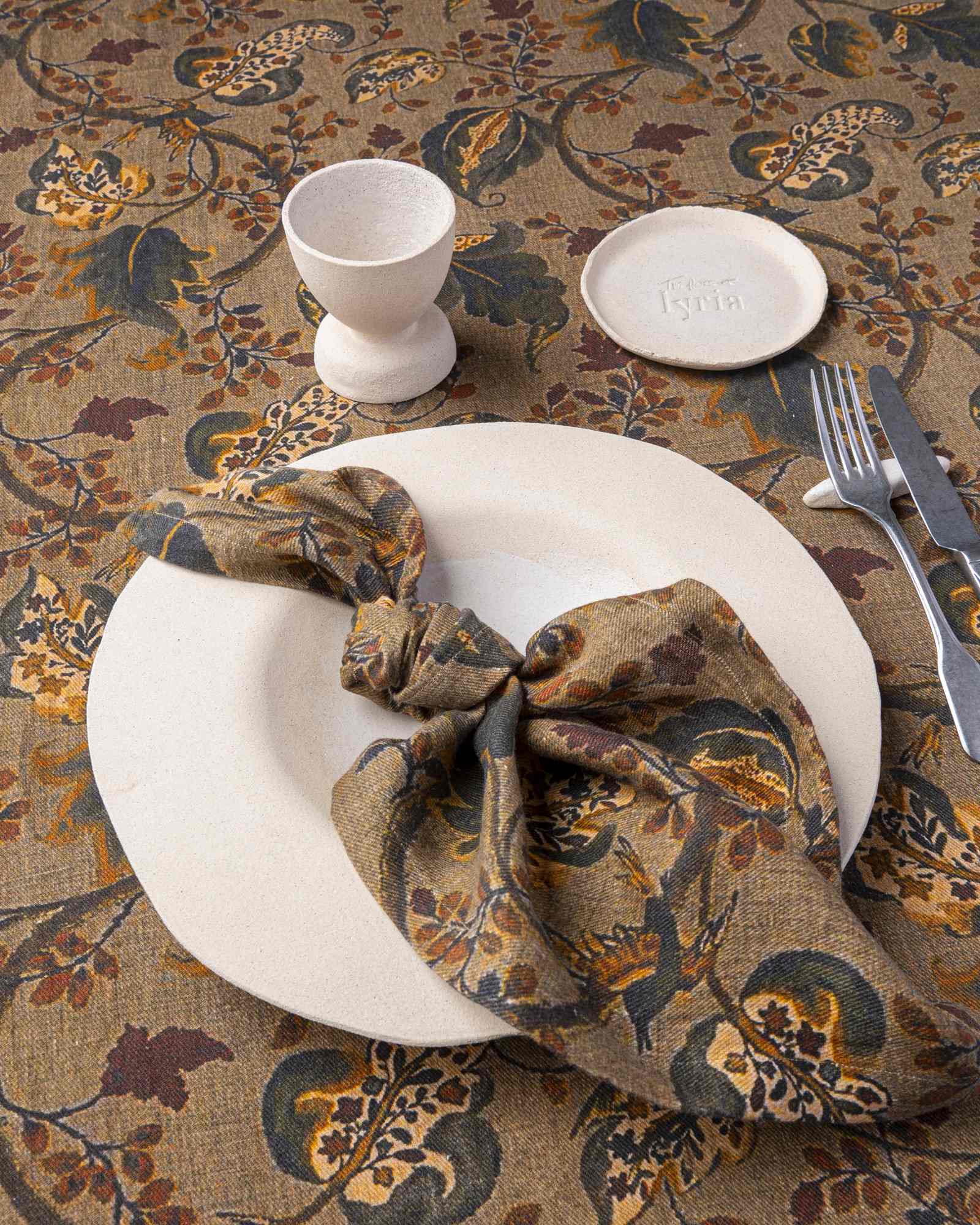 Tablecloth in linen. The surface spreads with lightness, receiving a botanical pattern that emerges with natural depth among irregular nuances and moving shadows. Vegetal forms surface like living traces, composing a silent landscape that transforms with discreet continuity.
