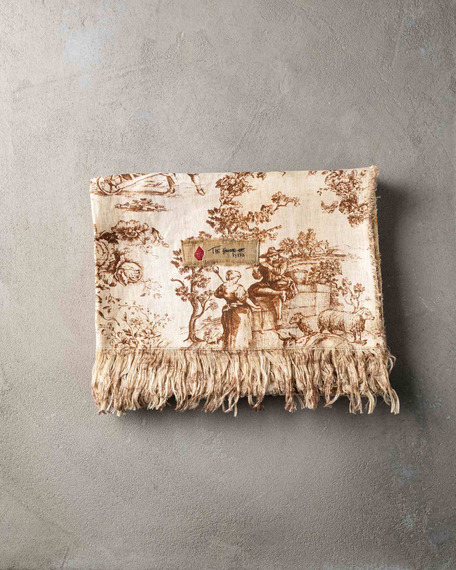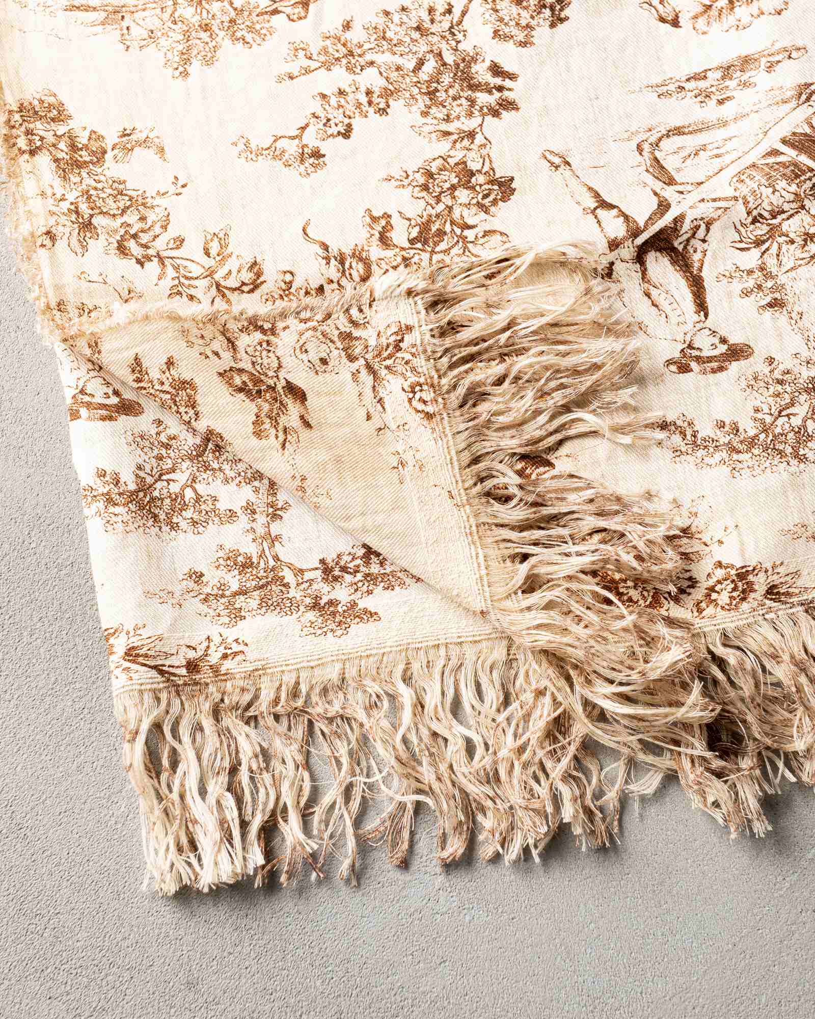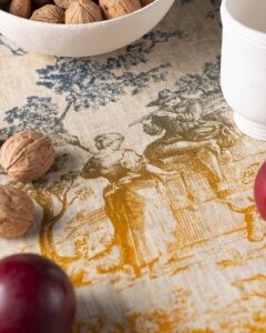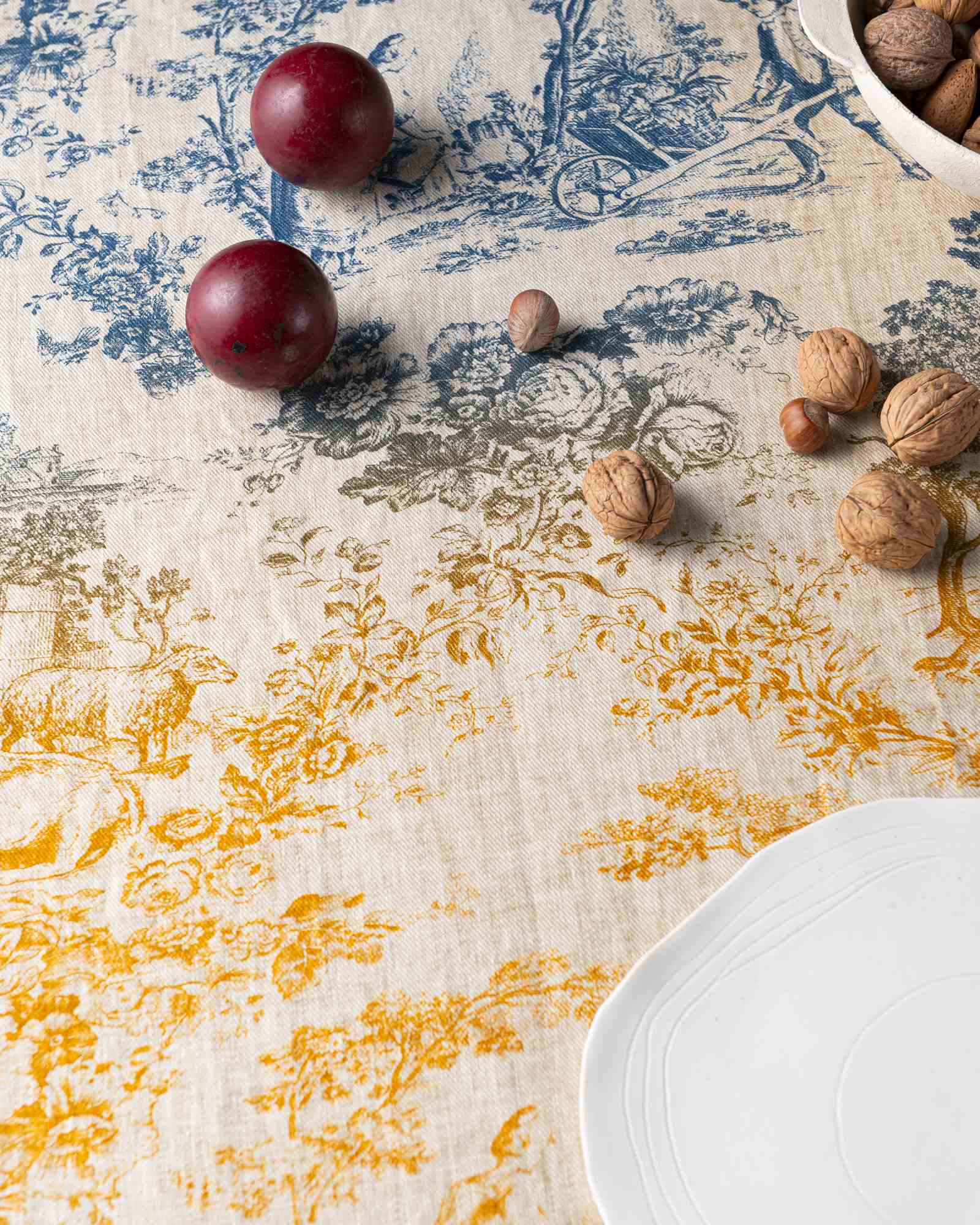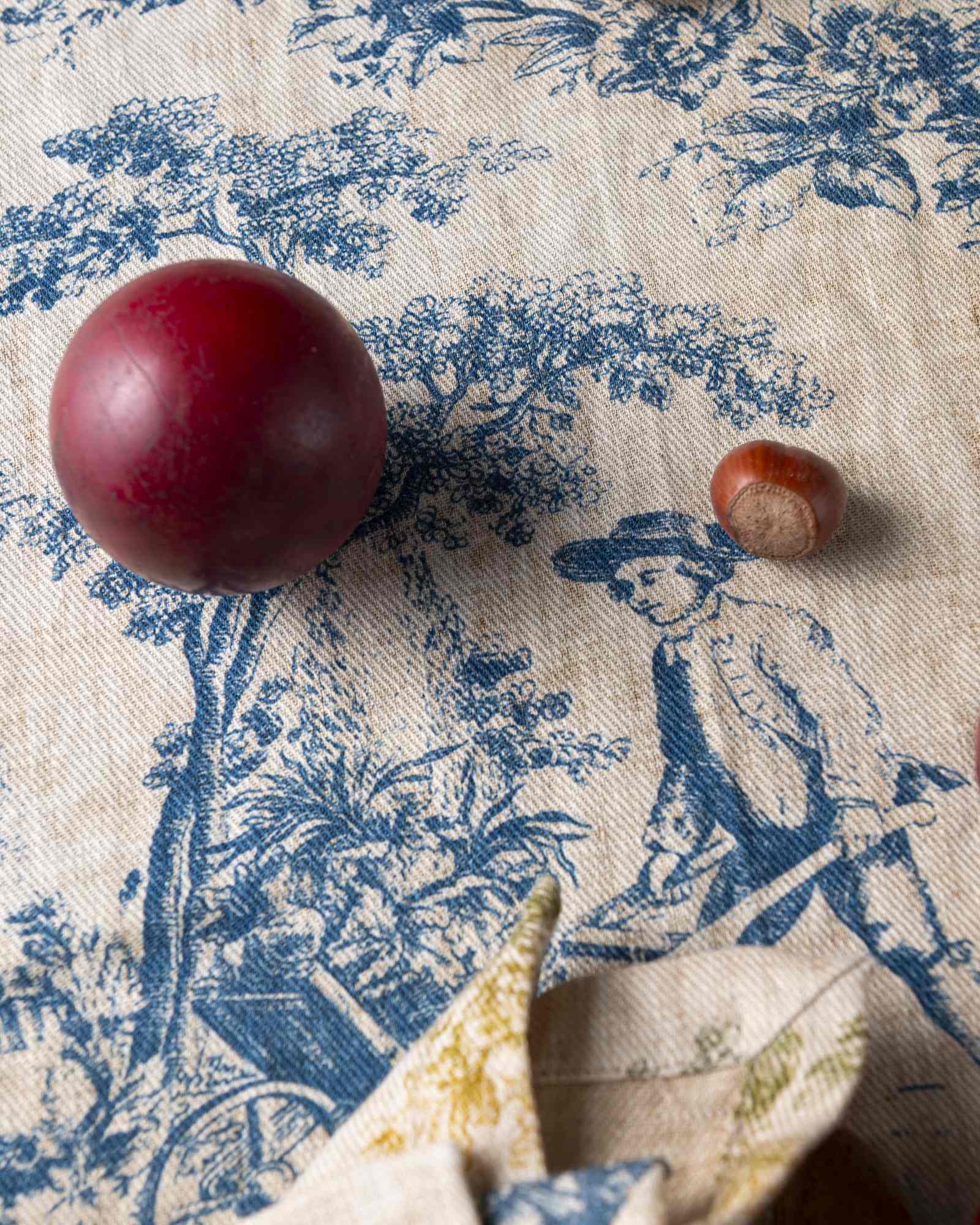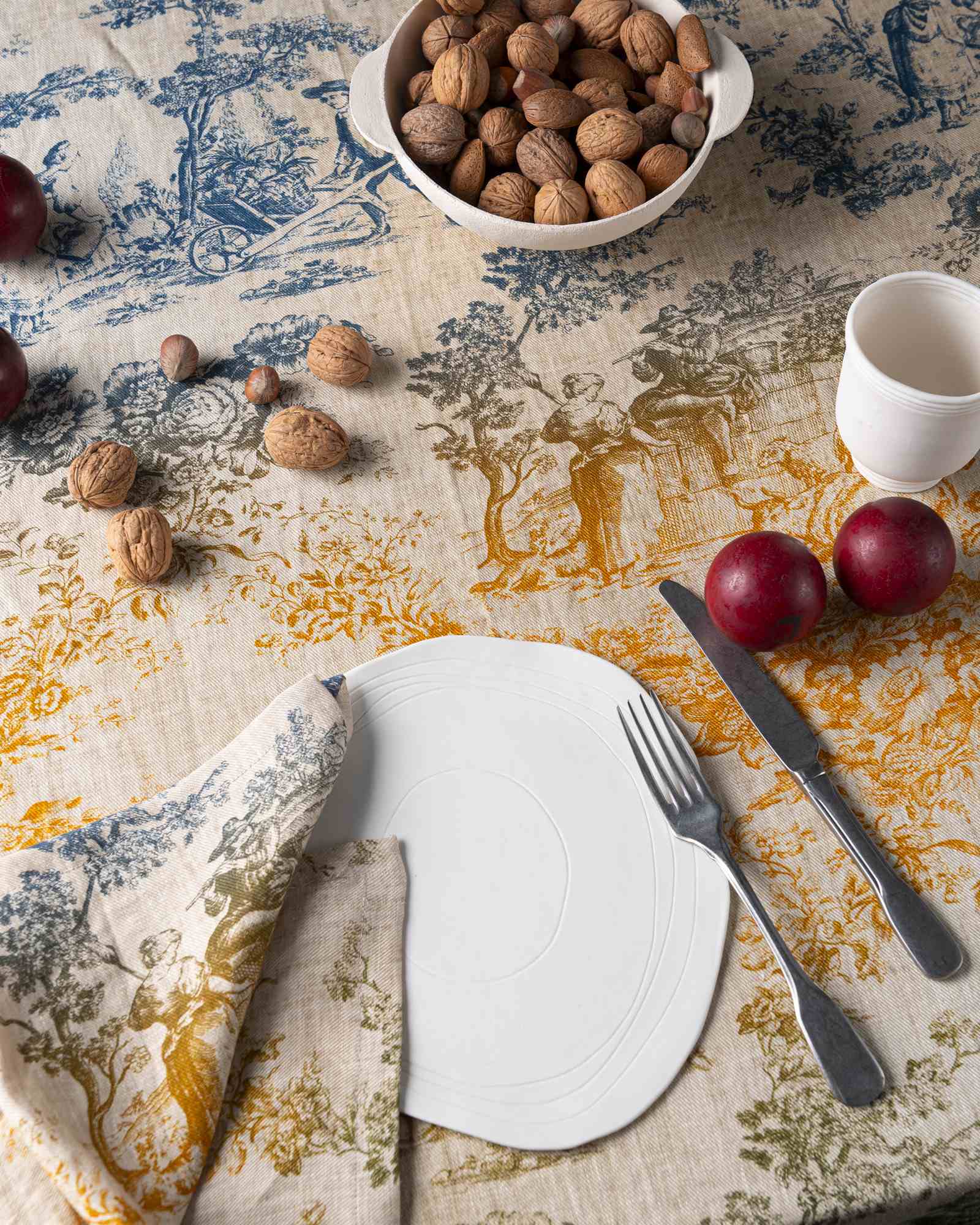 Tablecloth in linen. The pattern is born from a contemporary reinterpretation of toile de jouy, developing across the surface with fluid rhythm and narrative depth. Light scenes surface in the weave like suspended fragments, creating a textile narrative that unites memory and vision with discreet elegance.