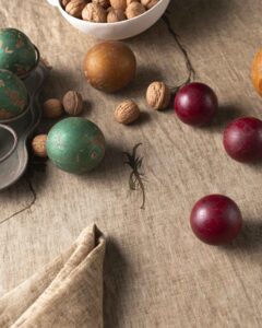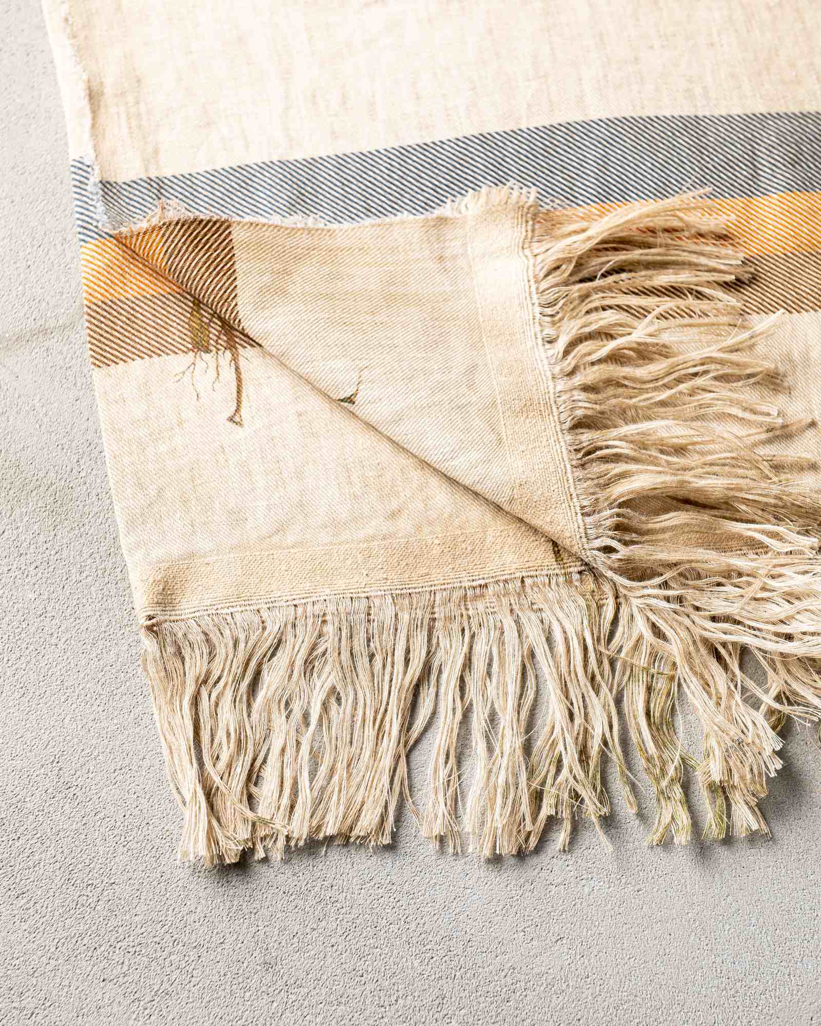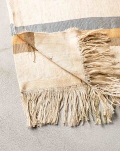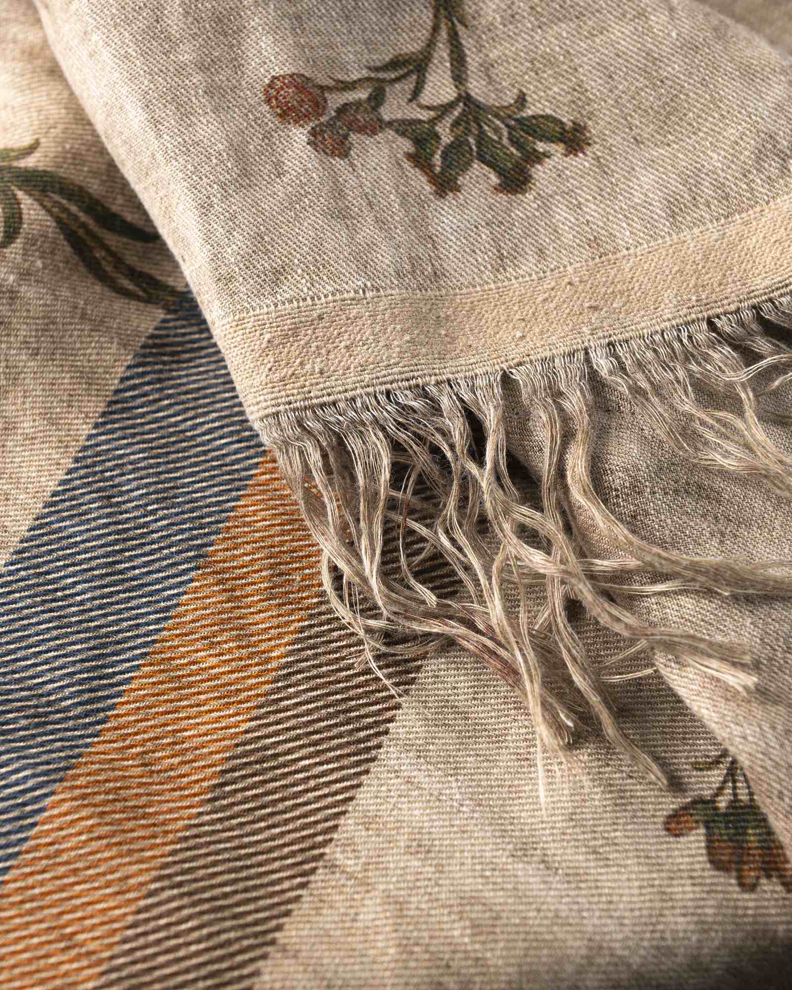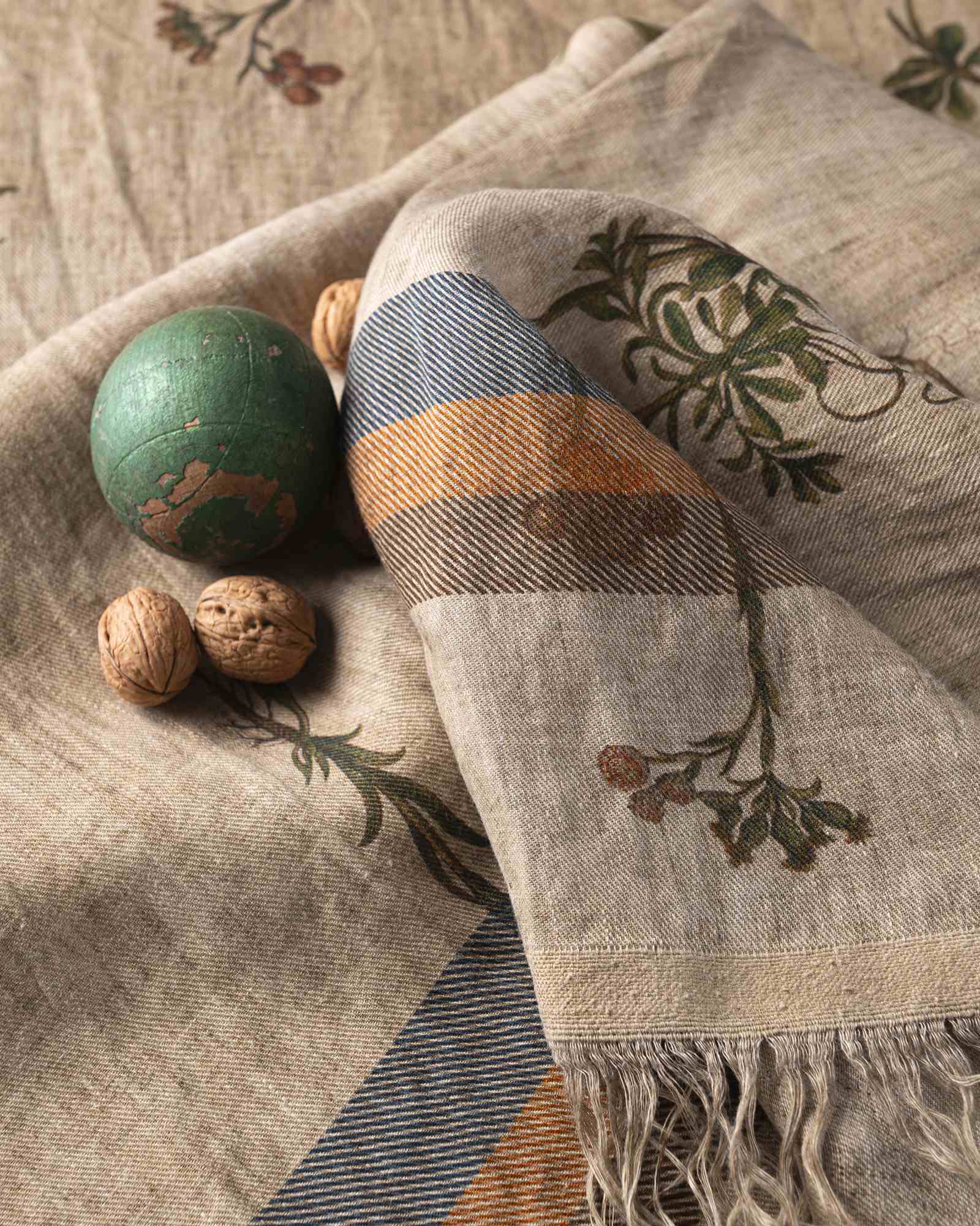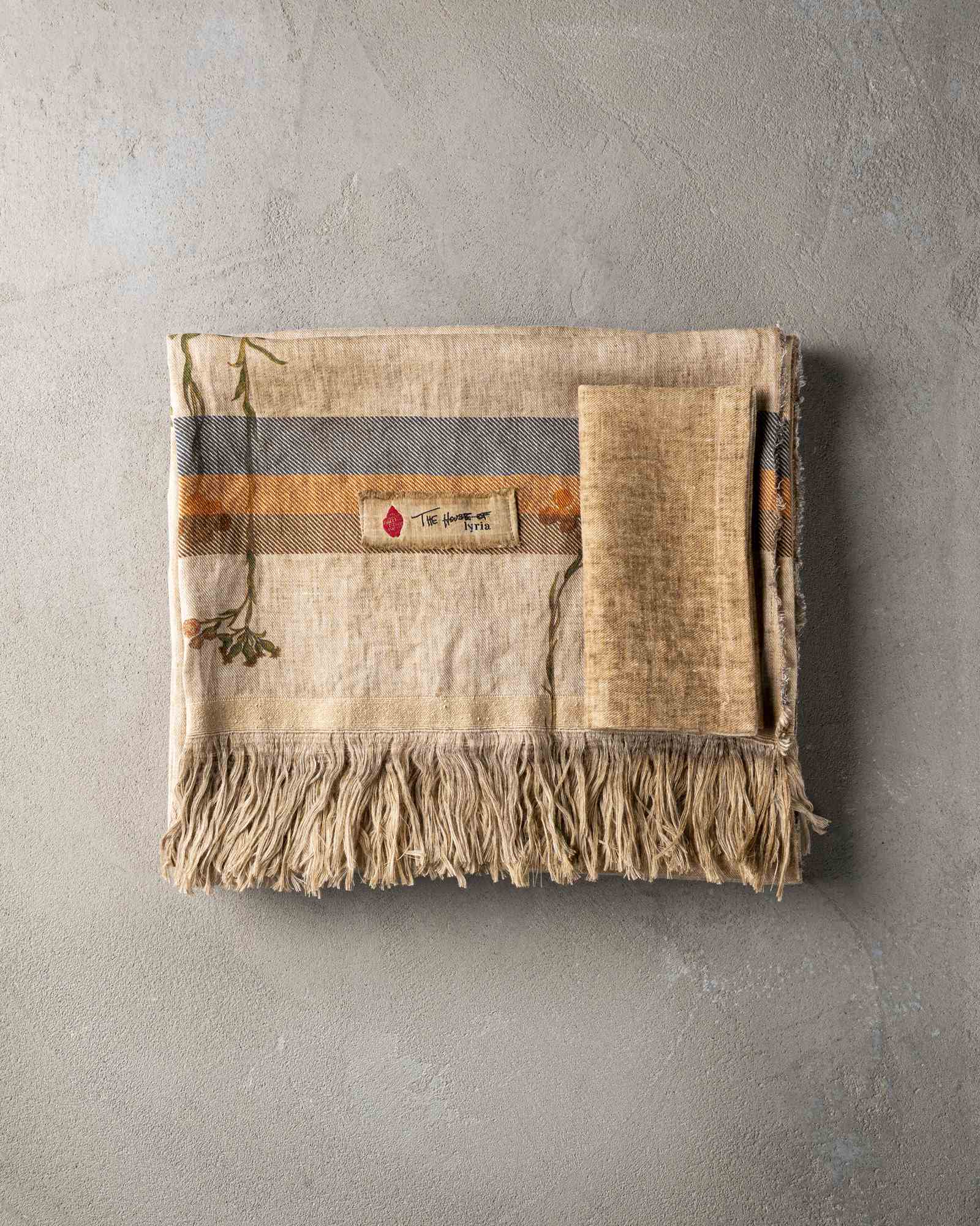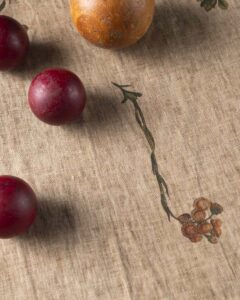 Tablecloth in linen. The surface develops with lightness, receiving a botanical pattern that seems to float in the weave with natural suspension. Delicate forms surface as ethereal presences, creating a silent atmosphere where the material dissolves in light.