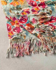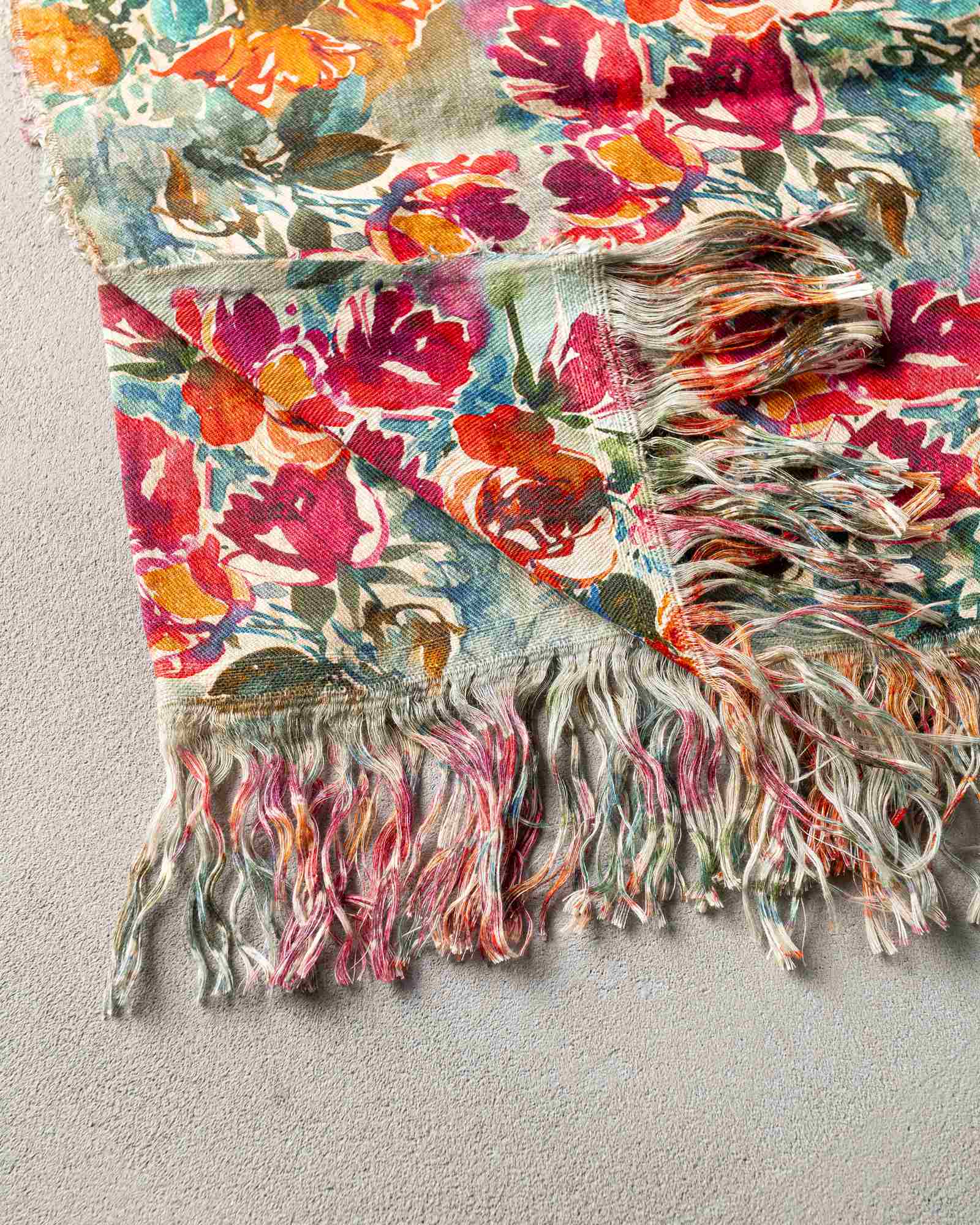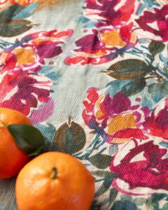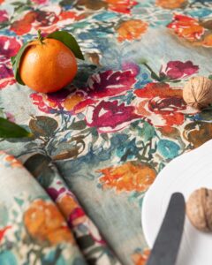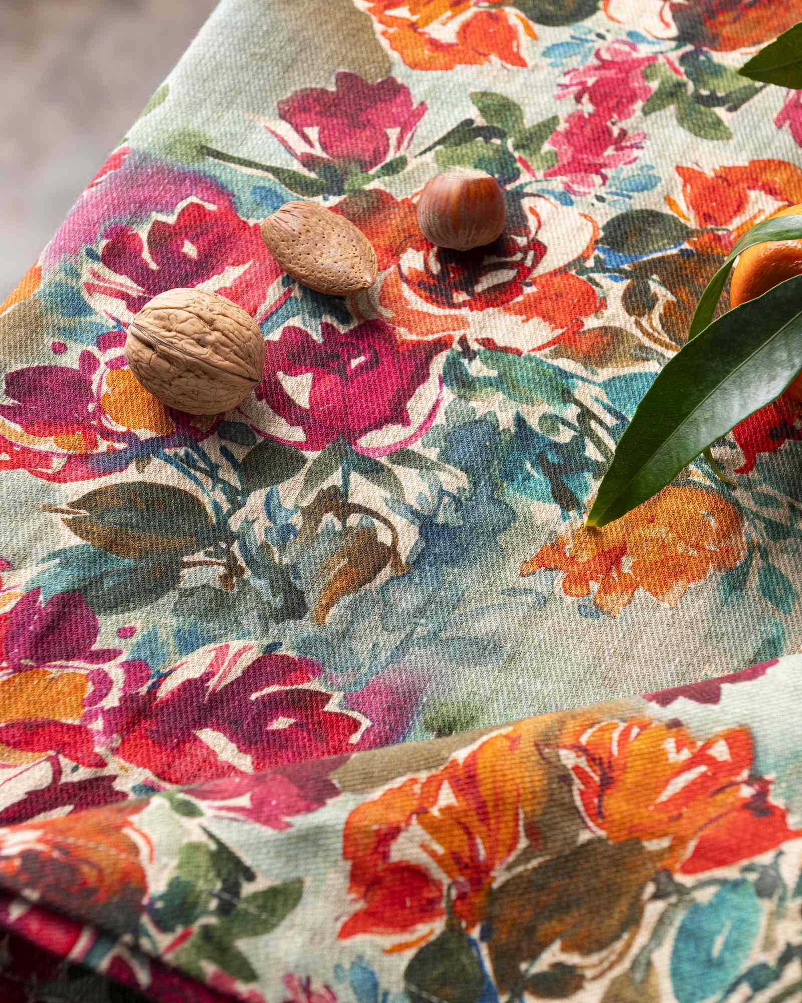 Tablecloth in linen. The surface receives a floral pattern that expresses itself with intensity and natural movement, as if painted directly in the weave. Vibrant flowers surface with lightness, creating a living composition that opens in the space like a spontaneous and luminous gesture.