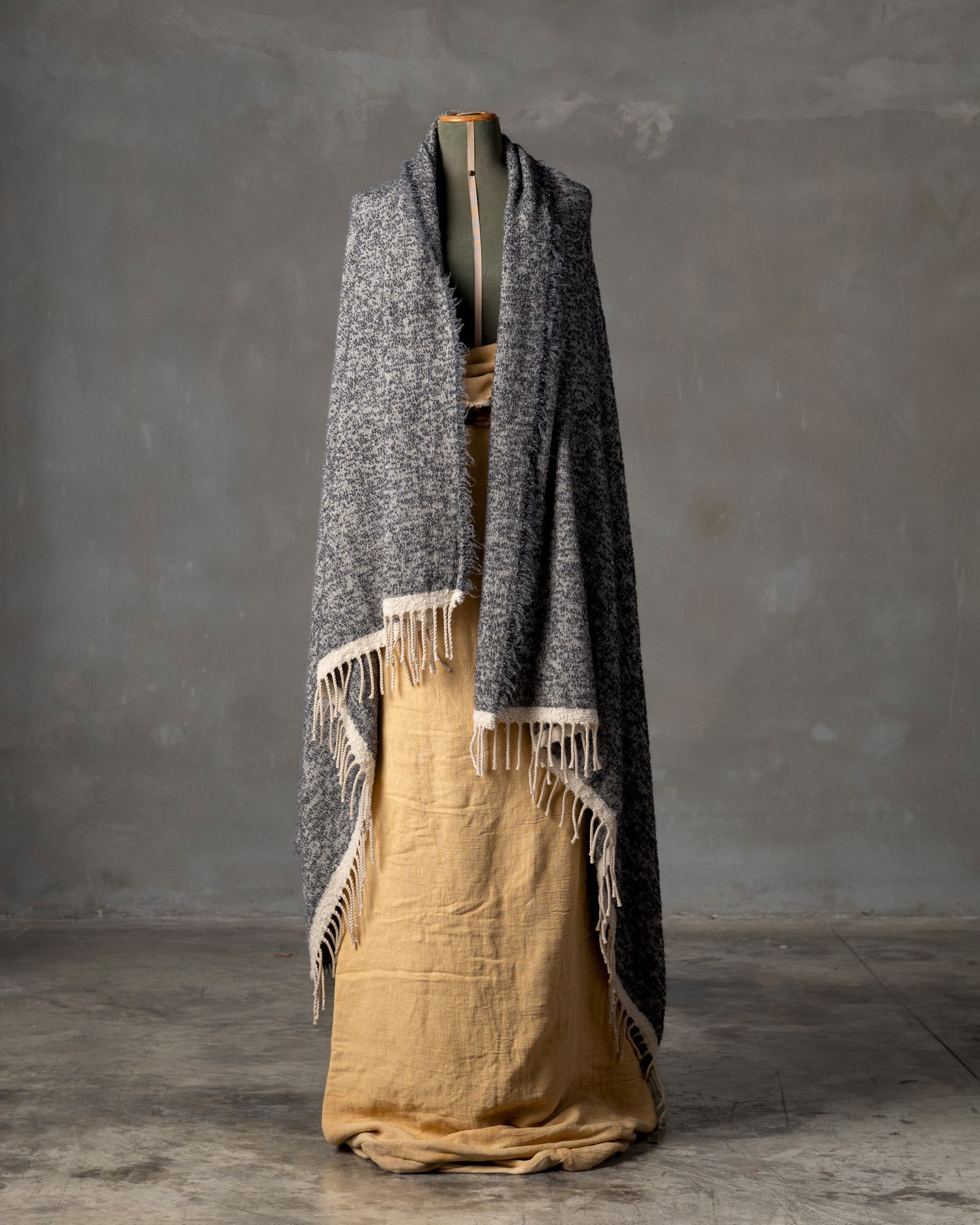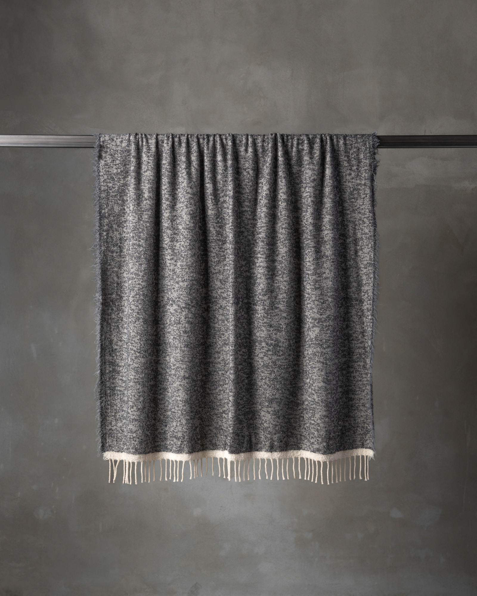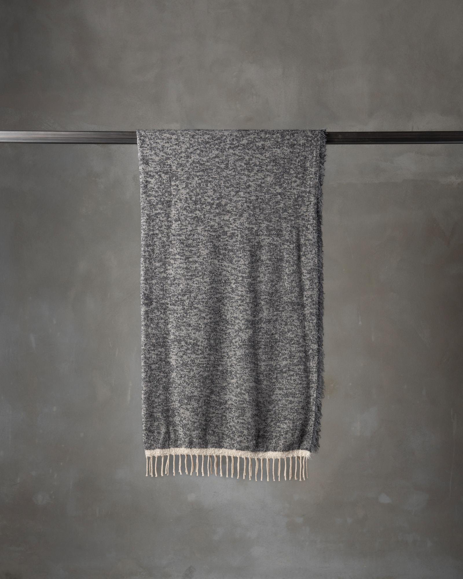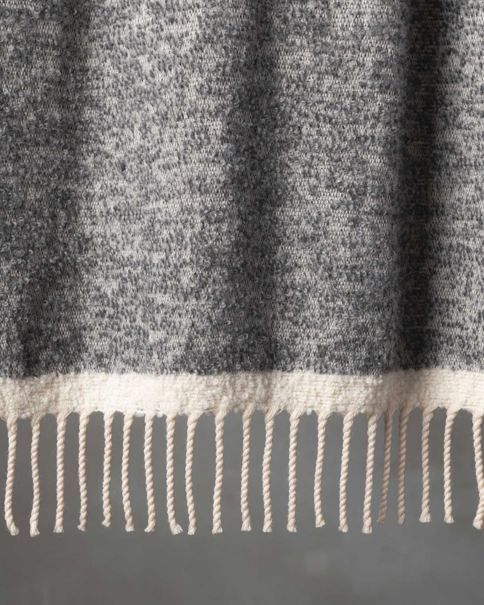 Throw in virgin wool and camel. The graphic motif develops across the surface with rhythm and depth, while the interweaving of fibres creates an enveloping and surprisingly light material. The weave spreads like a continuous breath, conveying a warm and sophisticated presence that unites strength and delicacy.