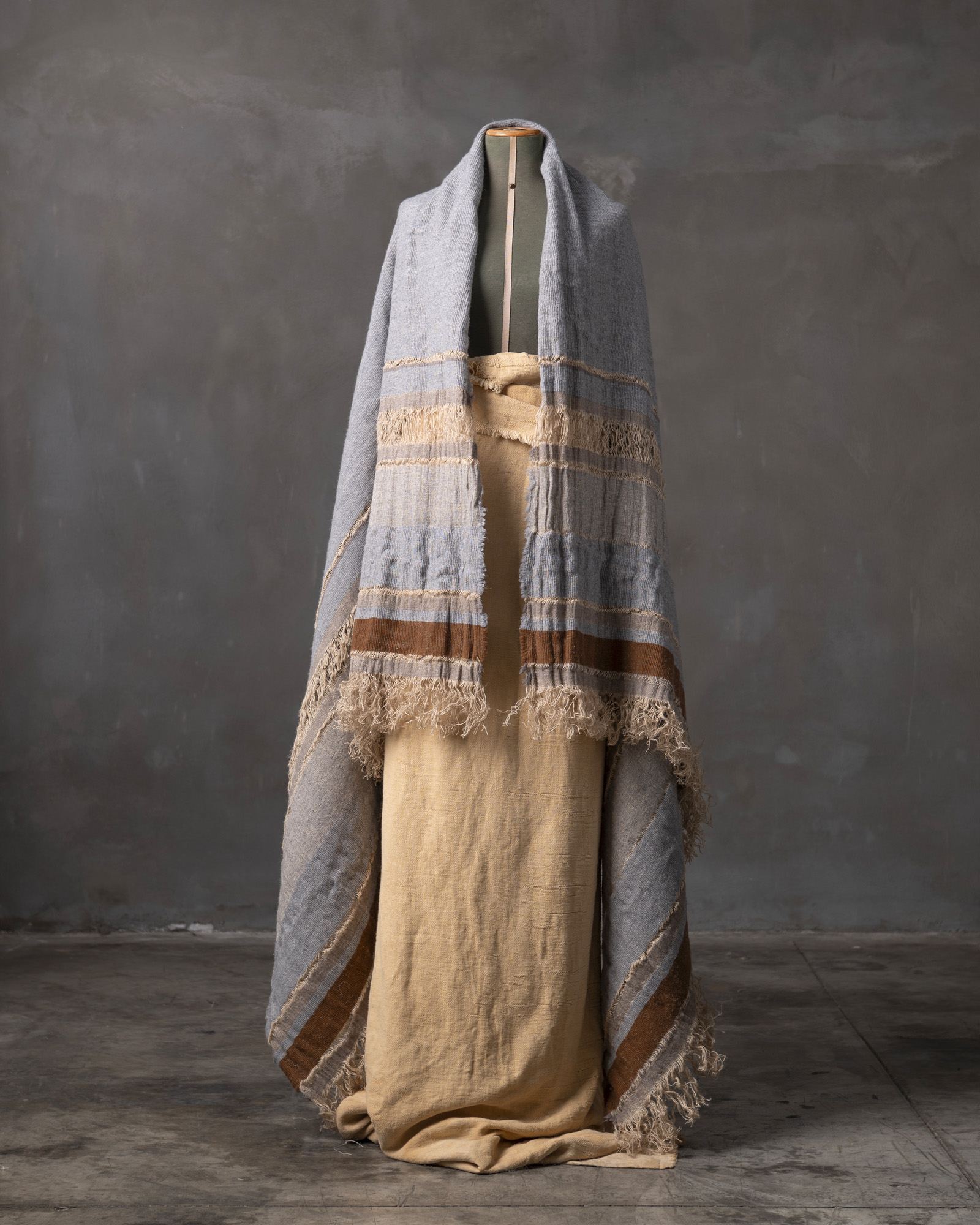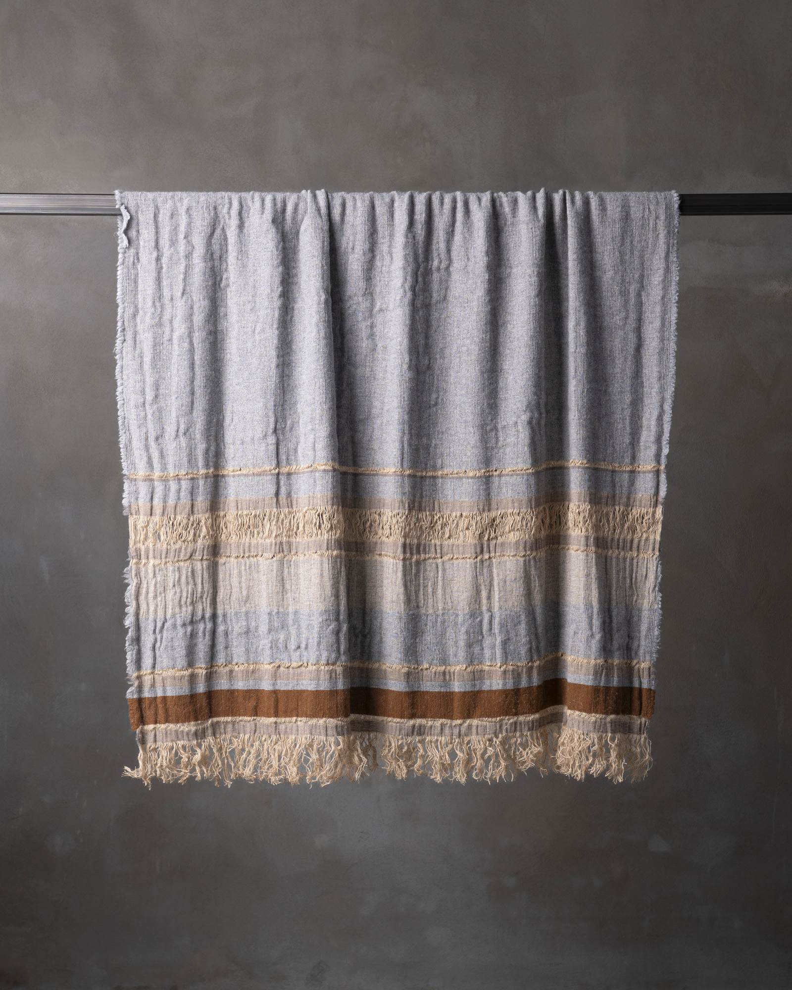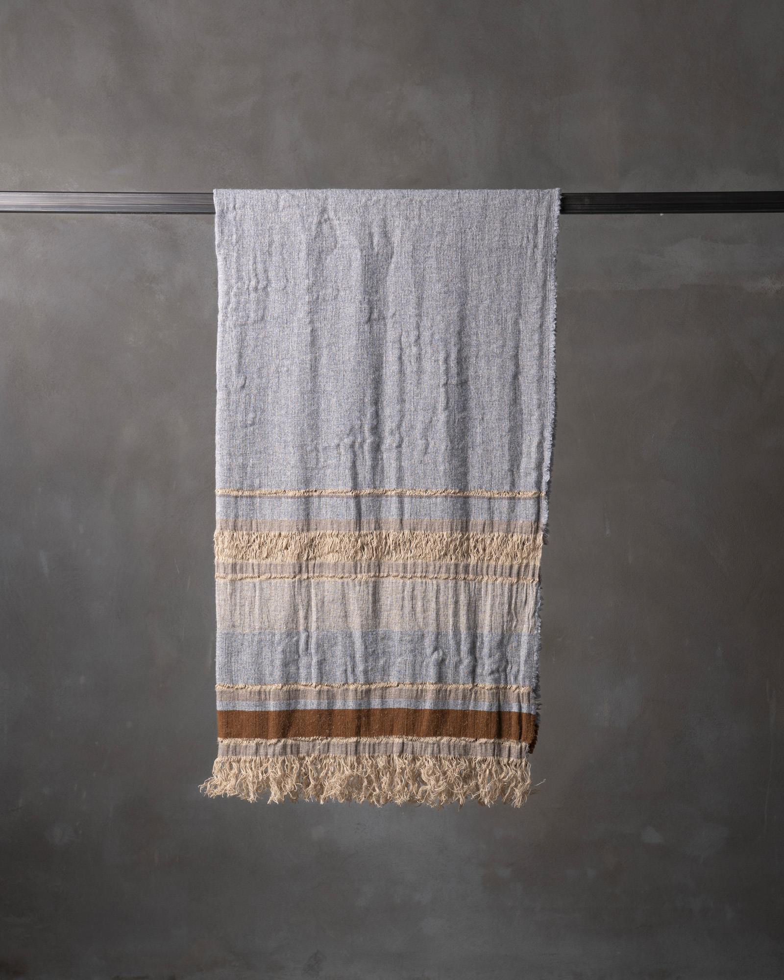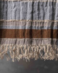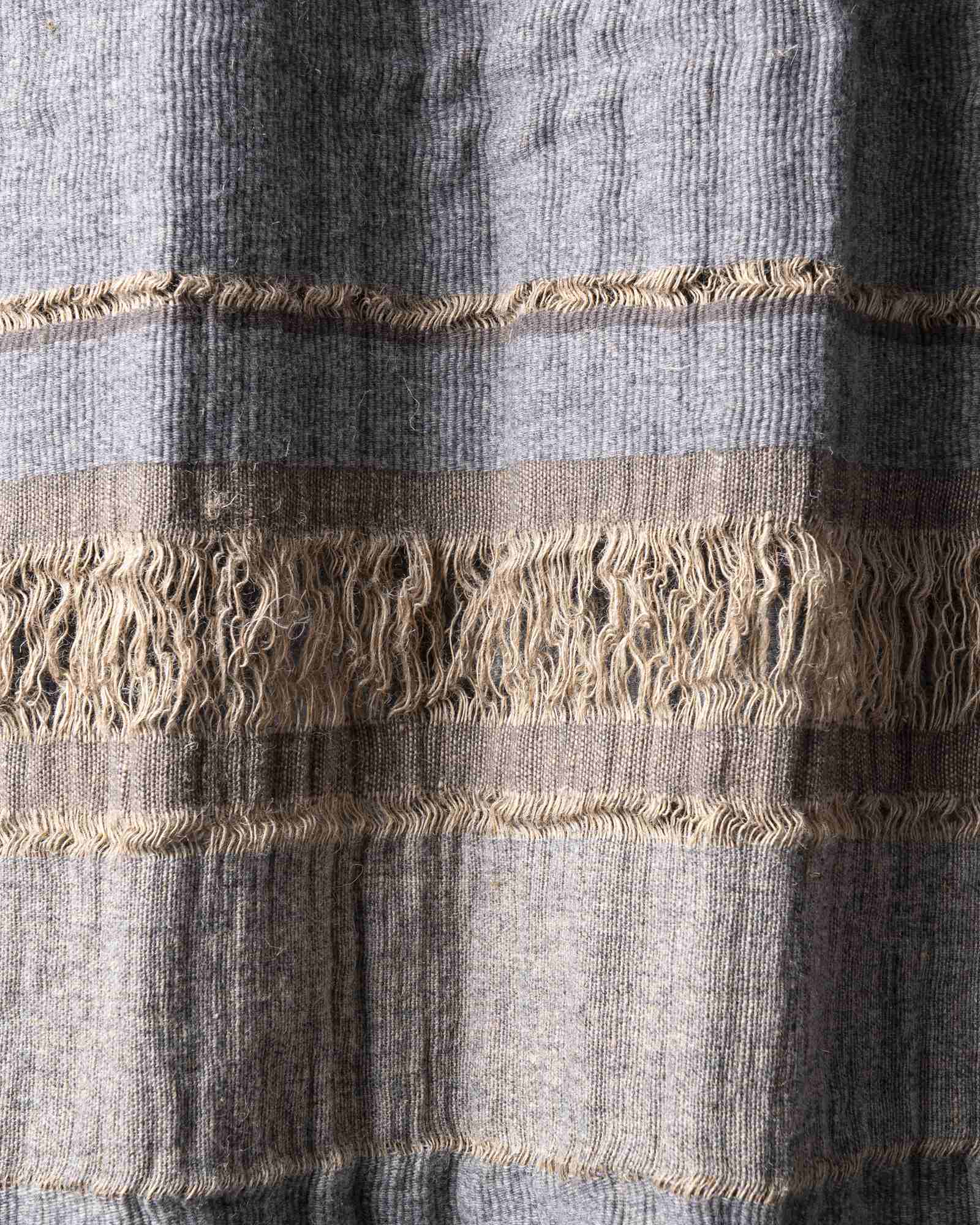 Throw in jute and wool. The structured pattern traverses the surface with decisive rhythm, building a compact material where the fibre alternates character and softness. Marked lines follow one another like essential traces, defining an intense and deeply balanced graphic presence.