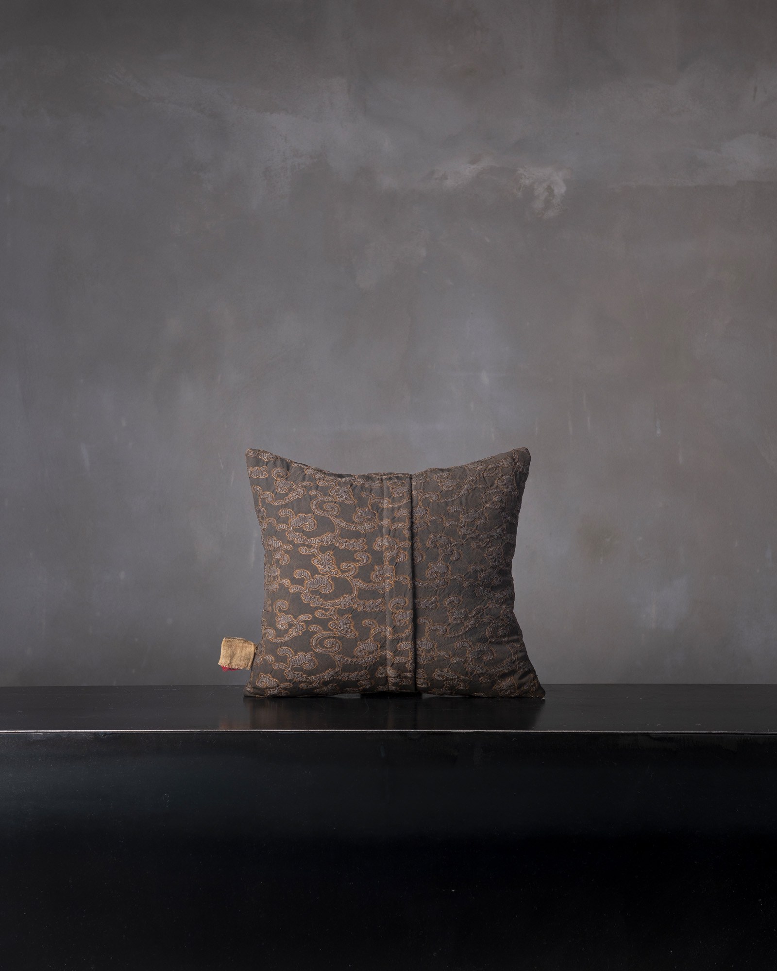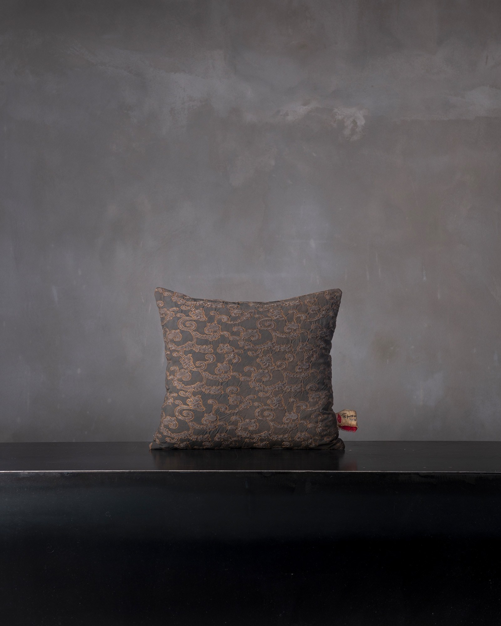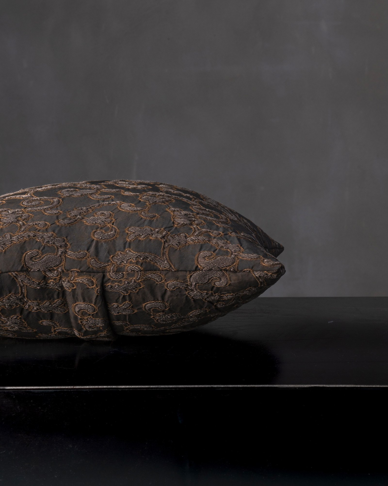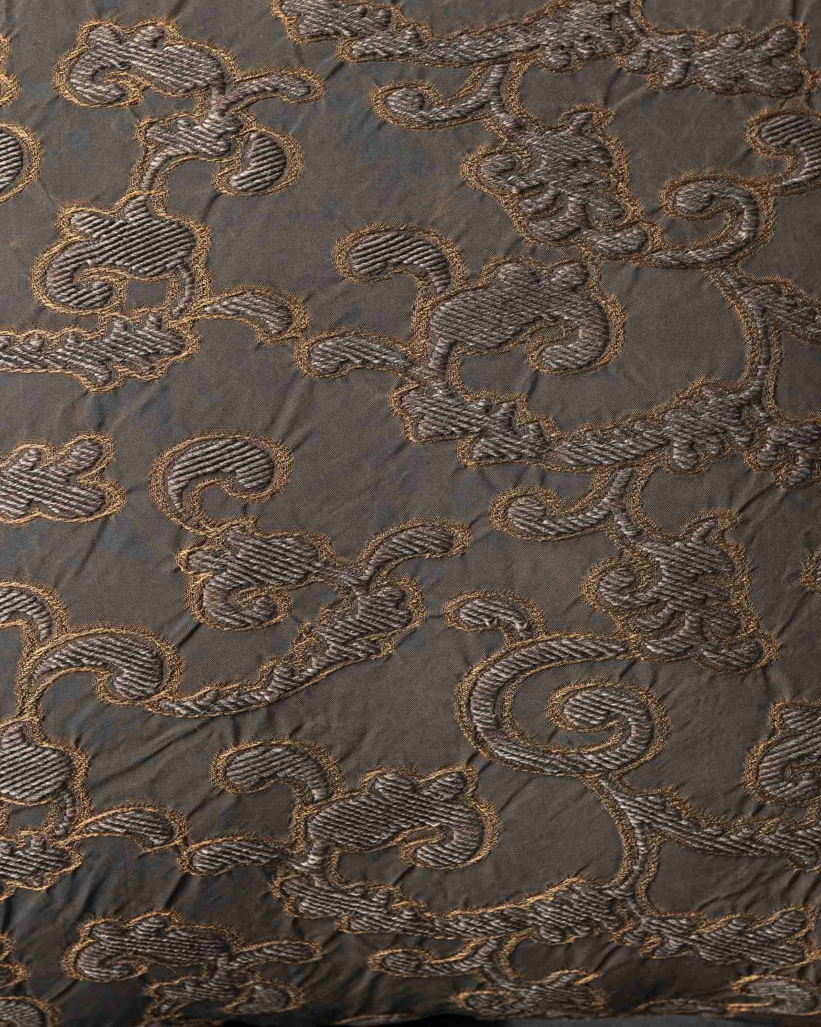 Cuscino decorativo in viscosa. Il disegno jacquard si distende sulla superficie con rilievi delicati, costruendo una materia vibrante e profonda. Un intreccio silenzioso prende forma, come un paesaggio che emerge lentamente tra luce e ombra.