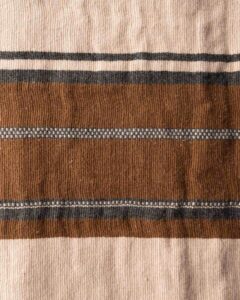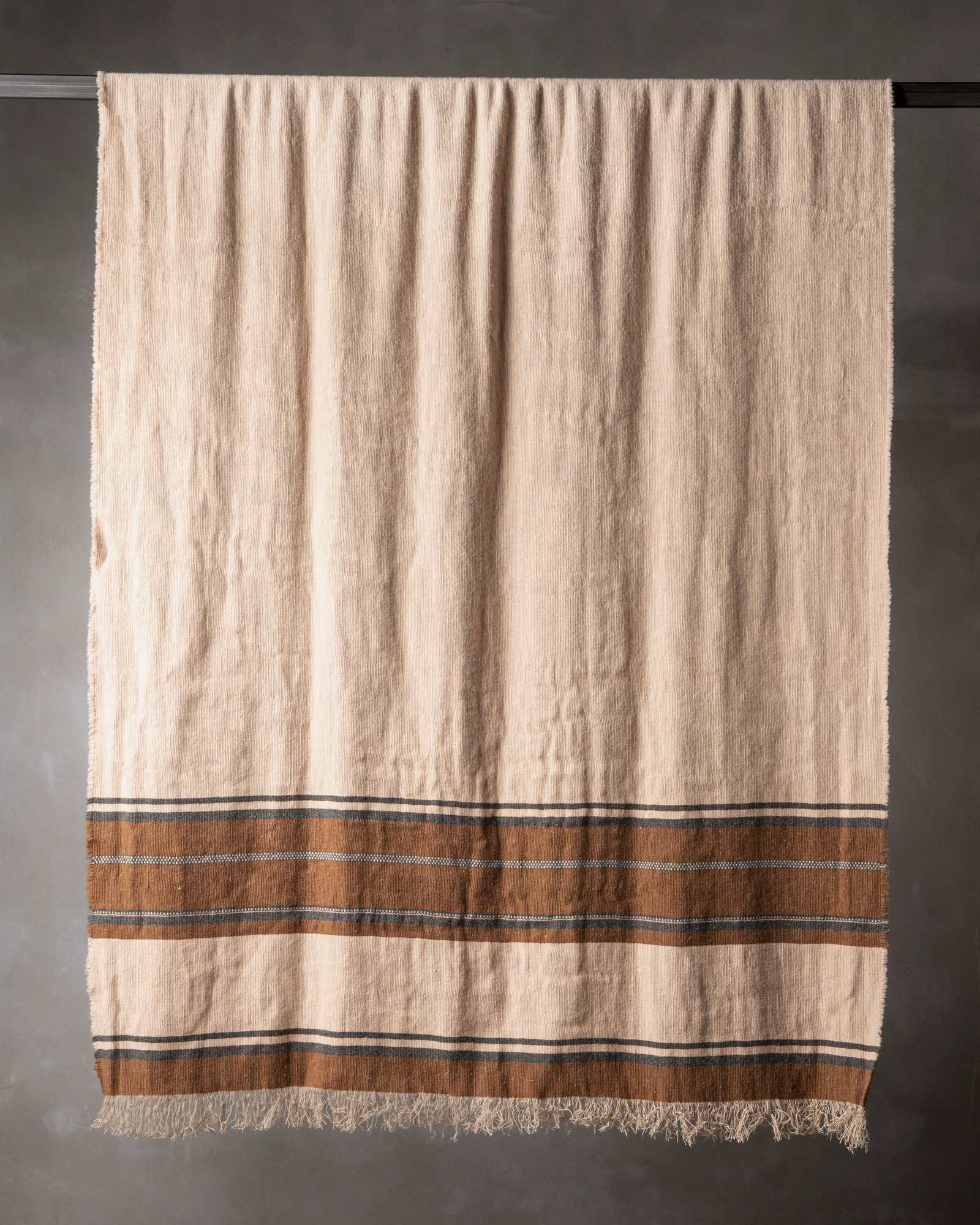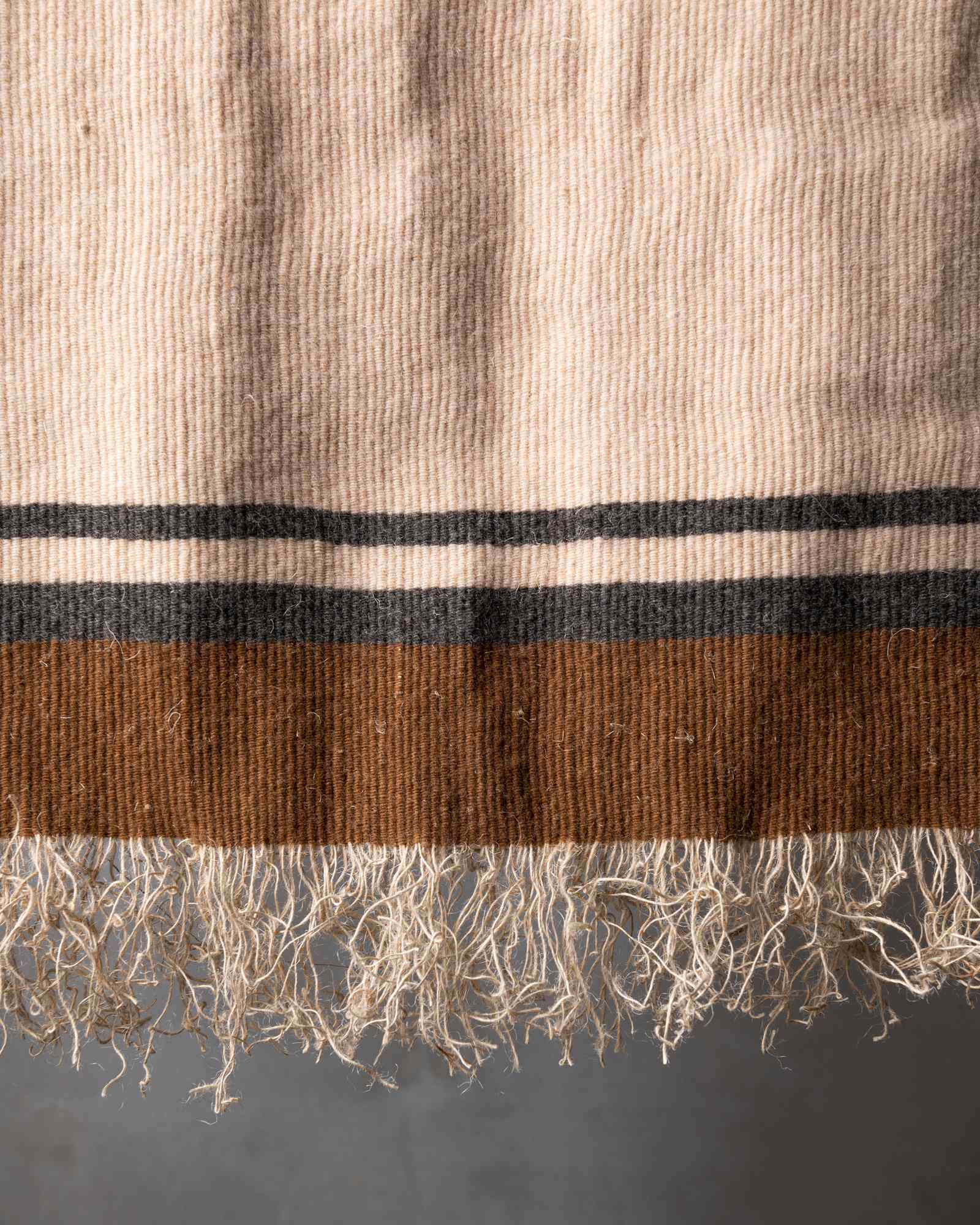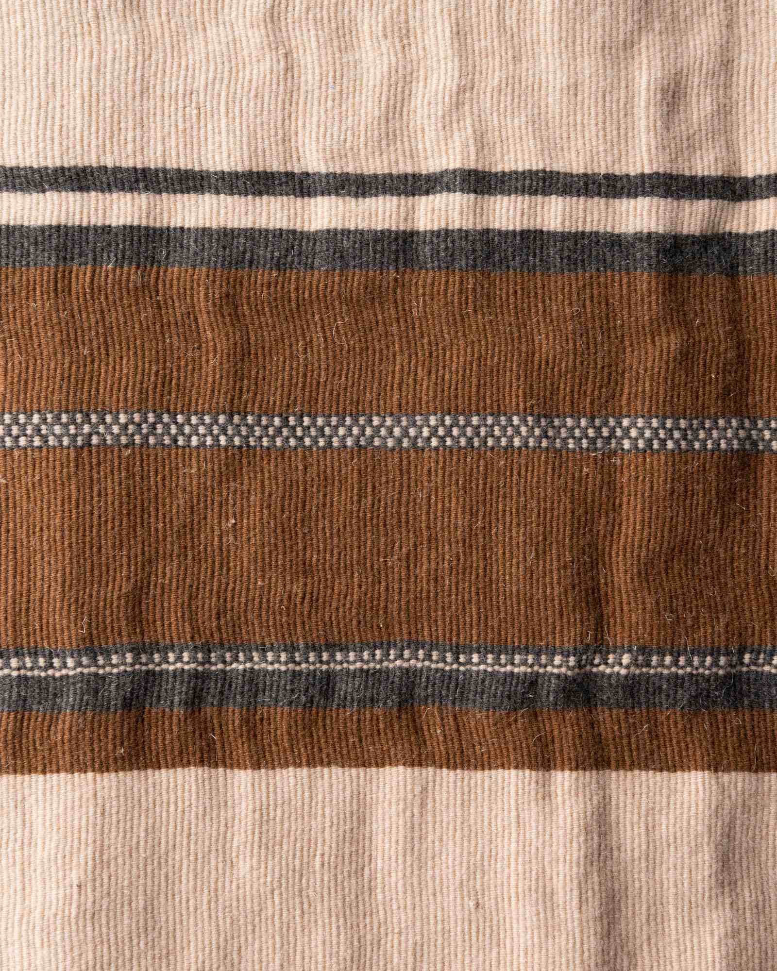 Runner da letto in juta e lana. La superficie si sviluppa con una matericità intensa, dove il motivo strutturato costruisce profondità e ritmo attraverso un intreccio ricco e deciso. Segni essenziali affiorano nella trama, evocando una presenza etnica e primitiva che si esprime con forza e naturale eleganza.