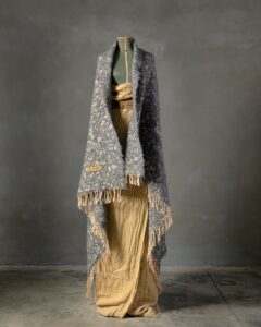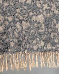 Plaid in lana. La trama ricca si sviluppa con profondità, avvolta da una materia soffice che attenua il disegno e ne rivela solo accenni delicati. Il motivo floreale affiora come un’ombra leggera, lasciando spazio a una presenza calda e silenziosamente avvolgente.
