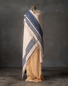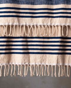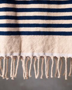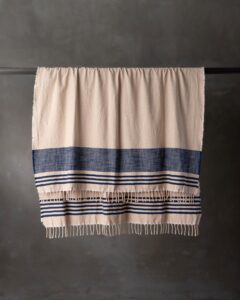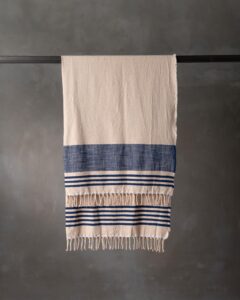 Plaid in cotone. La superficie compatta si sviluppa con equilibrio, attraversata da un disegno rigato che introduce ritmo e leggerezza nella trama. Linee sottili emergono con naturale continuità, come un segno discreto che accompagna lo spazio con una presenza fresca e silenziosa.